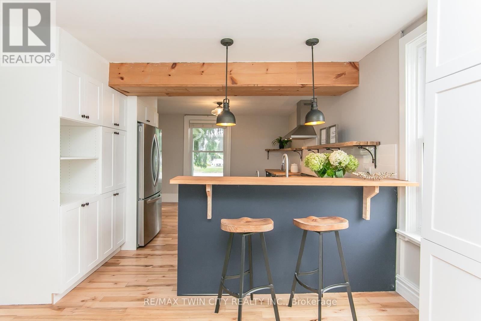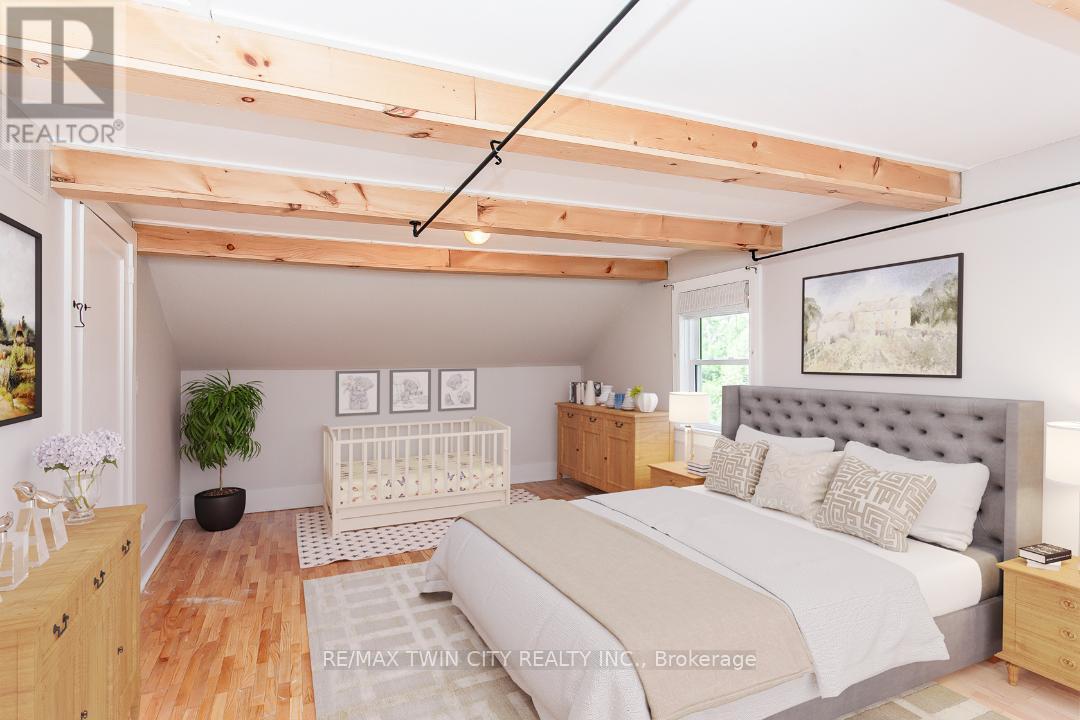 This beautifully restored (easily converted back to 3 bedroom) Farmhouse seamlessly blends timeless character with modern upgrades. Set well off the road, on a generous 2/3 acre lot, the property offers privacy, space & incredible potential - all just minutes from amenities & 401 highway access. The heart of the home is the skillfully renovated kitchen, showcasing rich indigo cabinetry, maple counter tops, new SS appliances, floating shelves, and breakfast bar. With a raised sink and vintage tile, the spacious main floor powder room complements the farmhouse feel. The main living & dining areas showcase classic trim work, large new windows & garden doors that lead to the remodeled covered porch perfect for enjoying tranquil views of mature trees, lilacs, raspberry & mulberry bushes alongside frequent visits from birds & local wildlife. Upstairs, the expansive primary suite offers flexibility keep it as an impressive retreat, add a nursery or creative space, or erect wall to convert home back into a 3 bedroom layout. The breathtaking, spa-inspired bathroom features a freestanding soaker tub, large open walk-in shower, private water closet & ample storage. A conveniently located second floor laundry room comes complete with new appliances (a 2nd set in bsmt!) & a tub/shower combo for everyday conveniences. Step out onto the upper balcony to enjoy views of the park & nearby trails. Hardwood floors throughout and lighting fixtures thoughtfully chosen to complement the rustic charm. Freshly painted from trim to ceiling, this home is move-in ready! The expansive lot offers room to dream consider adding a pool, workshop, or exploring the possibility of a secondary dwelling unit, with ample parking for 4+ vehicles & a detached garage. Ideally located across from the community center (with pool!) and no back neighbours! This is more than a home its a lifestyle! Come experience the perfect blend of City conveniences & country charm. Dont miss the chance to make it yours! (id:4555)