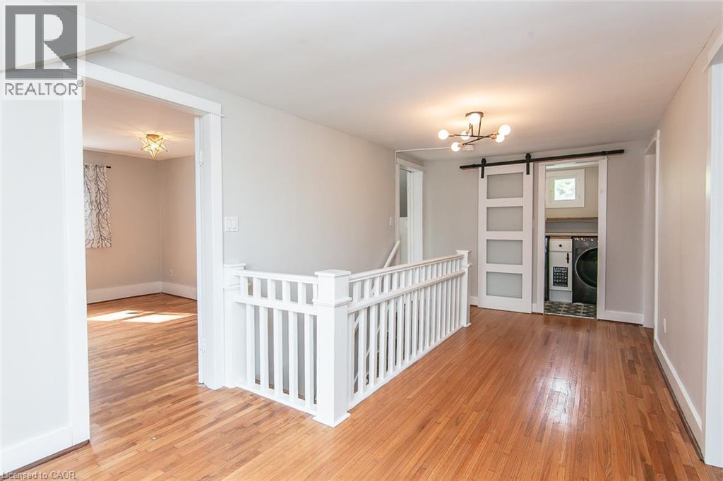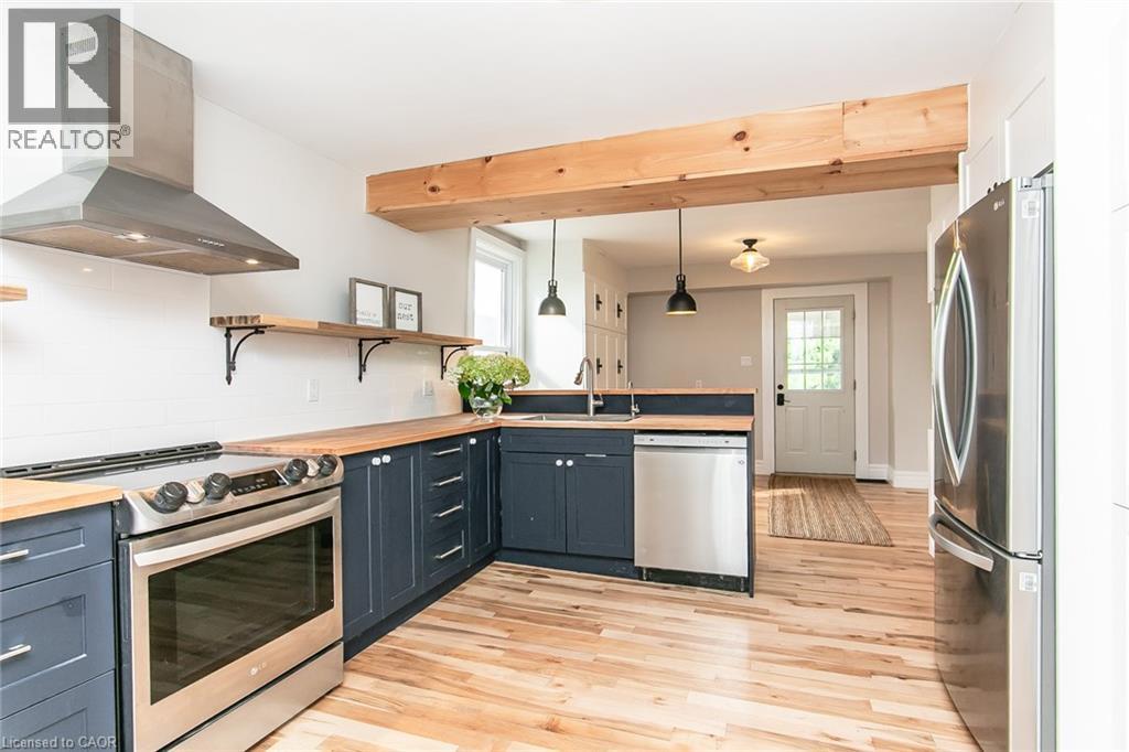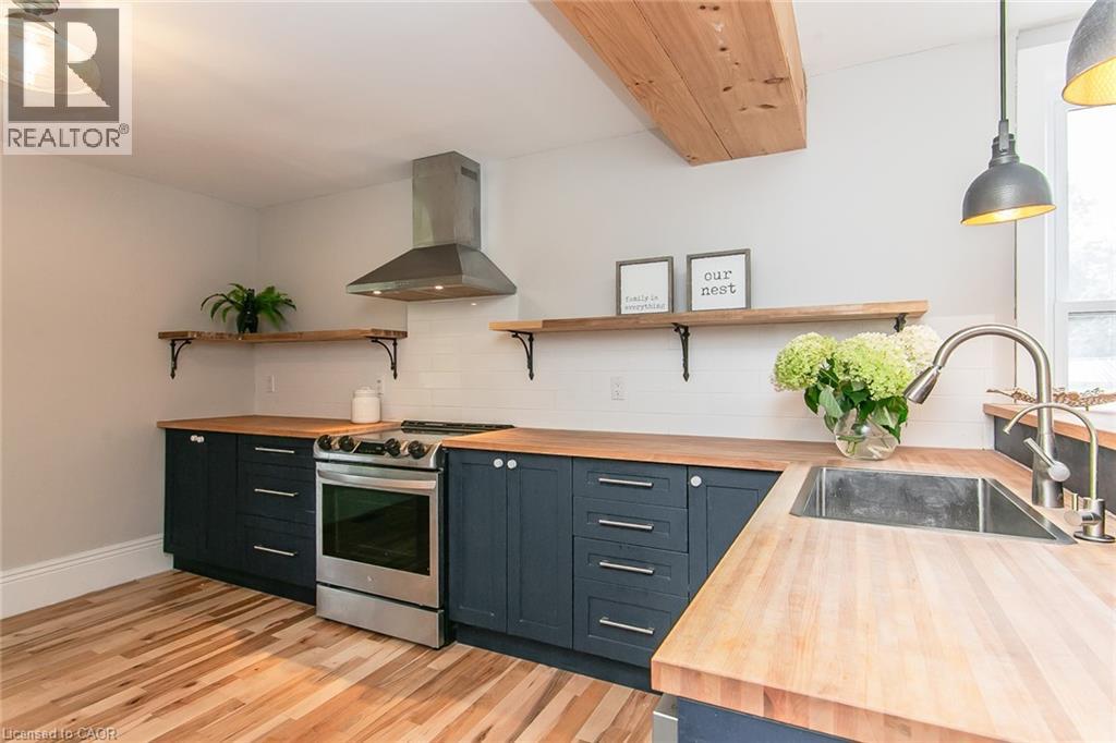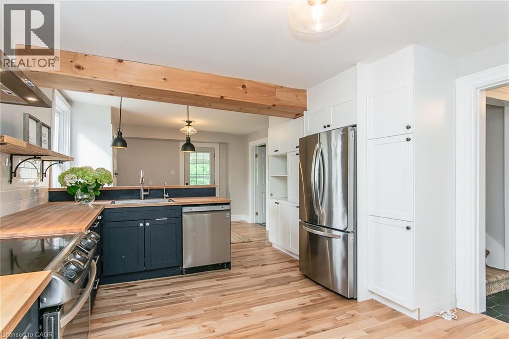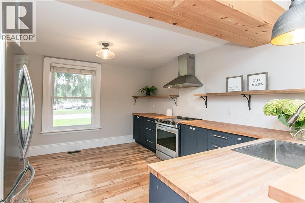 This beautifully restored 3 bedroom farmhouse seamlessly blends timeless character with modern upgrades. Set well off the road, on a generous 2/3 acre lot, the property offers privacy, space & incredible potential - all just minutes from amenities & 401 highway access. The heart of the home is the skillfully renovated kitchen, showcasing rich indigo cabinetry, maple counter tops, new SS appliances, floating shelves, and breakfast bar. With a raised sink and vintage tile, the spacious main floor powder room complements the farmhouse feel. The main living & dining areas showcase classic trim work, large new windows & garden doors that lead to the remodelled covered porch perfect for enjoying tranquil views of mature trees, lilacs, raspberry & mulberry bushes alongside frequent visits from birds & local wildlife. Upstairs offers a primary suite, 2 additional bedrooms and a breathtaking, spa-inspired bathroom featuring a freestanding soaker tub, large open walk-in shower, private water closet & ample storage. A conveniently located second floor laundry room comes complete with new appliances (a 2nd set in bsmt!) & a tub/shower combo for everyday conveniences. Step out onto the upper balcony to enjoy views of the park & nearby trails. Hardwood floors throughout and lighting fixtures thoughtfully chosen to complement the rustic charm. Freshly painted from trim to ceiling, this home is move-in ready! The expansive lot offers room to dream! Consider adding a pool, workshop, or exploring the possibility of a secondary dwelling unit, with ample parking for 4+ vehicles & a detached garage. Ideally located across from the community center, with pool, and no back neighbours! This is more than a home, it's a lifestyle! Come experience the perfect blend of City conveniences & country charm. Don't miss the chance to make it yours! (41343799) (id:4555)