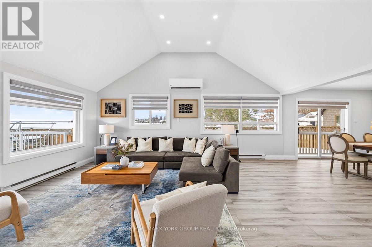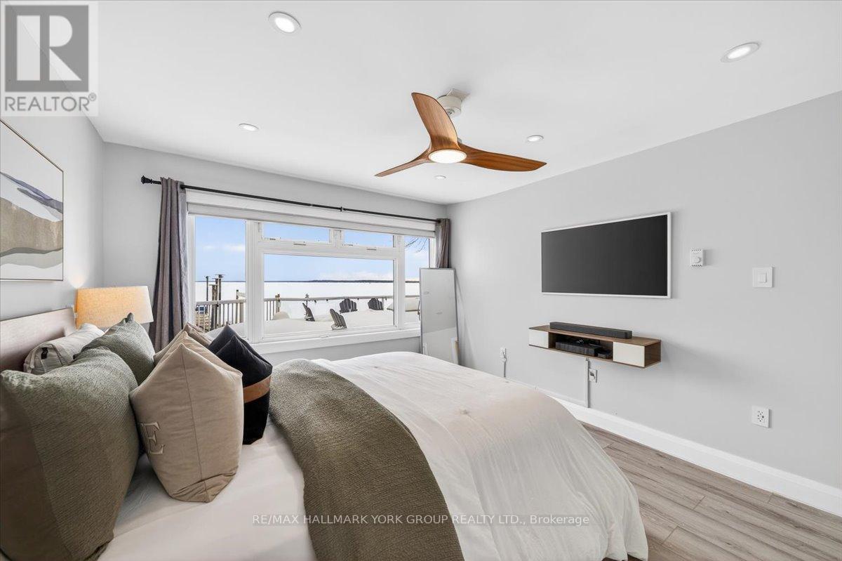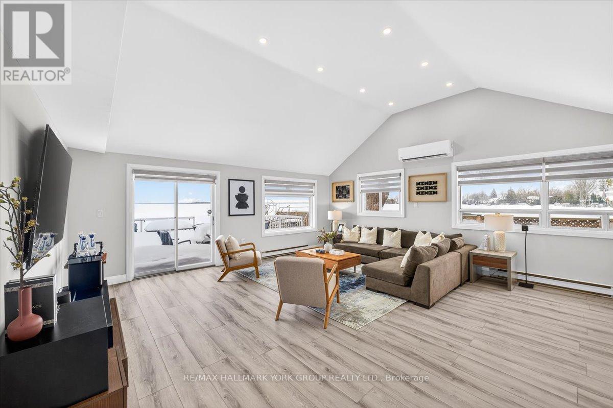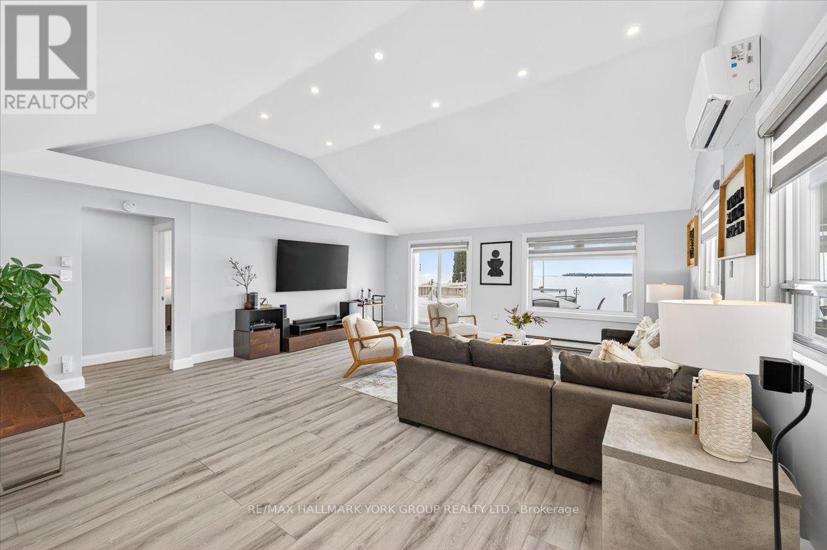 Wake up every morning to breathtaking sunrises and sweeping panoramic views over Lake Simcoe. Set along one of Innisfil's most sought-after stretches of sandy shoreline, this beautifully renovated 4-season waterfront bungalow offers 53.59 feet of rare, natural waterfront and the ultimate turnkey lake lifestyle. Blending timeless charm with modern efficiency, this home features over 2,100 sq ft of open-concept living with vaulted ceilings and expansive windows that frame the lake from multiple angles. Thoughtfully upgraded throughout with new vinyl floors, pot lights, spray foam insulation for enhanced efficiency, concrete subfloors, and a heat pump system in the living room. Baseboard electric heating with smart thermostats ensures comfort and control in every season. The redesigned kitchen combines style and function with WiFi-enabled smart appliances, including a gas stove. Additional upgrades include a gas tankless water heater, water softener, reverse osmosis system, security cameras, and remote-controlled blinds in the front bedroom - truly move-in ready inside and out. Step outside and embrace waterfront living at its finest. A spacious remodeled deck with aluminum and glass railings overlooks the water, while the backyard firepit creates the perfect setting for summer evenings under the stars. At the shoreline, enjoy a 30-ft dock, a 15x10 lakeside seating area, plus a boat lift and 3 jet ski lifts, designed for effortless days on the lake. Out front, a detached garage with a Tesla charging station, upgraded interlock walkway, and ample parking add convenience and curb appeal. Whether you're boating, entertaining, or simply enjoying the peaceful rhythm of the water, this move-in ready lakefront retreat delivers comfort, style, and year-round recreation on one of Lake Simcoe's most desirable sandy shorelines. (id:4555)