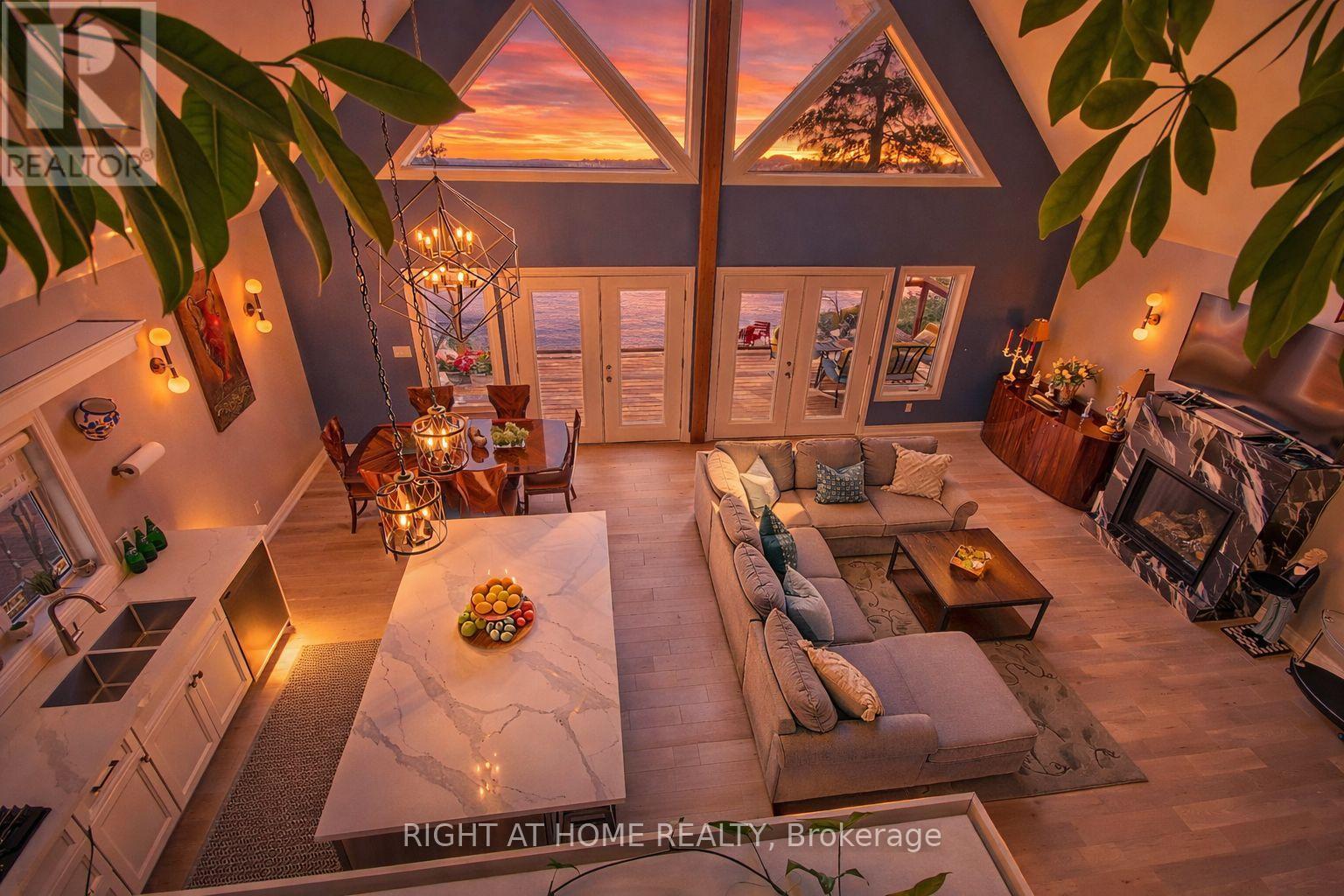 Experience exceptional year-round waterfront living on Lake Scugog in this custom-built home, ideally located in the heart of Kawartha Lakes and connected to the Trent-Severn Waterway. Offering over 2,700 sq ft of beautifully finished living space, this four-season property is perfect for retirees, families, or buyers seeking strong investment and rental potential-just 1.5 hours from Toronto. The home showcases a bright, open-concept design with soaring vaulted ceilings, exposed beams, engineered hardwood floors, and expansive windows capturing breathtaking lake views. The great room features a cozy propane fireplace and walkout to a spacious cedar deck-ideal for entertaining or enjoying peaceful waterfront mornings. The modern kitchen is thoughtfully designed with a large granite island, built-in appliances, beverage and wine fridges, designer lighting, and elegant finishes throughout. Two generous main-floor bedrooms provide convenient one-level living, while the private loft-style primary suite offers a serene retreat with panoramic lake views, vaulted ceilings, a sitting area, and a spa-inspired ensuite complete with glass shower and soaker tub. The fully finished walkout basement expands the living space with a large recreation room, kitchenette with island, additional bedroom, 3-piece bath, and direct access to a stone patio and lakeside yard-perfect for extended family, guests, or income-generating rental use Enjoy boating, fishing, swimming, skating, and snowmobiling right from your property. Walking distance to Sand Bar Beach and a public boat launch, and just minutes to Port Perry and Lindsay for shopping, dining, and healthcare. A rare opportunity offering waterfront living, year-round enjoyment, and excellent investment potential. (id:4555)