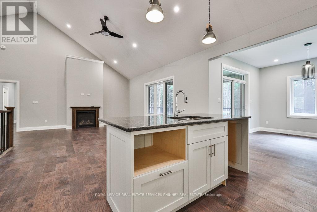 Fabulous Opportunity in Black Bear Estates Welcome to this brand-new bungalow in the highly sought-after Black Bear Estates of Fenelon Falls. Set on a private 1.3-acre lot backing onto tranquil woodland, this home also offers deeded access to Black Bear Lagoon on the Burnt River-perfect for enjoying the renowned Trent-Severn Waterway.Thoughtfully designed for modern living, the open-concept main level showcases 9-foot ceilings and soaring vaulted heights, enhanced by abundant pot lighting and rich engineered hardwood flooring. The great room features a cozy propane fireplace, while the dining area walks out to a large, partially covered deck-ideal for entertaining or relaxing in nature.The kitchen boasts granite countertops, a centre island with breakfast bar, soft-close cabinetry, and a stainless-steel sink. The main level also includes an office area, a primary bedroom with walk-in closet and 4-piece ensuite with large glass shower, a second bedroom, a full bathroom,and a convenient laundry room with direct access to the oversized double car garage.The fully finished lower level extends the living space and features a recreation room with second fireplace, 2 additional rooms and a full bathroom. Enjoy summer days exploring the Burnt River and the Trent-Severn Waterway. Located just minutes from Fenelon Falls-known as the "Jewel of the Kawarthas"-you are also close to the Victoria Rail Trail and the Ganaraska Trail, offering over 500 km of trails for year-round outdoor activities.With easy access to Highway 35, this exceptional property offers the perfect balance of luxury,lifestyle, and convenience.Virtually staged. A must-see-well worth the drive. (id:4555)