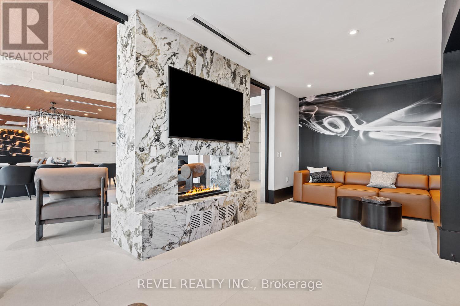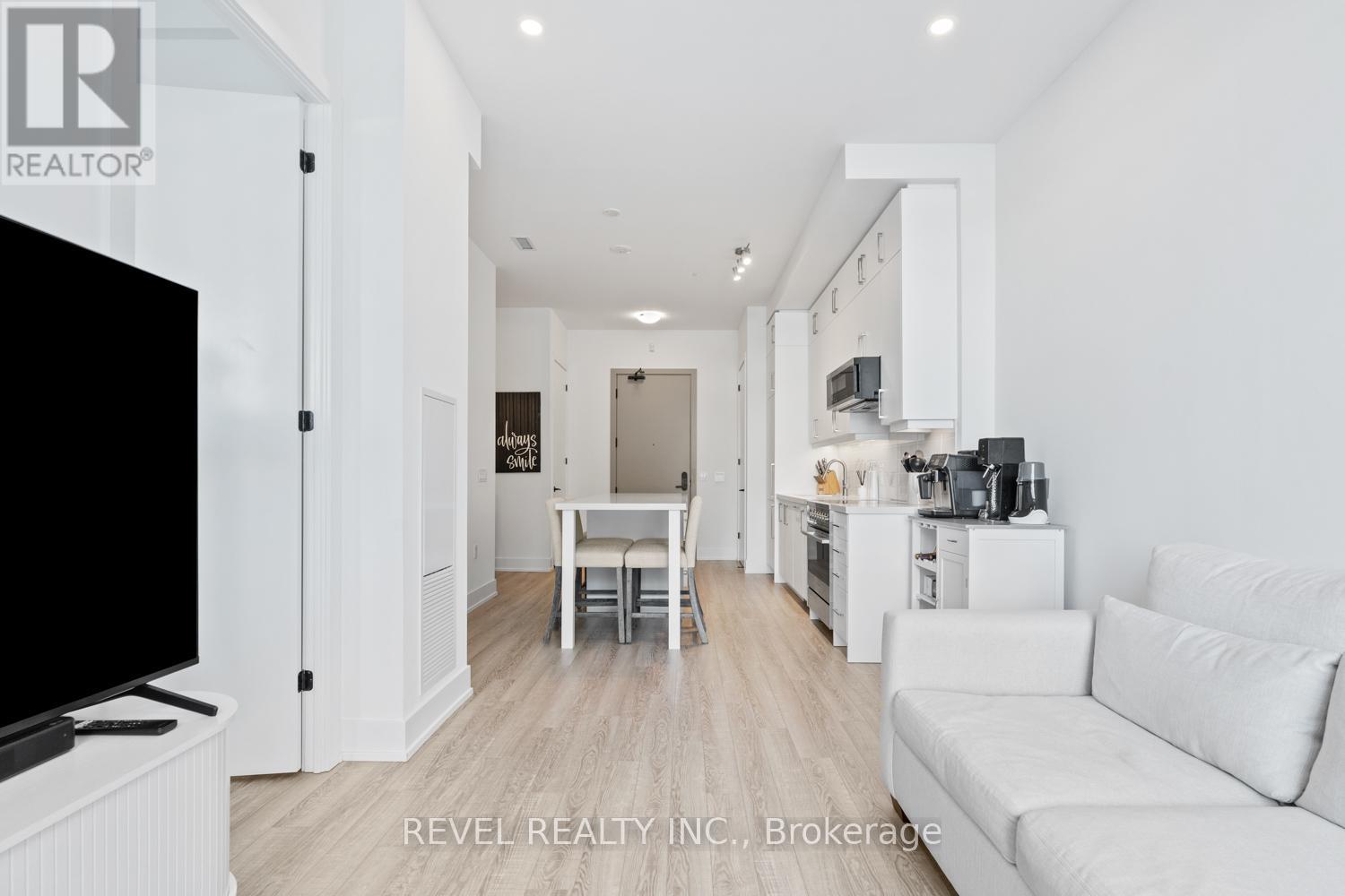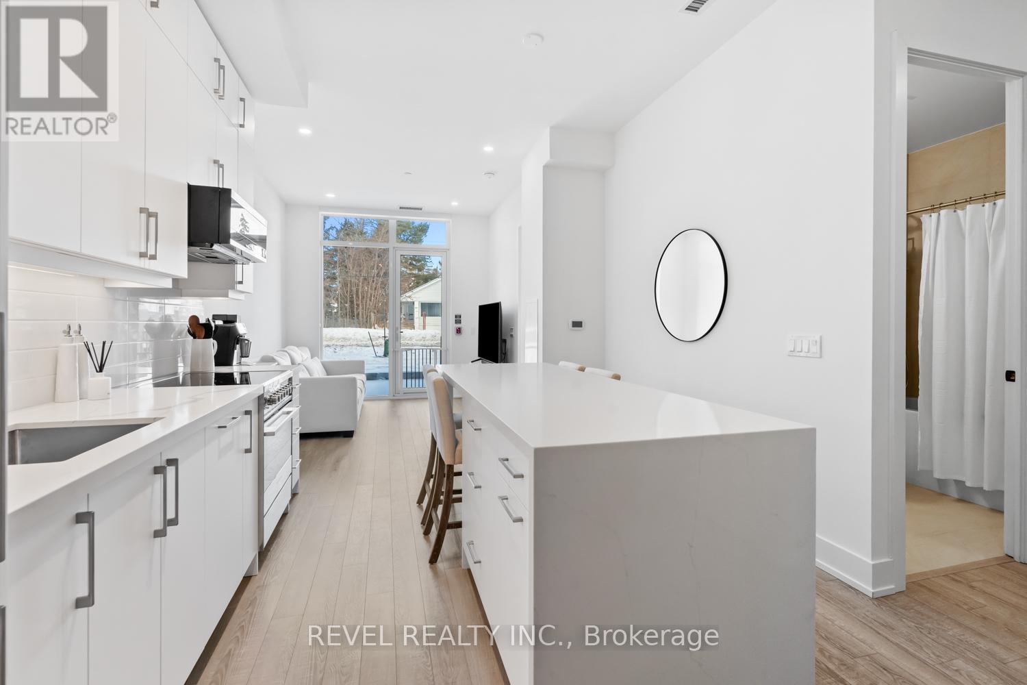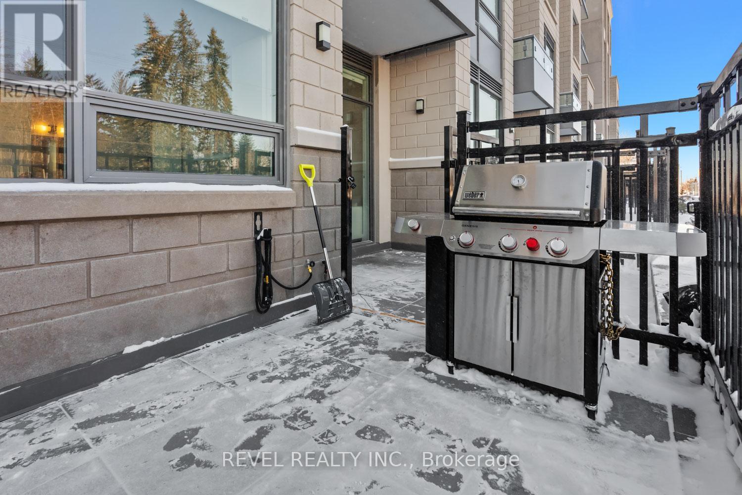 Welcome to Suite 123, a beautifully designed 667 sq. ft. unit + private outdoor patio. A residence that blends modern comfort with upscale, custom finishes. Featuring 10-foot ceilings and floor-to-ceiling windows in the living area, this home is filled with natural light and offers an airy, sophisticated atmosphere.The open-concept kitchen has been fully upgraded, showcasing custom cabinetry extended to the ceiling, integrated appliances with full size stove and microwave , and a stunning custom quartz countertop island with seating for up to 10-perfect for entertaining, hosting, or everyday living. Thoughtfully designed custom closets throughout elevate both function and style. A spacious den offers versatility as a home office or guest space, while two full bathrooms provide added convenience and privacy. Step outside from your private ground floor entrance to your walk-out terrace, complete with a dedicated gas line for bbq and water bib, creating an ideal setting for outdoor dining, entertaining, or relaxing evenings at home. Residents of King Terraces enjoy access to a curated collection of amenities, including a resort-style pool, sauna, steam room, rooftop terrace, fitness centre, elegant party lounge, and 24-hour concierge service. Suite 123 is where luxury design meets everyday ease-a rare ground-floor retreat with exceptional upgrades and seamless indoor-outdoor living. (id:4555)