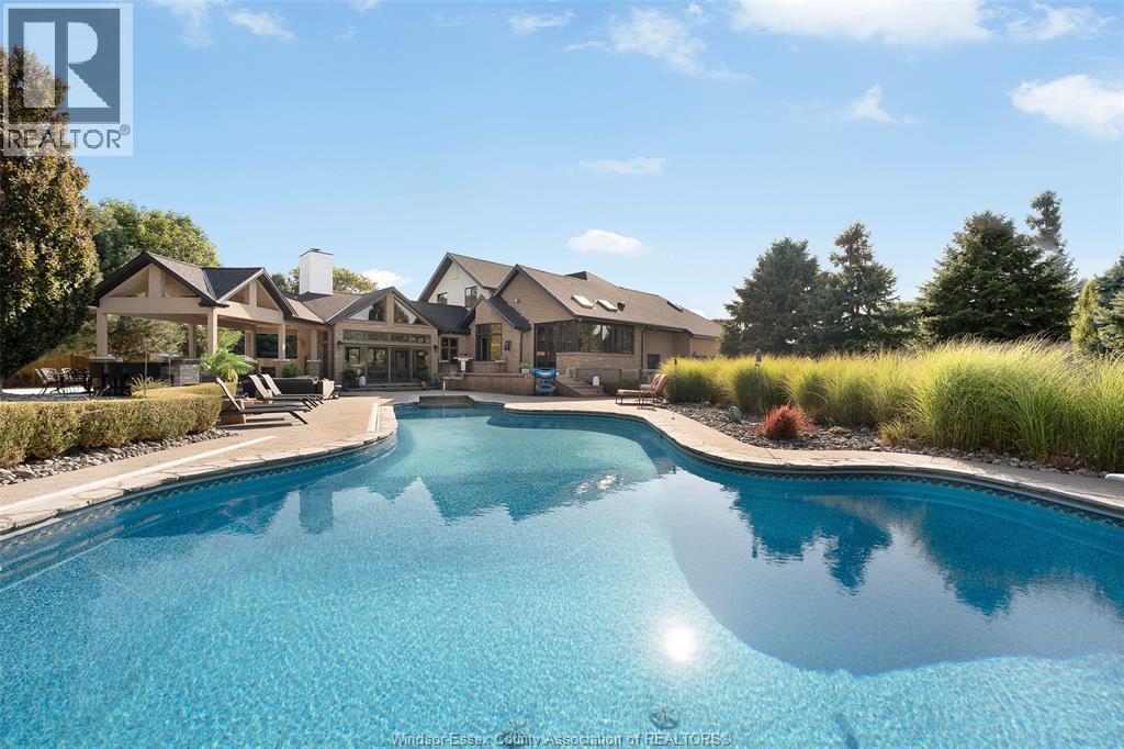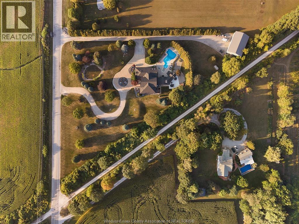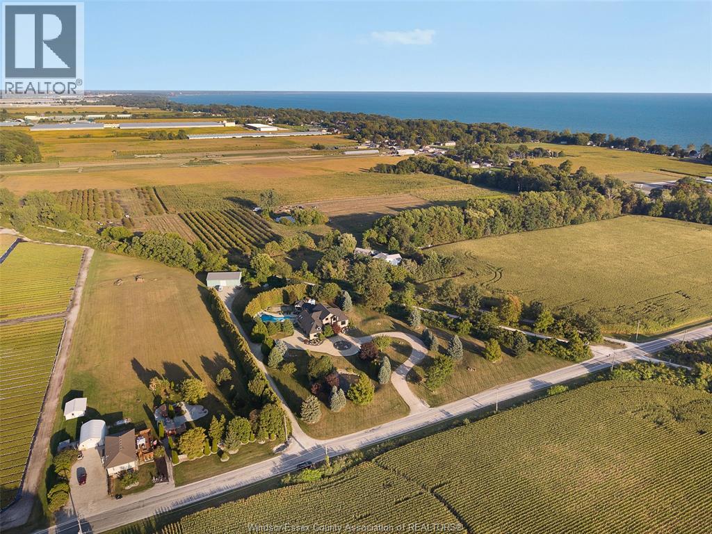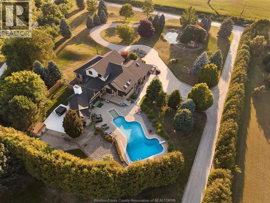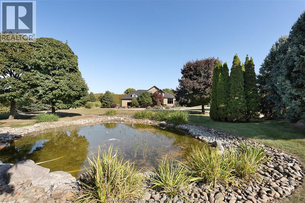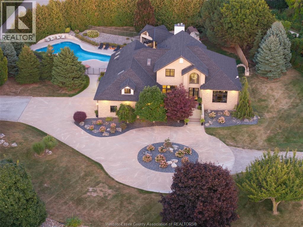 A rare offering — this exquisite custom-built estate with approx 7,500 sq ft is perfectly set on 3+acres of manicured grounds just minutes from charming downtown Kingsville. Every detail is designed for elevated living and effortless entertaining. It features 5 bedrooms, 4.5 baths, 7 fireplaces, soaring 10 ft ceilings, and a stunning full walkout lower level opening to an English sunken garden. This home is complemented with an in-law suite and premium finishes throughout. This smart home has an integrated sound system, automated blinds, and heated floors. Relax in your private retreat with the inground pool, hot tub, and covered lanai, cozy up by the natural fireplace. The tranquil pond and private island offers hammock time or camping for the kids. Chef’s dream kitchen with 14ft Cambria island, walk- in pantry, professional appliances and a dumb-waiter for serving in the lower level. It is flooded with natural light and anchors the home. Primary bedroom features a walk-in closet and a bank of custom cabinetry, en-suite bath and Juliette balcony overlooking mature trees. 3 bedrooms grace the upper floor and lead to the separate in-law suite with lounge and kitchenette area with dedicated entrance. The heated pole barn with separate drive completes this truly exceptional property — a rare fusion of luxury, lifestyle, and location. (id:4555)
