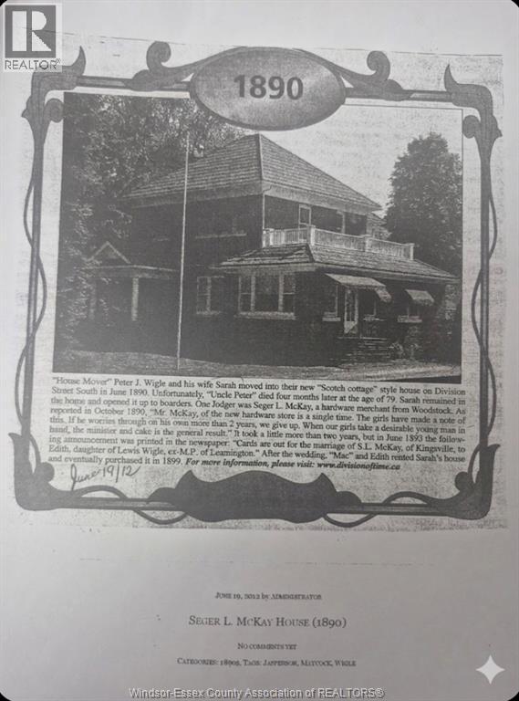 Lovingly maintained by the same family for over 50 years, this 1890 ""Scotch Cottage"" style estate offers a rare blend of historic charm and modern potential. Situated on a sprawling 0.5+ acre lot on a prestigious tree-lined street, this full-brick residence is just steps from downtown Kingsville and the shores of Lake Erie. The home features a steel roof, classic hardwood (under carpet) and ceramic flooring. Outside, the perennial gardens and courtyard are shaded by mature trees, creating a private sanctuary. A professionally built detached cottage in the backyard offers the perfect footprint for a creative studio or ""she-shed."" Currently configured as a duplex with separate entrances, this versatile property can easily serve as a grand single-family home, a multi-generational ""granny flat,"" or a lucrative B&B. While the kitchen and baths await your personal touch, they beautifully preserve the character of the era. All measurements are approximate. (id:4555)