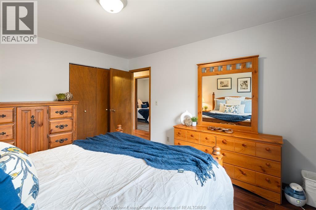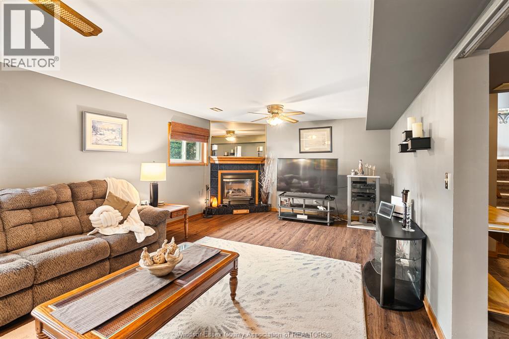 Meticulously maintained raised ranch in Kingsville, Ontario — 3 bedrooms, 2 bathrooms, and a layout built for both everyday living and serious entertaining. Located steps from downtown Kingsville's restaurants, shopping, and schools, this property delivers the full package: a renovated kitchen, a finished lower level, and a backyard that genuinely sets this home apart. The updated kitchen features white shaker cabinetry, quartz countertops, a centre island, tile backsplash, stainless steel appliances, and a Maytag refrigerator — bright, functional, and finished to a high standard. The main level living room offers hardwood floors, a ceiling fan, and an open connection to the formal dining room with chandelier and hardwood throughout. Three bedrooms on the main floor include a spacious primary bedroom with rich hardwood flooring. The updated main bathroom features a modern white vanity with quartz countertop and chrome fixtures.Downstairs, the finished lower level adds a second family room with a gas fireplace, a 3-piece bathroom with granite countertop vanity, and a separate egress door — a layout with real potential for an in-law suite or accessory unit down the road. The laundry/utility room is generously sized with upper cabinetry and extra storage. Step outside and the yard earns its reputation. The concrete patio features a custom pergola with a live-edge bar top, multiple seating areas, mature privacy trees on two sides — no rear neighbours and no side neighbour on one side — plus an oversized shed. The big-ticket items are done: new roof 2024, gutter guards 2019, furnace and central air 2016, and owned hot water heater — nothing left to worry about for years to come. Single-car garage, concrete driveway. This is a pride-of-ownership home in one of Kingsville's most walkable neighbourhoods. (id:4555)