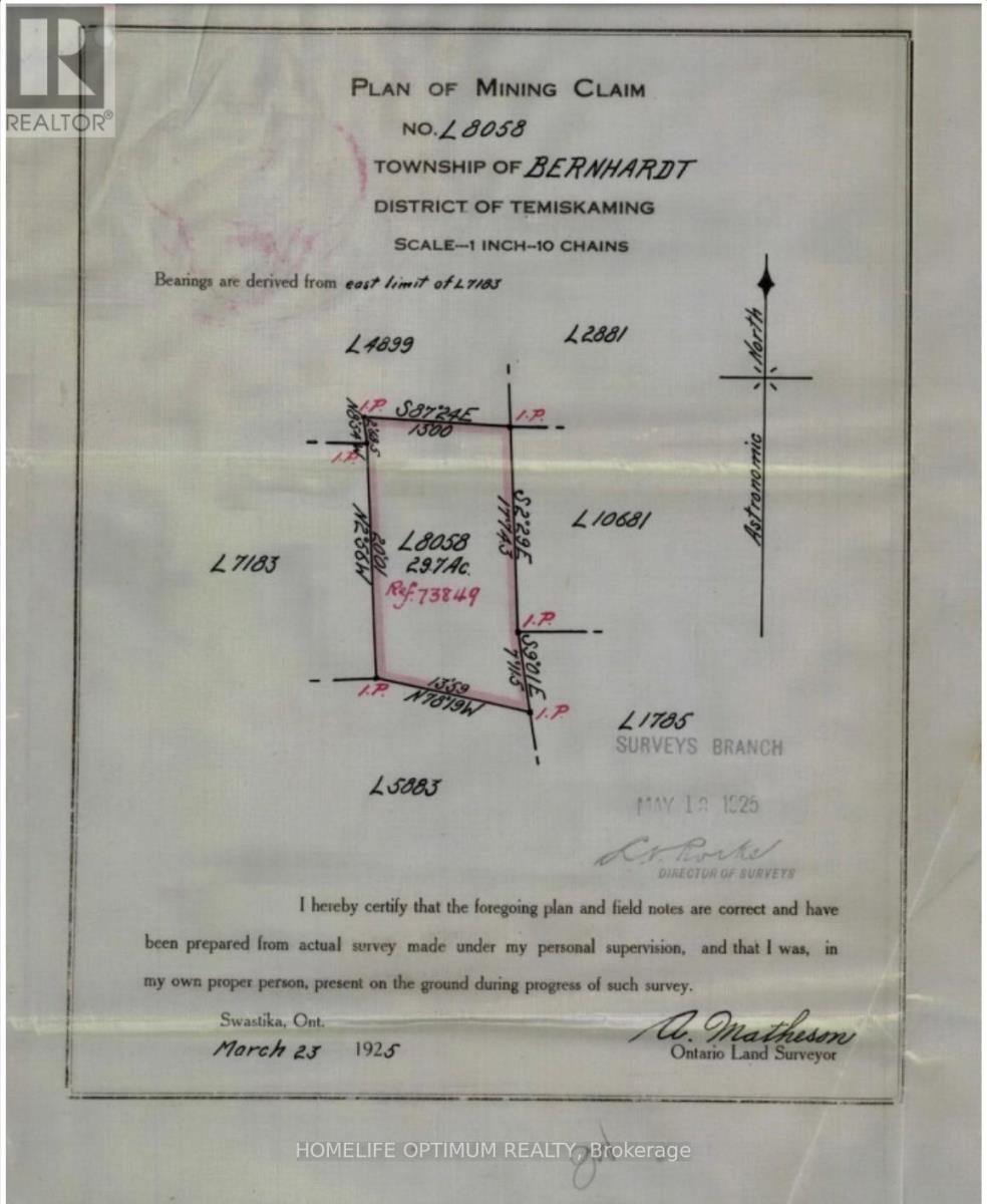 This property is located in BERNHARDT TOWNSHIP in the District of Timiskaming in NORTHEASTERN ONTARIO.Bernhardt Township is due north of the Town of Kirkland Lake.You are still quite close to town yet it seems like you are in the middle of nowhere.The property is midway between Goodfish Lake to the east and Greylava Lake to the west.Total distance from this property to The Town Of Kirkland Lake is 6.5 kilometers. Spring, Summer and Fall in northeastern Ontario are the best.Fresh air, lots of sun and long, lazy days.Especially in summer months when there is daylight up to almost 10 at night.Absolutely perfect for getting out and exploring the great outdoors.In August you should be able to see the NORTHERN LIGHTS on those clear nights. There is no access to electrical power here but you can certainly be off the grid and on solar power.If you build a cabin you can choose from wiring a cabin for a generator or for solar power or for wind power or a combination of all or some of these.You can also have propane lights and propane stove and fridge.We are told that the cell service is quite good on this property. (id:4555)