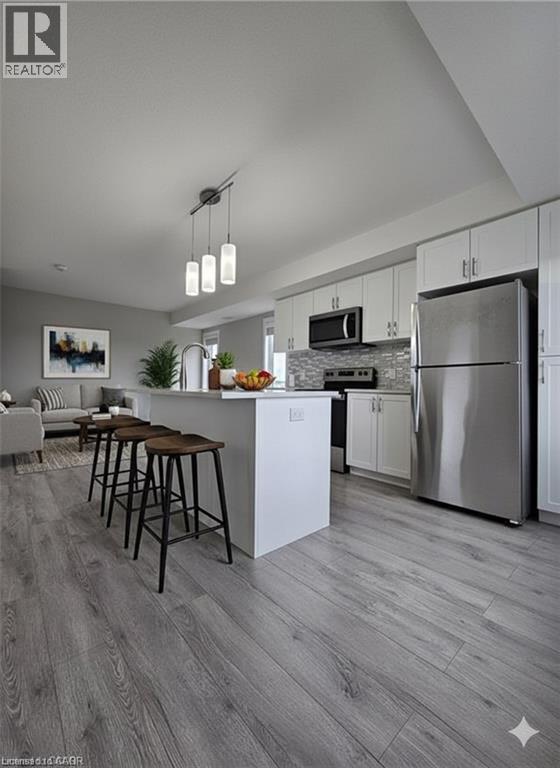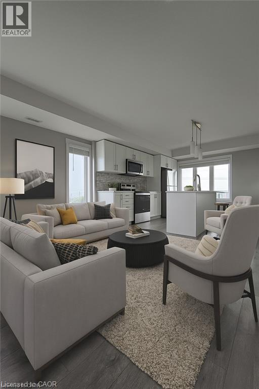 AVAILABILITY DECEMBER 1ST this modern 3-bedroom, 1.5-bath stacked townhouse located in Kitchener’s desirable Huron Park community. This bright, carpet-free (except stairs) home offers 1220 sq. ft. of open-concept living space, featuring a spacious living area and a stylish kitchen with quartz countertops, contemporary backsplash, plenty of cabinets, stainless steel appliances, and a quartz island with seating. Step outside to your large private balcony, perfect for relaxing or entertaining. Additional features include main floor laundry, one parking space (#57), and visitor parking. Conveniently located near the Huron Natural Area, RBJ Schlegel Park, schools, shopping, Conestoga College, the 401, and more. Photos have been virtually staged and taken prior to tenant moving in. (id:4555)