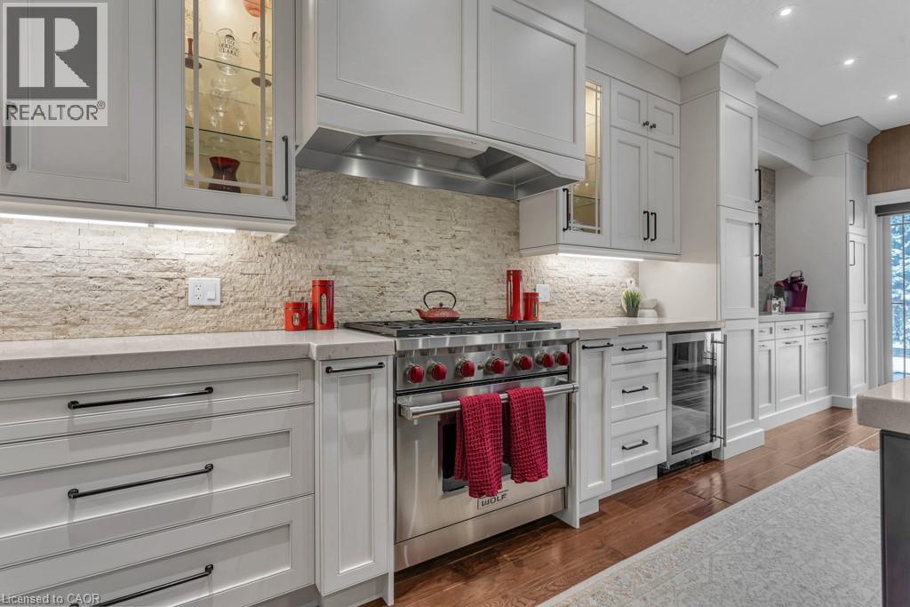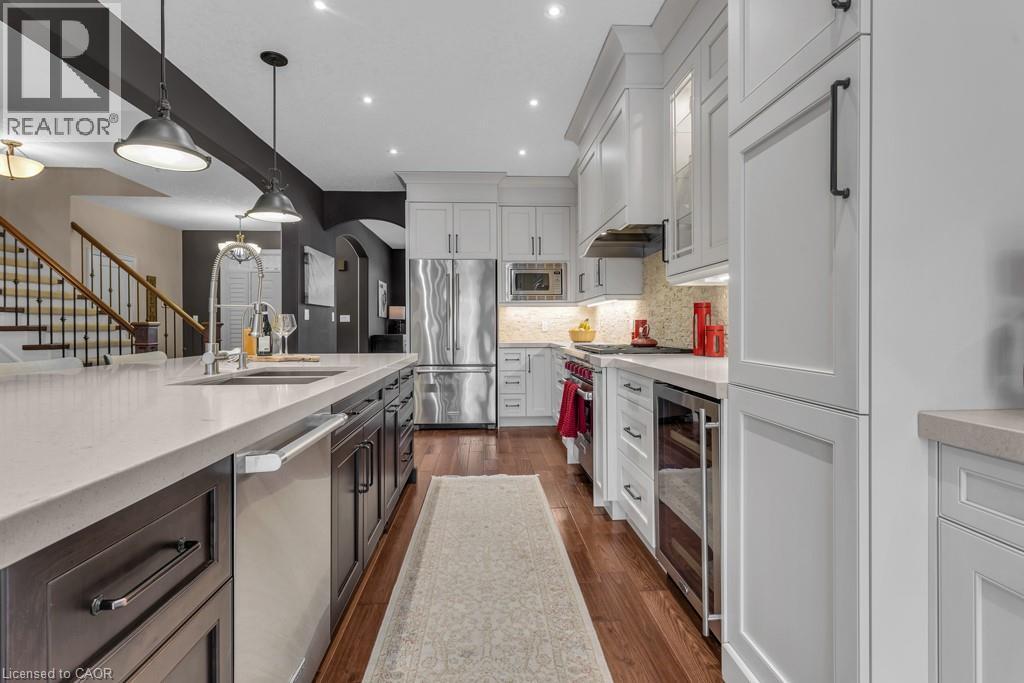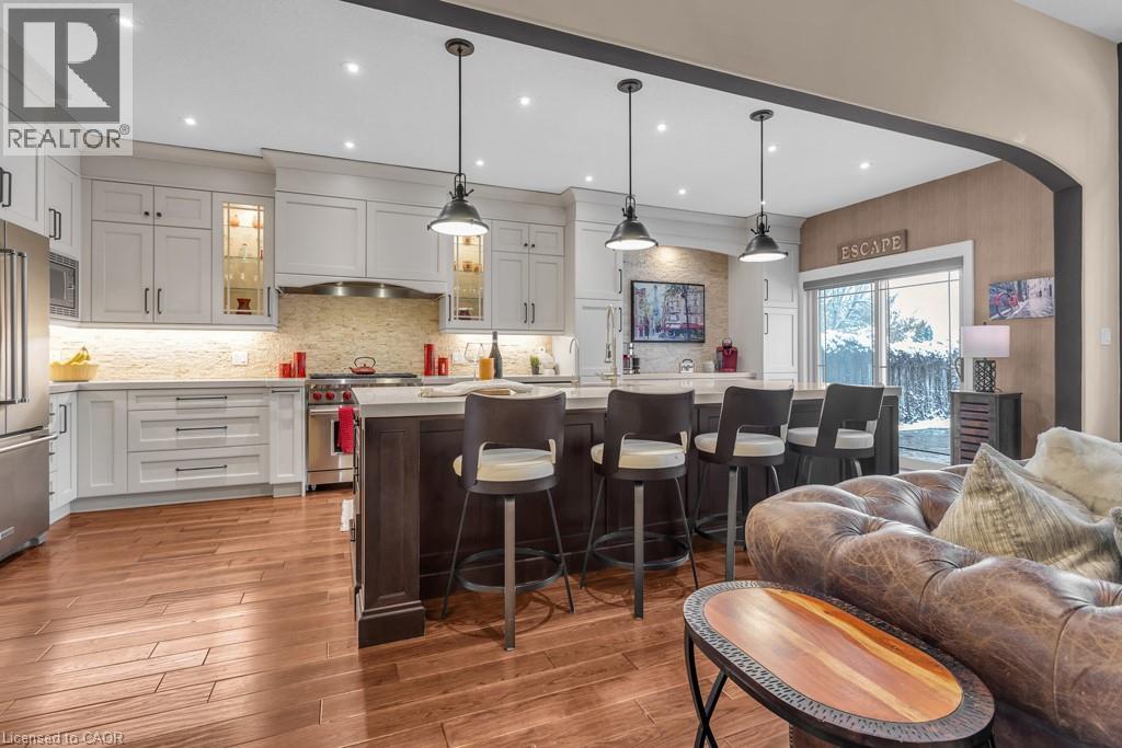 Step into unparalleled luxury and privacy at Terrace Wood Crescent—a masterpiece of Heisler classic elegance nestled in the prestigious Deer Ridge community, just minutes from Highway 401. Imagine coming home to your own private oasis: a beautifully landscaped lot backing directly onto a serene greenbelt, complete with a heated saltwater pool and a Sundance Maxxus Hot Tub under a custom 10 x 15 cedar-shingled pavilion. This exquisite 4+1 bedroom, 4 bathroom residence boasts impressive 11 and 9-foot ceilings, solid oak hardwood floors, and striking architectural details throughout. The heart of the home is a gourmet kitchen designed for true culinary enthusiasts—showcasing a “Wolf” 6-burner professional gas stove, stunning quartz counters, an expansive 10 x 5 ft island, two pantries, and custom pull-out drawers. With all high-end appliances included and all California shutters throughout, every detail has been thoughtfully curated for comfort and sophistication. Host unforgettable gatherings on your massive stamped concrete patio—over 1,000 sq ft of entertainment space—and enjoy easy living with the oversized garage and aggregate stone driveway. The stone and stucco exterior delivers jaw-dropping curb appeal that sets you apart from the moment you arrive. Why settle for ordinary when you can own extraordinary? Make Terrace Wood Crescent yours today (id:4555)