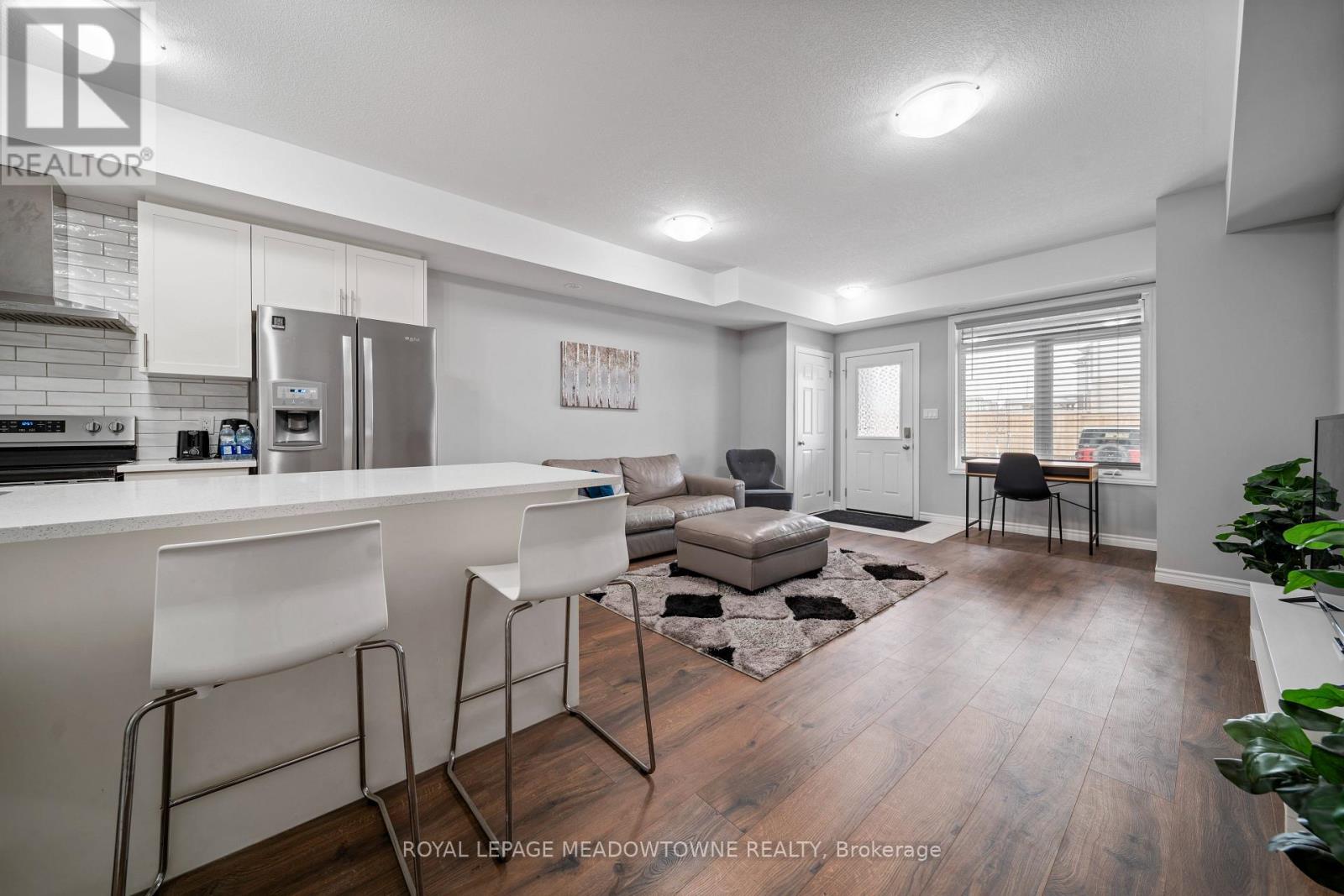This modern, single-level townhome offers true stair-free living-ideal for comfort, convenience, and accessibility. Featuring 2 bedrooms and 2 bathrooms within 930 square feet, the thoughtfully designed open-concept layout is enhanced by 9-foot ceilings, a bright living area with a large window, and a well-appointed eat-in kitchen with stainless steel appliances, centre island, and pantry. The primary bedroom offers a walk-in closet, 4-piece ensuite, and direct walk-out to a private backyard with its own entrance. The second bedroom is generously sized with excellent natural light, complemented by in-unit laundry. One parking space is included, located directly outside the front door. Ideally situated near top-rated schools, RBJ Schlegel Park, scenic trails, shopping, and quick access to Highway 401. Move-in ready, with maintenance fees covering snow removal, landscaping, and common area upkeep forlow-maintenance, stress-free living. (id:4555)