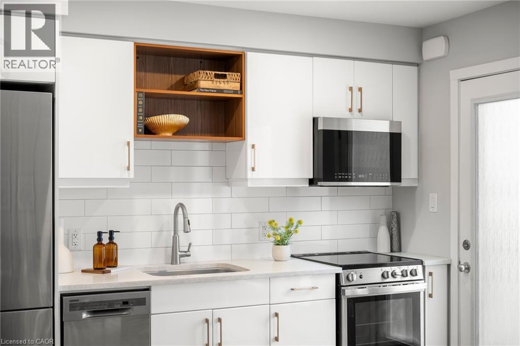 Welcome to 1242 King St East, Kitchener, a side-by-side legal duplex built in 2020, offering the ideal blend of modern design, strong rental appeal, and an unbeatable central location. Just minutes to DTK, steps to trails, Rockway Gardens, and with excellent commuter access via bus routes, LRT, and easy highway access, this property checks every box for investors and savvy owner-occupiers. From the curb, you’ll love the contemporary exterior with modern siding and brick cladding for a polished look. Tenants will also appreciate the outdoor space, including a large front porch and rear deck areas, perfect for relaxing & BBQing. Inside, the design truly stands out. Each unit features a loft-style layout with impressive 18' ceilings, creating a bright, open feel filled with natural light. Both units are finished with designer-inspired upgrades, including white cabinetry, quartz countertops, and a sleek tile backsplash, paired with white oak-inspired waterproof laminate flooring that’s both stylish and low-maintenance. The bathroom continues the elevated aesthetic with quartz countertops and modern black fixtures, adding a crisp, upscale finish. Each unit offers a functional 1 bedroom, 1 bathroom layout with intuitive design. Additional highlights include mirrored privacy film for excellent natural light while maintaining privacy, plus a dual-zone thermostat allowing each unit to control their own temperature independently. The duplex also features separate hydro meters, meaning tenants pay their own electricity, simplifying management. Both units include unfinished basements with excellent ceiling height, offering great storage and future potential. Parking is another major bonus, with two parking spaces per unit, providing plenty of room for both households and visiting guests. Whether you’re looking to live in one unit and rent the other, or add a newer-build legal duplex to your portfolio, 1242 King St. E is a standout opportunity worth seeing in person. (id:4555)