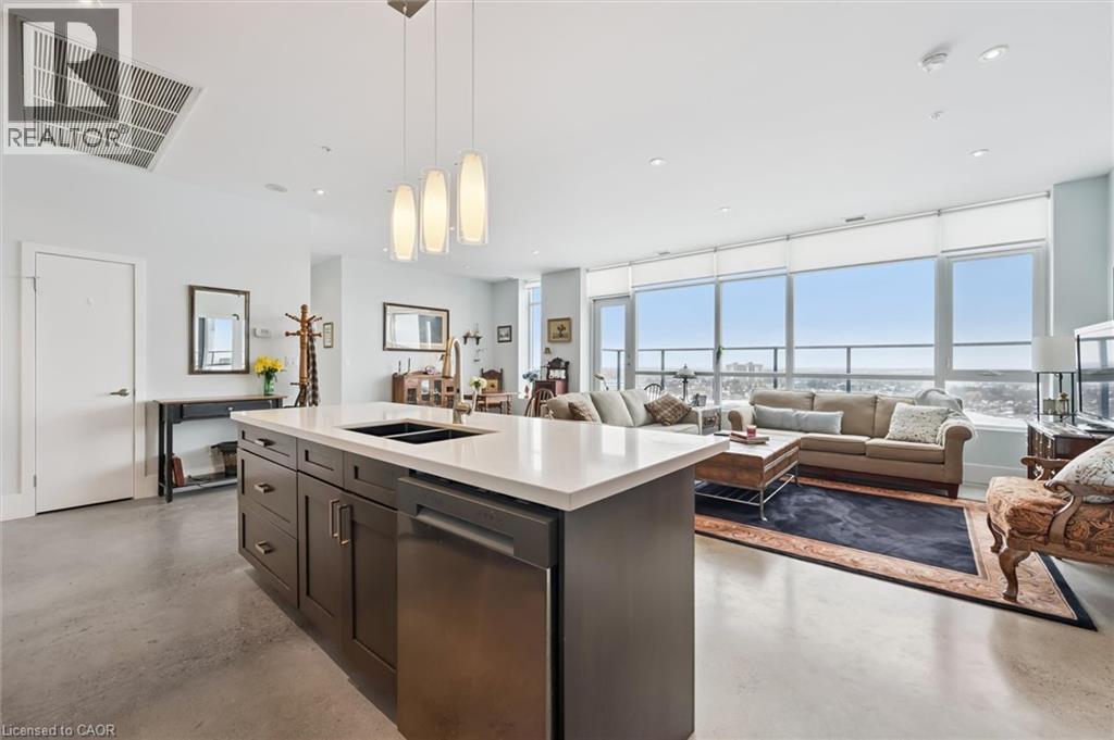 Welcome to this stunning 3-bedroom, 2-bathroom penthouse condo offering approximately 1,400 sq ft of modern urban luxury. Perched high above the city, this rare suite features a massive wrap-around balcony with sweeping views and even a gas hook up for your BBQ or fire table — perfect for entertaining, relaxing, and soaking in the downtown skyline. Inside, the unit showcases polished concrete floors throughout for a sleek, contemporary feel, complemented by custom cabinetry and premium finishes. The chef-inspired kitchen is equipped with quartz countertops, a gas stove, and a fridge with built-in water and ice, blending style and functionality seamlessly. Enjoy the convenience of upscale building amenities including a fully equipped gym, stylish party room, private theatre room, and a beautifully designed rooftop terrace complete with planters, BBQs, and outdoor dining areas. An exceptional opportunity to own a spacious penthouse in one of downtown Kitchener’s most sought-after buildings — steps to transit, tech hubs, dining, and entertainment. (id:4555)