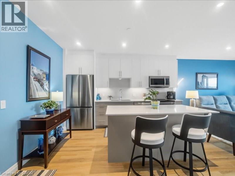 Welcome to 525 New Dundee Road, Unit 710. A beautifully appointed one-bedroom residence in a newer, impeccably maintained building in Kitchener. This is where modern design meets effortless living, offering a refined atmosphere with the perfect balance of tranquility and convenience. Unit 710 showcases a thoughtfully curated open-concept layout that feels both sophisticated and inviting. The elegant kitchen is finished with stainless steel appliances, a sleek induction stove, contemporary cabinetry, and a generous island that anchors the space. Ideal for entertaining guests or enjoying quiet evenings at home. The living area flows seamlessly to a private balcony, offering peaceful views and a sense of privacy just beyond the city core. Remote-control blinds enhance the space, providing both convenience and a polished, modern touch at the push of a button. Whether you’re enjoying your morning coffee or unwinding at the end of the day, this living space feels both comfortable and elevated. The primary bedroom is enhanced with custom built-in wardrobe and storage solutions, maximizing functionality without compromising style. Additional highlights include in-suite laundry, ample storage, and modern finishes throughout, all contributing to a clean, elevated aesthetic. Residents enjoy access to premium amenities, including a fully equipped fitness centre, sauna, stylish party room, quiet library, dog wash station, and a beautifully landscaped outdoor terrace complete with BBQs. Thoughtfully designed for both relaxation and entertaining. Ideally located just minutes from Highway 401, Conestoga College, shopping, dining, and scenic walking trails, this address offers seamless connectivity while maintaining a calm, residential atmosphere. Whether you’re seeking your first home, a sophisticated downsizing opportunity, or a smart investment, Unit 710 delivers comfort, quality, and lifestyle in one complete, polished package. (id:4555)