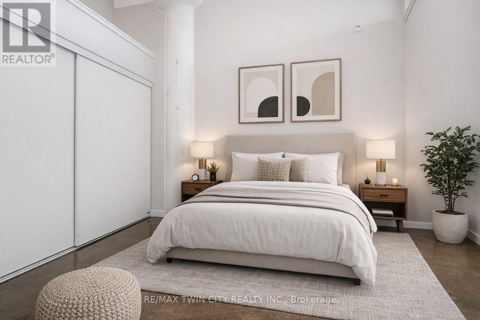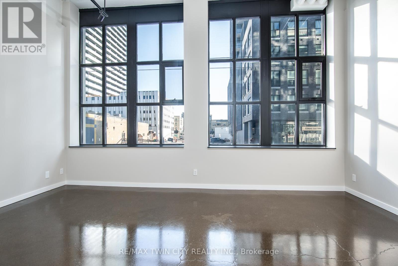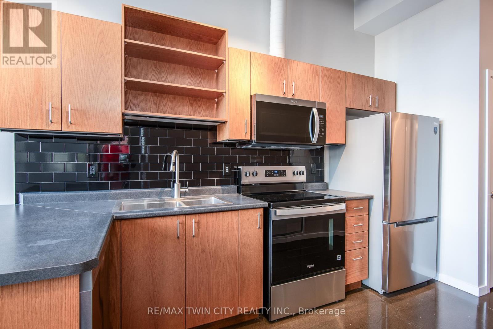Seize this rare opportunity to own a stunning, move-in ready unit in the highly coveted Kaufman Lofts, ideally positioned in the vibrant core of downtown Kitchener. Located directly across from Google and just steps to the LRT, Communitech, the School of Art, and the Tannery, this unbeatable address places shopping, dining, universities, and quick expressway access right at your doorstep. This bright and spacious one-bedroom loft showcases authentic industrial character paired with contemporary comfort. Soaring 13-foot ceilings, oversized windows that flood the space with natural light, polished concrete floors, exposed duct-work, and original architectural details create a true warehouse-inspired aesthetic that simply cannot be replicated. The open-concept layout features a sleek, modern kitchen complete with brand-new appliances (fridge, stove, dishwasher, and microwave), while the washer/dryer combo has been updated in recent years. The generous bedroom offers a large closet with a convenient storage nook above. A brand-new, stylish 4-piece bathroom adds a fresh, contemporary touch and enhanced functionality. In addition to the in-suite laundry, the unit comes with one owned parking space, and a storage locker. With quick possession available, this truly move-in ready home offers exceptional value for buyers seeking character, convenience, and lifestyle in one of the city's most iconic buildings. Residents also enjoy premium amenities, including a rooftop terrace with BBQ area, party room, and bike storage. Don't miss your chance to own a piece of Kitchener's iconic loft living at an exceptional value. Schedule your private showing today and experience this remarkable home for yourself. (id:4555)
