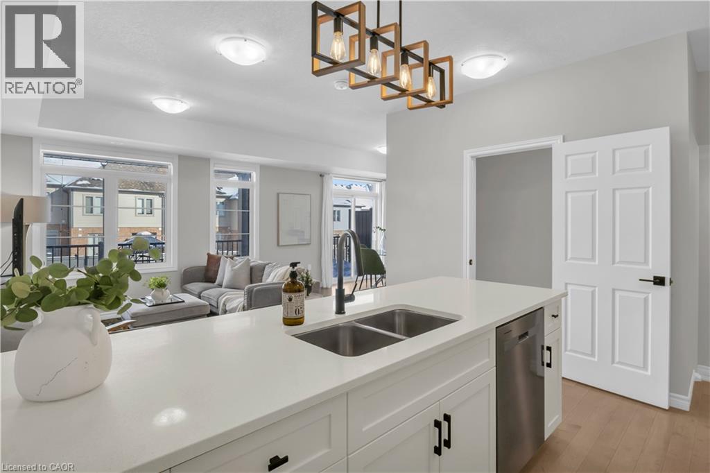 Welcome to 46 Oat Lane, a beautifully maintained two storey stacked townhouse in Kitchener’s sought after Huron Park community. This 2 bedroom, 2.5 bathroom home has been thoughtfully cared for and shows in pristine condition, offering a warm and inviting space you will feel proud to call your own. The main living level features 9 ft ceilings, hardwood flooring, and large windows that fill the open concept layout with natural light. The kitchen, dining and living areas flow seamlessly together, creating a comfortable setting for both quiet evenings at home and time spent with family and friends. The kitchen is finished with upgraded stainless steel appliances, quartz countertops, and a peninsula with a built in sink and bar seating, making it as functional as it is welcoming. Sliding glass doors off the dining area lead to a private balcony, perfect for relaxing outdoors. A convenient powder room completes this level. Upstairs, two well sized bedrooms provide privacy and comfort. The primary bedroom includes a walk in closet, an upgraded ensuite, and its own private balcony, an ideal spot to start your day with a morning coffee. A four piece bathroom serves the second bedroom, and upper level laundry adds everyday ease. Surrounded by parks, trails, schools, shopping and cafes, this home offers low maintenance living in a friendly, well established neighbourhood that continues to grow in popularity. (id:4555)