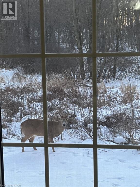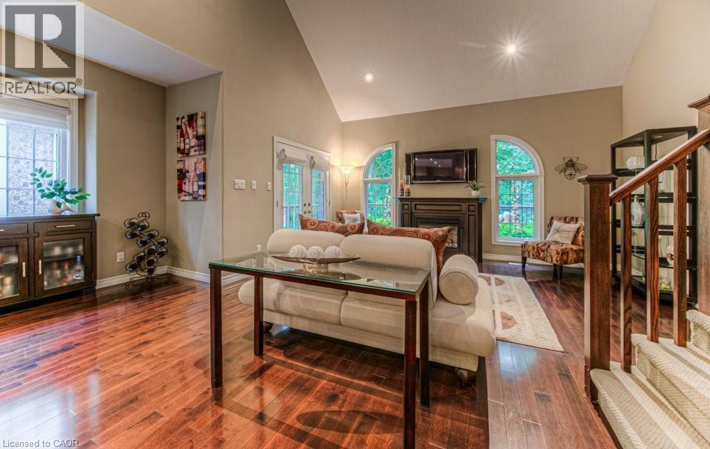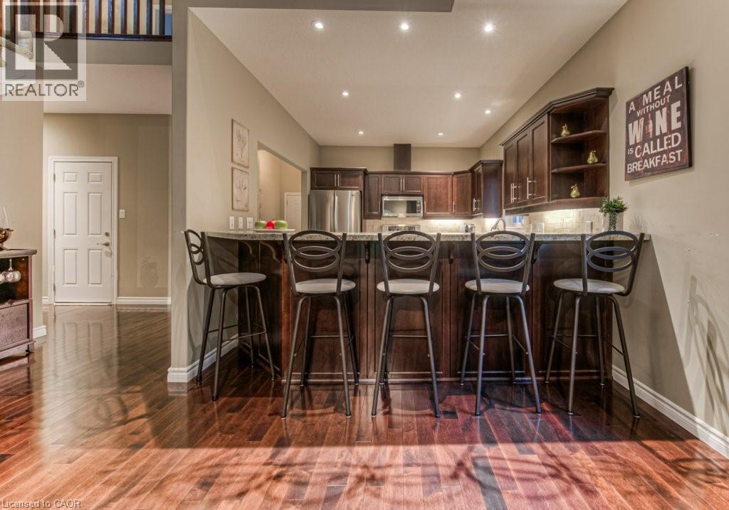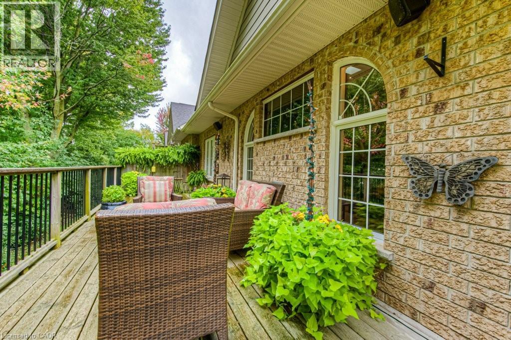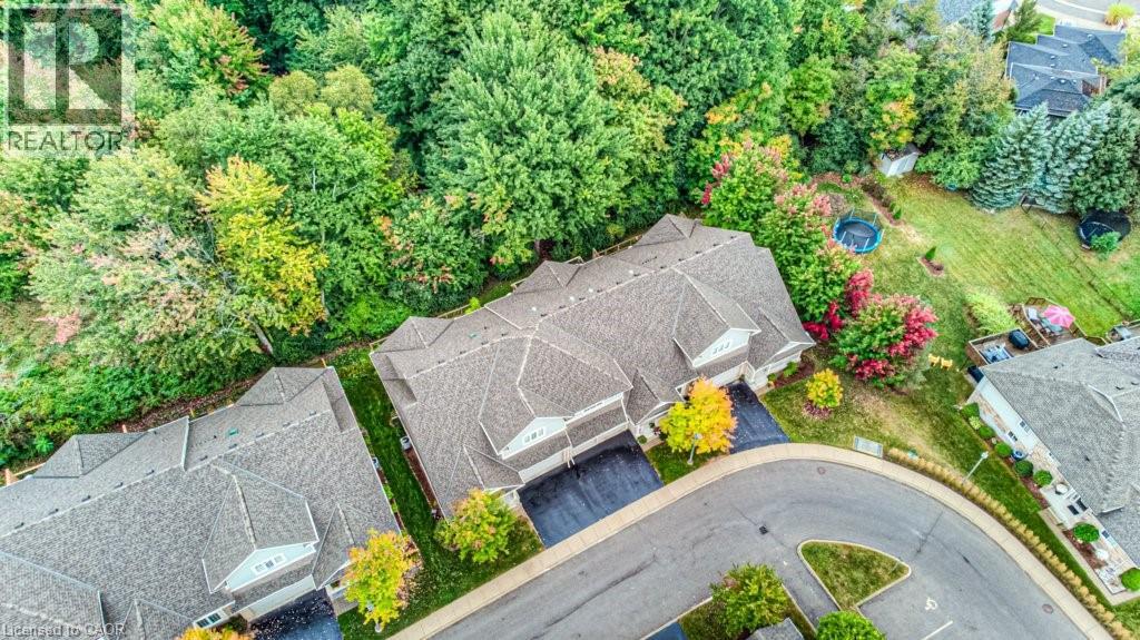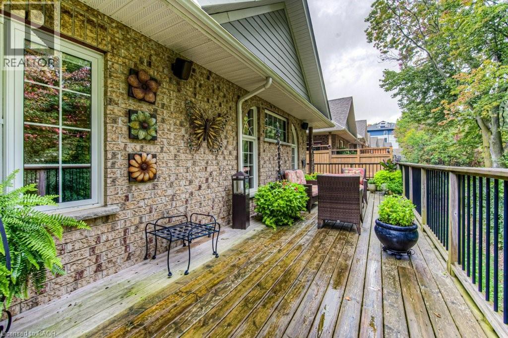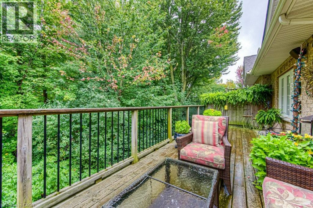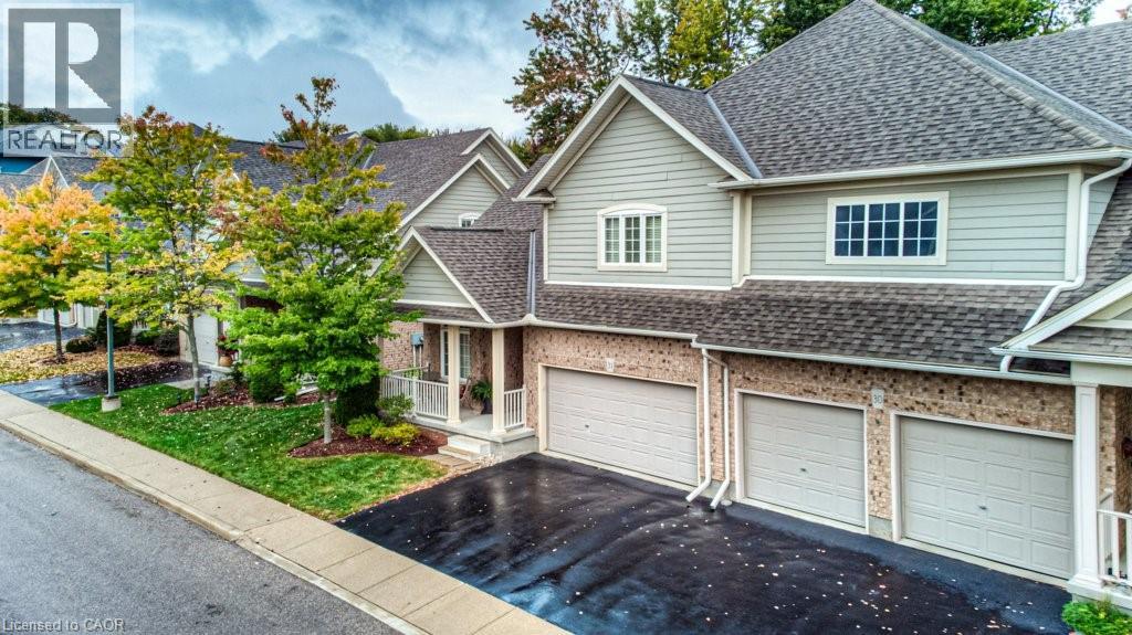 Customized, original owner Aspen Woods bungaloft end unit townhouse condo with double garage, main floor primary suite backing on to the lush forest of Natchez Woods in southeast Kitchener. Welcoming covered porch is ready to sit & share coffee with a neighbour. Interior features include hardwood flooring throughout the main level with upgraded title in the bathrooms and kitchen. The dining room with coffered ceiling is suitable for use as an office/den. Fabulous kitchen with totally wide open concept view to the living room, the only unit in the complex with this expanded feature. Thick granite counters with curved breakfast bar, stainless appliances, double drawer dishwasher, Kohler cast iron sink with Grohe faucet plus three lazy Susan corner cupboards all combine to impress with above average working space for meal prep & entertaining. The spacious living room area with gas fireplace features a vaulted ceiling with numerous pot lights and side windows to enhance the space. A garden door walkout to the extended rear deck is a convenient access. Treat yourself to this primary bedroom suite with vaulted ceiling, walk-in closet, and enlarged 3pc ensuite having a clean tiled walk-in shower. The triple window view of the scenic trees will greet you each morning as you wake up in bed. Up the stairs to the family room/loft where the whole home audio/video system with cabinet is ready for you to relax and be entertained. Visiting grandchildren & guests will love the additional two bedrooms and 4pc bathroom with Kohler deep soaker tub too! Though the basement level with walkout to ground level is unfinished it does offer substantial storage space and the opportunity to complete to your quality level & design in the future. Walking trails. shopping amenities, access to the Breslau International Airport, Chicopee Ski Hill and other venues makes this a wonderful area to experience and explore. A Natural move for those looking to downsize with reasonable fees. (id:4555)