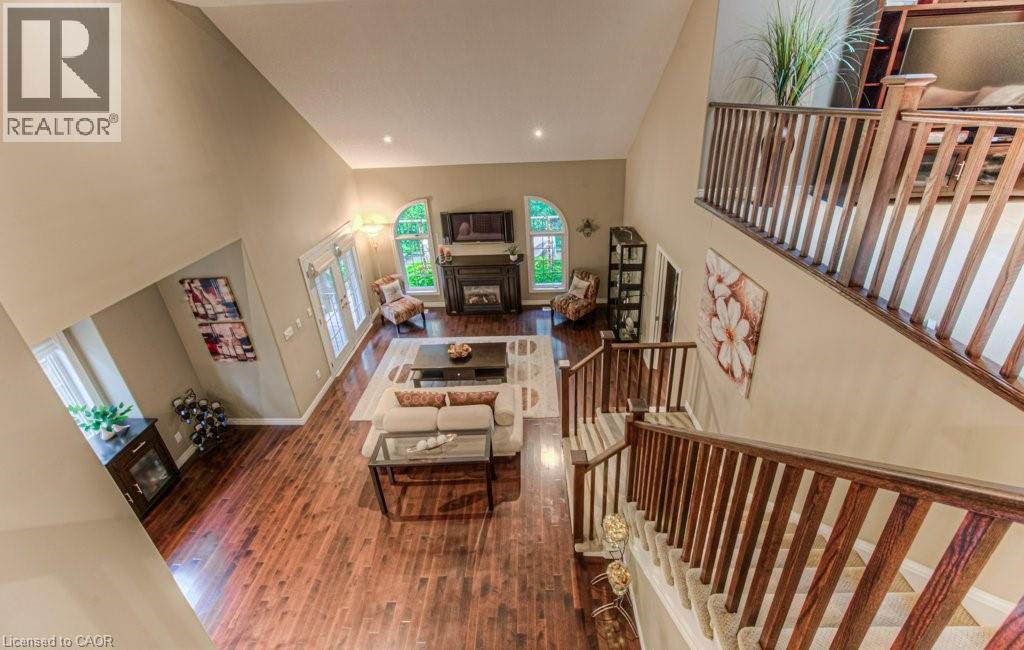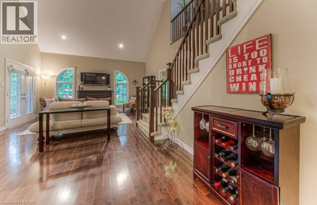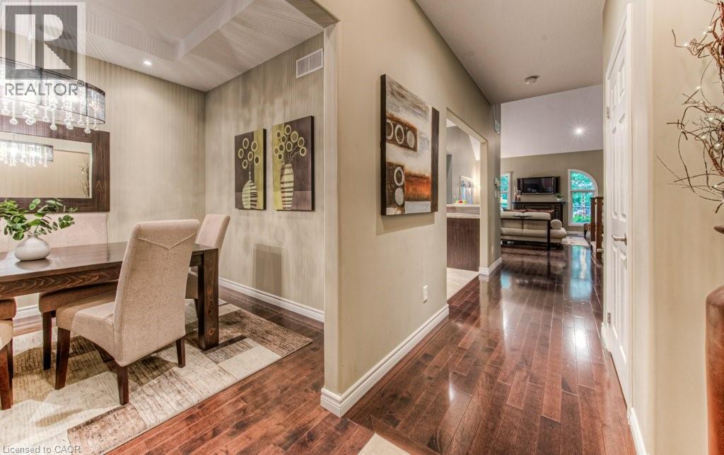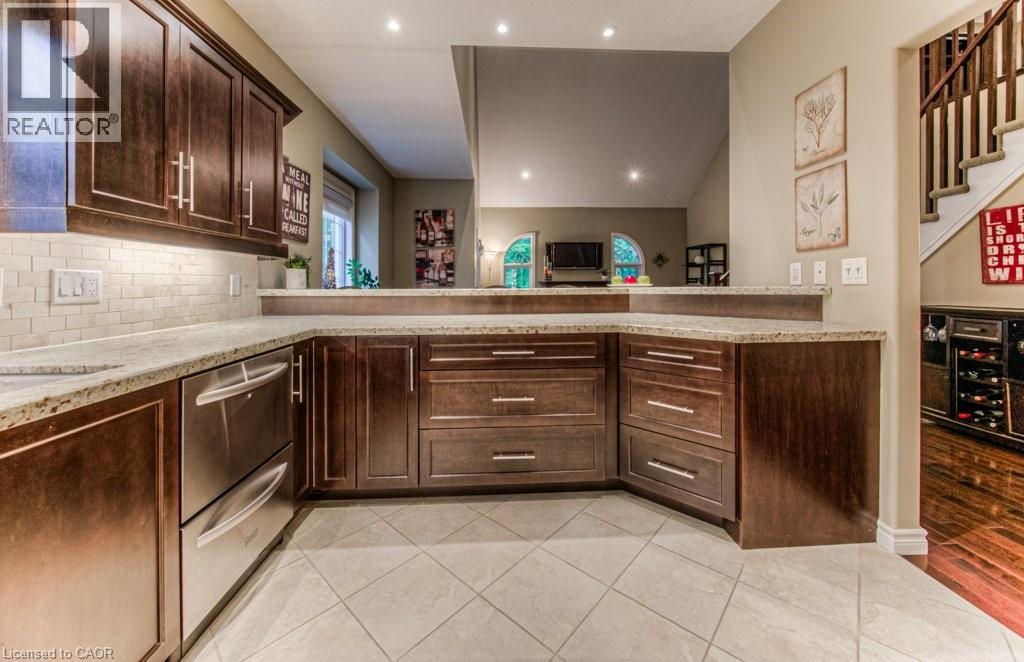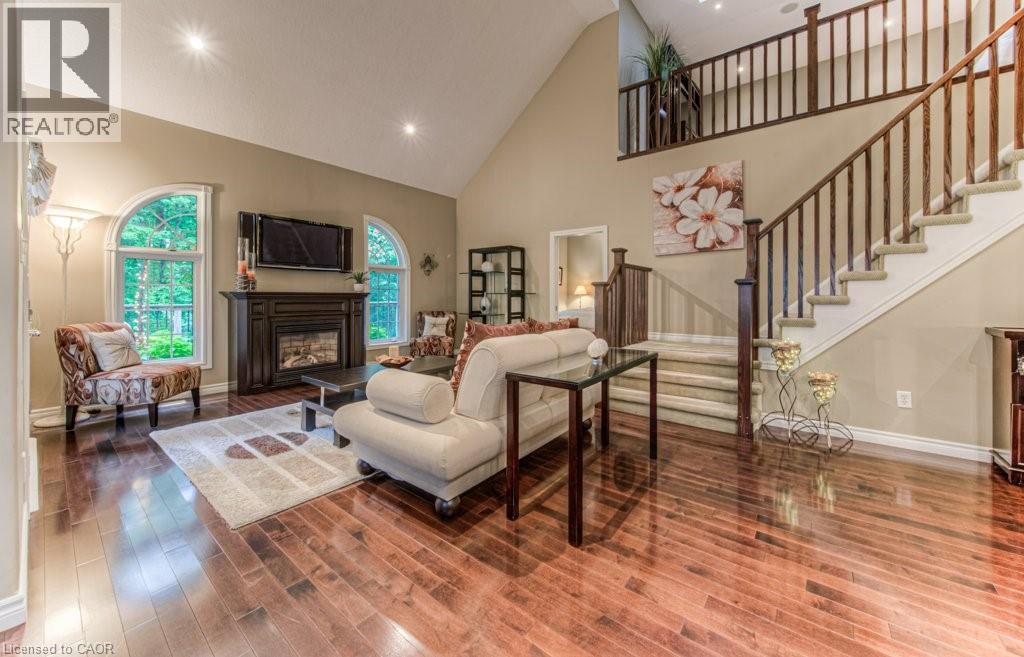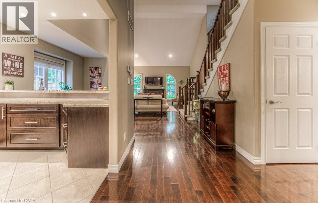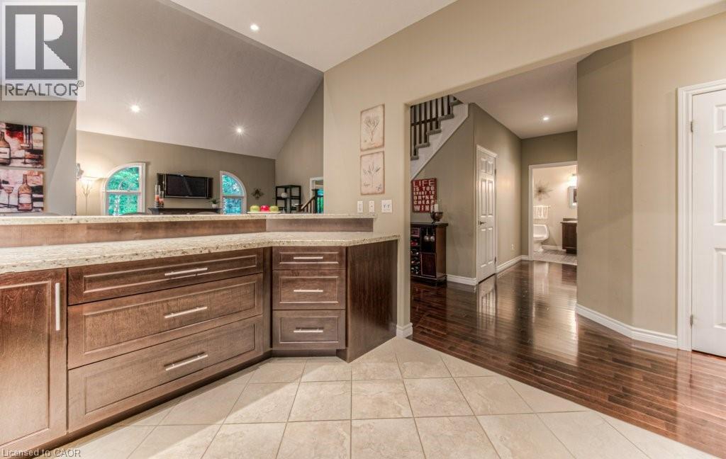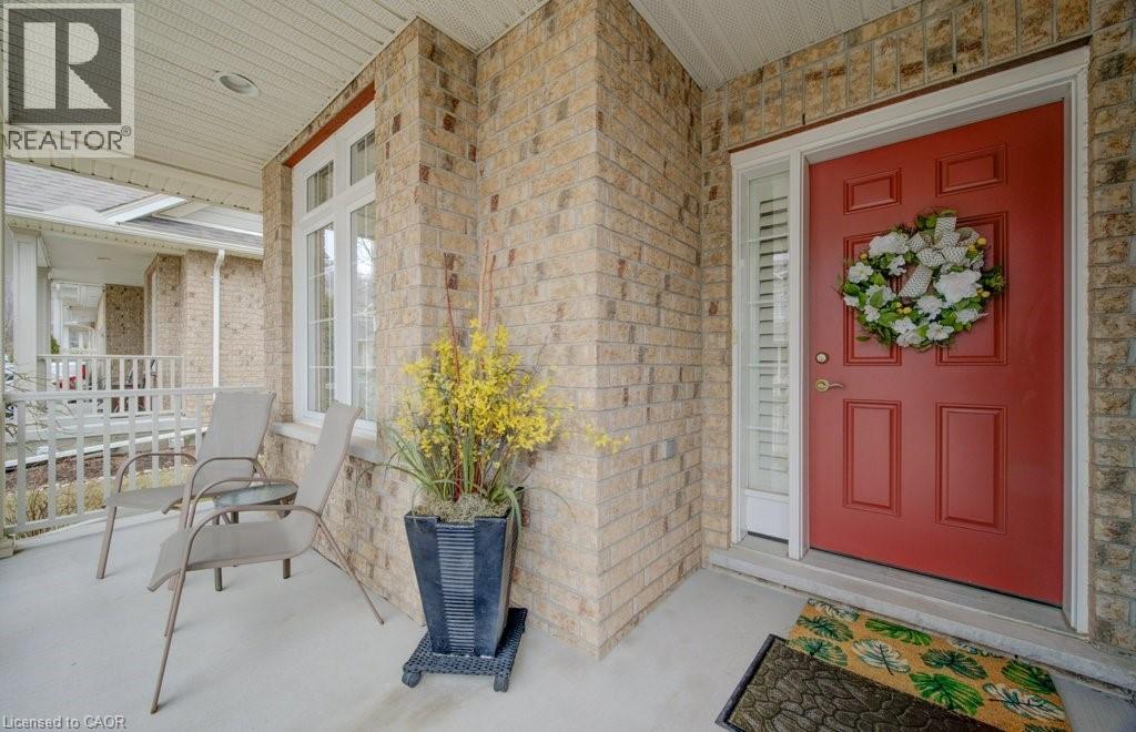 Customized, original owner Aspen Woods bungaloft end unit townhouse condo with double garage, main floor primary suite backing on to the lush forest of Natchez Woods in southeast Kitchener. Welcoming covered porch is ready to sit & share coffee with a neighbour. Interior features include hardwood flooring throughout the main level with upgraded title in the bathrooms and kitchen. The dining room with coffered ceiling is suitable for use as an office/den. Fabulous kitchen with totally wide open concept view to the living room, the only unit in the complex with this expanded feature. Thick granite counters with curved breakfast bar, stainless appliances, double drawer dishwasher, Kohler cast iron sink with Grohe faucet plus three lazy Susan corner cupboards all combine to impress with above average working space for meal prep & entertaining. The spacious living room area with gas fireplace features a vaulted ceiling with numerous pot lights and side windows to enhance the space. A garden door walkout to the extended rear deck is a convenient access. Treat yourself to this primary bedroom suite with vaulted ceiling, walk-in closet, and enlarged 3pc ensuite having a clean tiled walk-in shower. The triple window view of the scenic trees will greet you each morning as you wake up in bed. Up the stairs to the family room/loft where the whole home audio/video system with cabinet is ready for you to relax and be entertained. Visiting grandchildren & guests will love the additional two bedrooms and 4pc bathroom with Kohler deep soaker tub too! Though the basement level with walkout to ground level is unfinished it does offer substantial storage space and the opportunity to complete to your quality level & design in the future. Walking trails. shopping amenities, access to the Breslau International Airport, Chicopee Ski Hill and other venues makes this a wonderful area to experience and explore. A Natural move for those looking to downsize with reasonable fees. (id:4555)