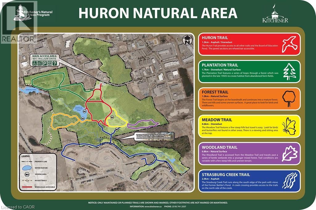 This stunning, meticulously maintained family home offers breathtaking backyard views overlooking the serene **Huron Natural Area** in Kitchener's desirable Huron South community. Enjoy seamless indoor-outdoor living with a walkout basement that provides direct access to more than **7 km** of scenic, family-friendly trails winding through lush forests, wetlands, meadows, and natural beauty—perfect for daily walks, hiking, or simply immersing yourself in nature right from your backyard. Huron South is a welcoming, family-focused neighbourhood with excellent walkability to newly built public and Catholic schools, convenient shopping options, and the impressive **RBJ Schlegel Park** (home to the upcoming state-of-the-art Cowan Recreation Centre, a $144 million+ facility featuring sports fields, pools, gyms, and community amenities set to enhance active living even further). Ideal for families seeking both tranquility and modern conveniences in one exceptional location. ++ Main features are: + Large second level primary bedroom with 4 pc ensuite bathroom and walk in closet + Generously sized two additional bedrooms + Flexible open play/work space on upper floor - this space can be also easily converted to the 4th bedroom + Additional 4 piece bathroom with tub ideal for families with children + Modern kitchen with granite countertops and stainless steel appliances + Oversized deck off dining area, enjoy views of Huron Natural Area while hosting in/outdoors + Almost 1900 sq ft of living space + Around 800 sq ft of open layout, unfinished basement with rough-in for 4 pc bathroom + Double garage with electric car charger rough-in + Wide 40 ft lot + Walking distance to elementary and secondary schools, both public and catholic + Walkable to RBJ Schlegel Park, new $144 million recreation centre (pool, pickleball, splash pad) and shopping/restaurant plaza Freshly painted and ready to move in! (id:4555)