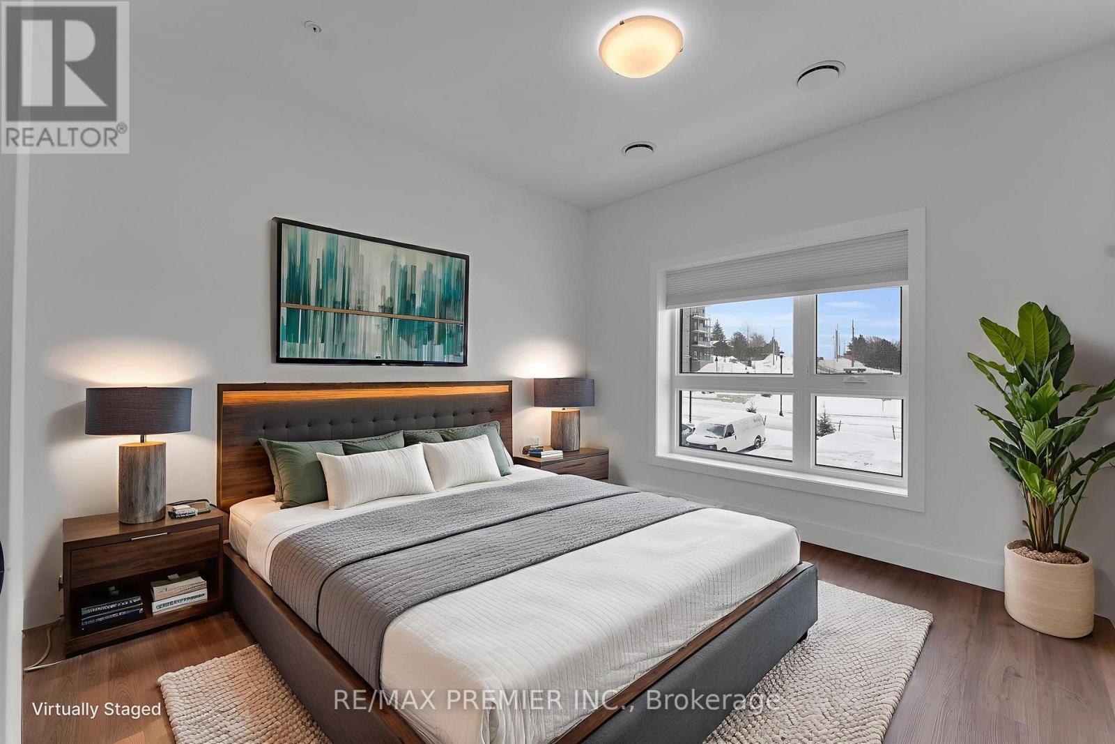 Discover this beautifully maintained, carpet-free unit featuring a bright and functional layout with modern finishes throughout. The home offers durable laminate flooring, upgraded interior doors, six pot lights, lower light switches for added accessibility, and a desirable west-facing exposure that fills the space with natural light and beautiful sunset views. The contemporary kitchen features upgraded tall cabinetry, quartz countertops, a subway backsplash, matte black fixtures, and under-cabinet lighting-perfect for everyday cooking and entertaining. The spacious bathroom includes an oversized vanity countertop with ample storage, while the bedroom offers a generous closet with wide double doors for easy organization. Enjoy seamless indoor-outdoor living with access to a private balcony-an ideal space to relax and unwind while taking in the sunset. Amenities include bike storage, a party room, visitor parking, and a small park. The unit also comes with one parking space and one locker conveniently located on the second Situated in a highly desirable neighbourhood close to parks, walking trails, shopping, restaurants, and everyday amenities. Easy-to-access public transit and major roadways make commuting convenient. Nearby Public and Catholic schools, childcare, and community facilities add to the area's appeal. A well-kept, move-in-ready home offering comfort, convenience, and a fantastic location. (id:4555)