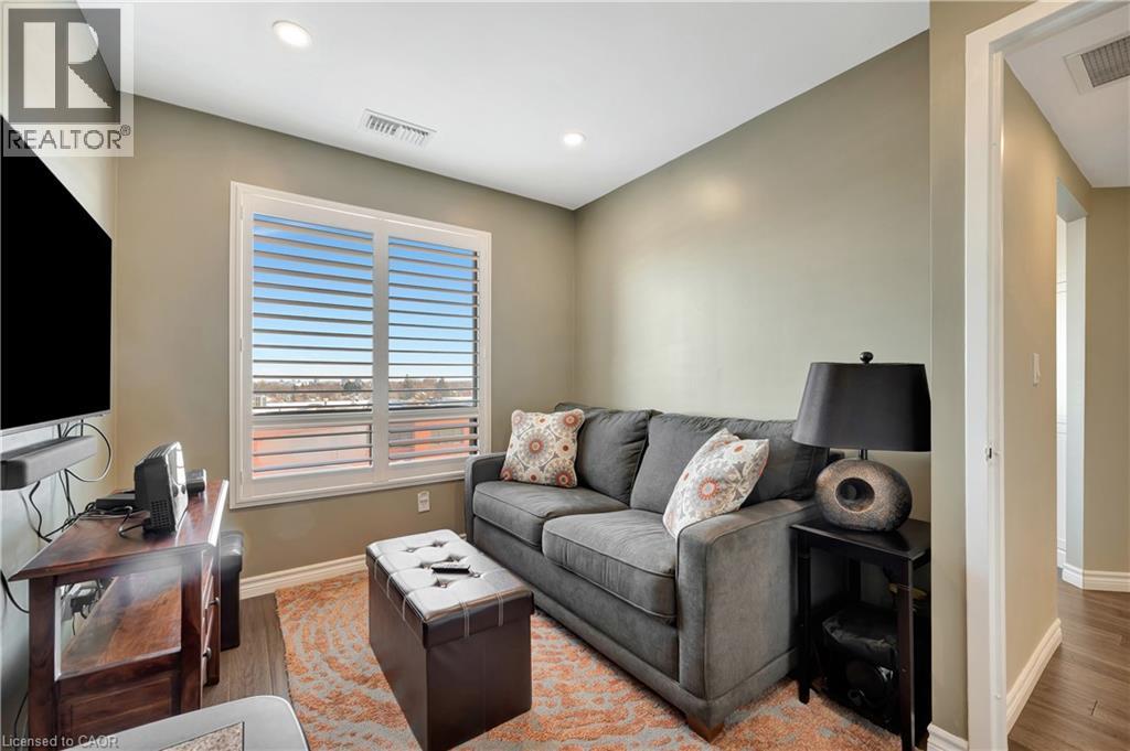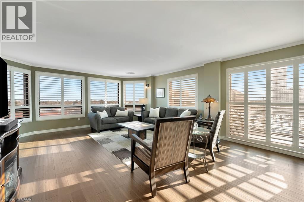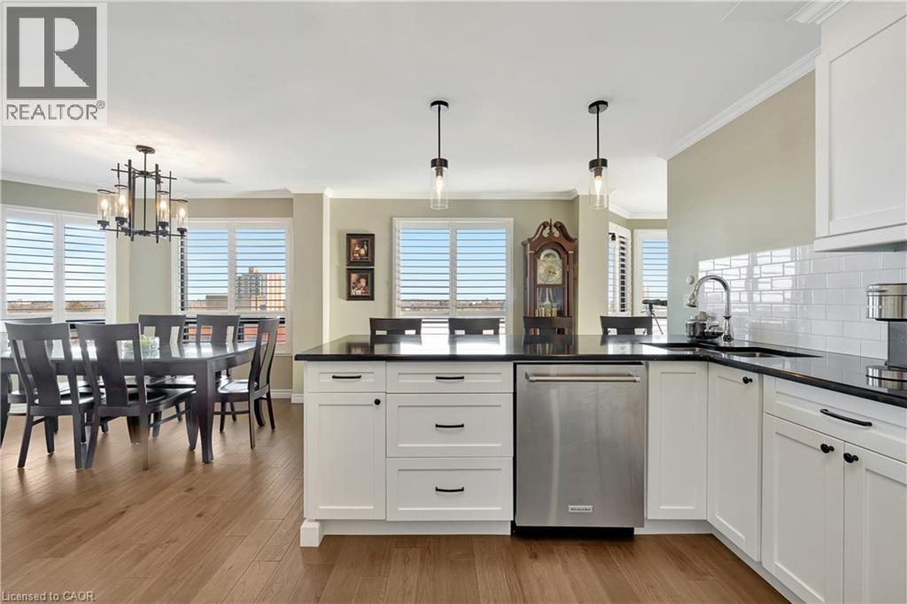 Incredible opportunity to own this luxurious South facing corner penthouse! Fully and completely renovated, Extremely QUIET unit and QUALITY built building! Only 6 units on penthouse floor! Featuring two bedrooms, two full bathrooms, two parking spots owned with one underground and one surface parking! Extremely bright unit with two skylights w/remote blinds and windows wrapped around entire unit. Large balcony with two walkouts - one off living room and one off primary suite, overlooking historical Queen Street and across the street from Centre in the Square performing arts venue! Beautiful architectural, prominence, and daily cultural life, symphony, performances, theater and community arts events. A short walk to the Kitchener public library, downtown restaurants, Kitchener market and GO/LRT. This unit features Sound Insulation underneath beautiful walnut-hardwood flooring through, stunning gourmet kitchen with large island and sleek black quartz counters, tile, backsplash, built-in appliances, 2 walk-in showers, in-suite laundry, large storage locker owned with Unit, all equipment owned - furnace and air conditioner new 2024, hot water heater new 2025, water softener new 2018. Water & Windows are included in the condo fee! Lots of visitor parking for overnight guest. This is one of a kind, highly sought after rarely found corner penthouse suite! Amenities include exercise room, sauna, games and party room. (NOTE: Guest bedrm/Den picture is virtually staged to show you what would look like as a guest bedrm). (id:4555)