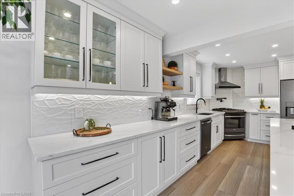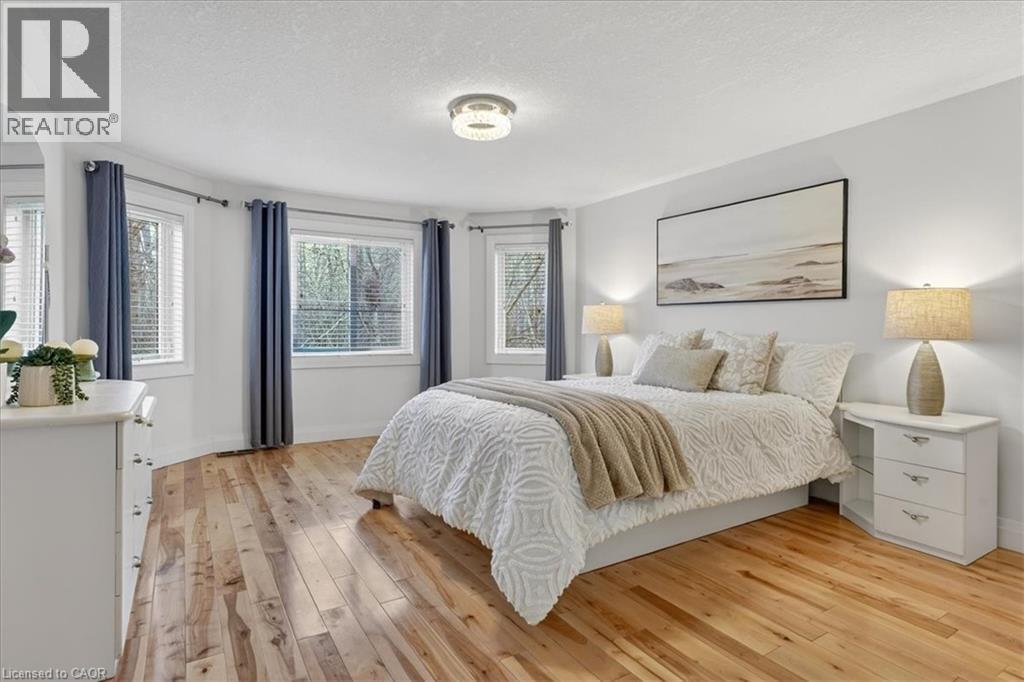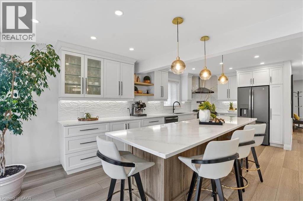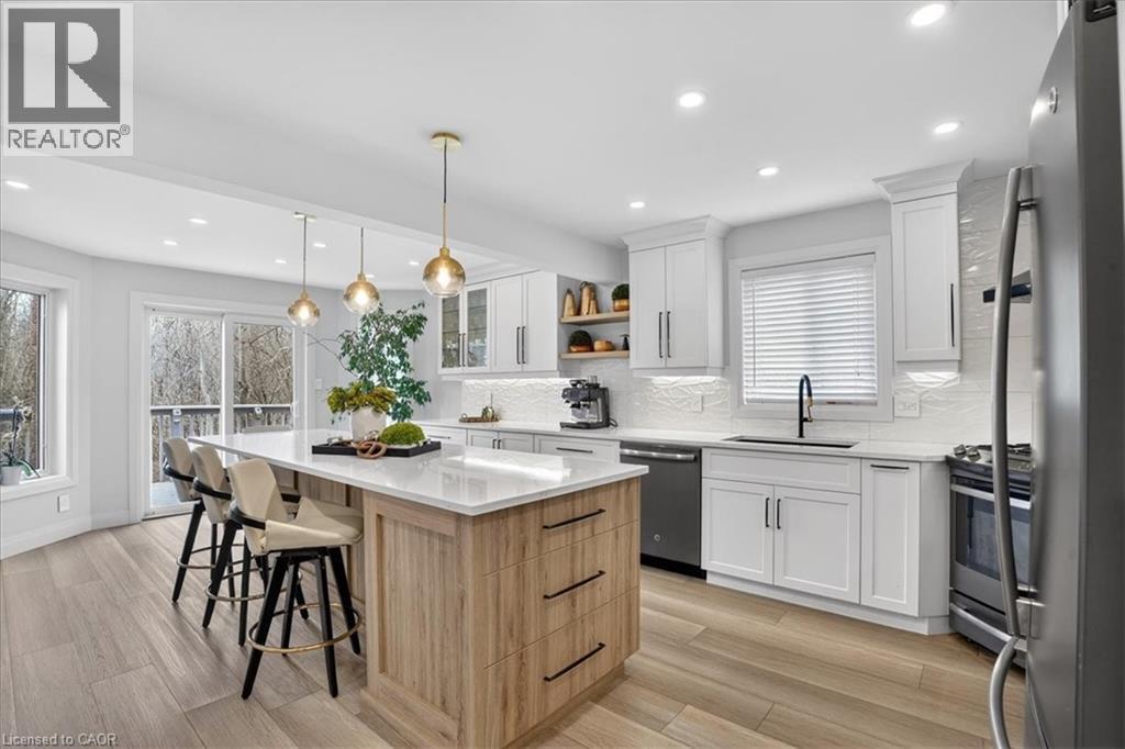 Stunning, professionally renovated 3 bedroom, 4 bathroom home in a superior Idlewood location. Nestled on a premium court walk-out lot, backing onto Briarfield Park Natural Area. Meticulously maintained and loved by original owners. The interior has been beautifully transformed with recent extensive upgrades throughout, including exceptional kitchen by Polwood Kitchens with abundance of full height cabinetry, large island (11' long), quartz countertops, Stainless Steel appliances (gas stove/oven) and walk-in pantry (all in 2022). Very bright, with large windows and sliding doors to upper deck with full forest views. The kitchen is open to an elegant Living Room with electric, modern Napoleon fireplace. Spacious, formal Dining Room is perfect for friends and family dinners. The 2 piece Powder Room and Laundry Room, conveniently located on the main floor. New luxury plank flooring throughout and wholly new white oak staircase with black metal spindles (2022). The second floor features 3 bedrooms with large windows and new hardwood flooring, including huge Primary with his/her closets and spectacular spa-like 5 piece luxury Ensuite with large glass walk-in shower, free standing tub, wall-mounted double vanity with makeup table, quartz countertops and large porcelain flooring tiles throughout (2021). The walkout basement provides lots of light as well as access to the rear patio and forest. Spacious Recroom, Games Room, wet bar, Office and 3 piece Bathroom. Don't forget the stairs from the garage to the basement and abundant storage/workshop under the garage. Additional updates include: Furnace and A/C (2013), interior shaker style doors (2022), all stainless steel appliances (2019), 2 gas lines to BBQ. Two car garage and concrete driveway for 4 cars. No sidewalk to shovel! A Great Family Home on a safe court. Minutes to Chicopee Ski Hill, Grand River Trails, Springmount, Lackner and Idlewood Creek Parks, schools, shopping and easy access to Highway 6, Highway 8 & 401. (id:4555)