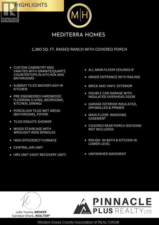 FOR A LIMITED TIME - INTRODUCTORY PRICING!! Welcome to Mayrand Street in the new Villa Oaks Subdivision! This spacious Raised Ranch semi-detached home with attached double garage features 2 Bedrooms & 2 Bathrooms in a quiet neighbourhood just minutes from many amenities. Step inside to the bright, welcoming space with hardwood floors in the kitchen and all living areas and tile flooring in the foyer and baths. The open floor plan seamlessly connects the living room to the dining area and kitchen, making it ideal for entertaining and family gatherings. The kitchen’s functional layout features plenty of cabinet space, island and solid countertops. The unfinished basement features a grade entrance, rough-in bath and rough-in kitchen. Located in a desirable LaSalle neighborhood with easy access to local schools, shopping, and major highways. (id:4555)