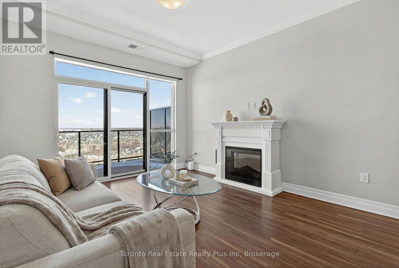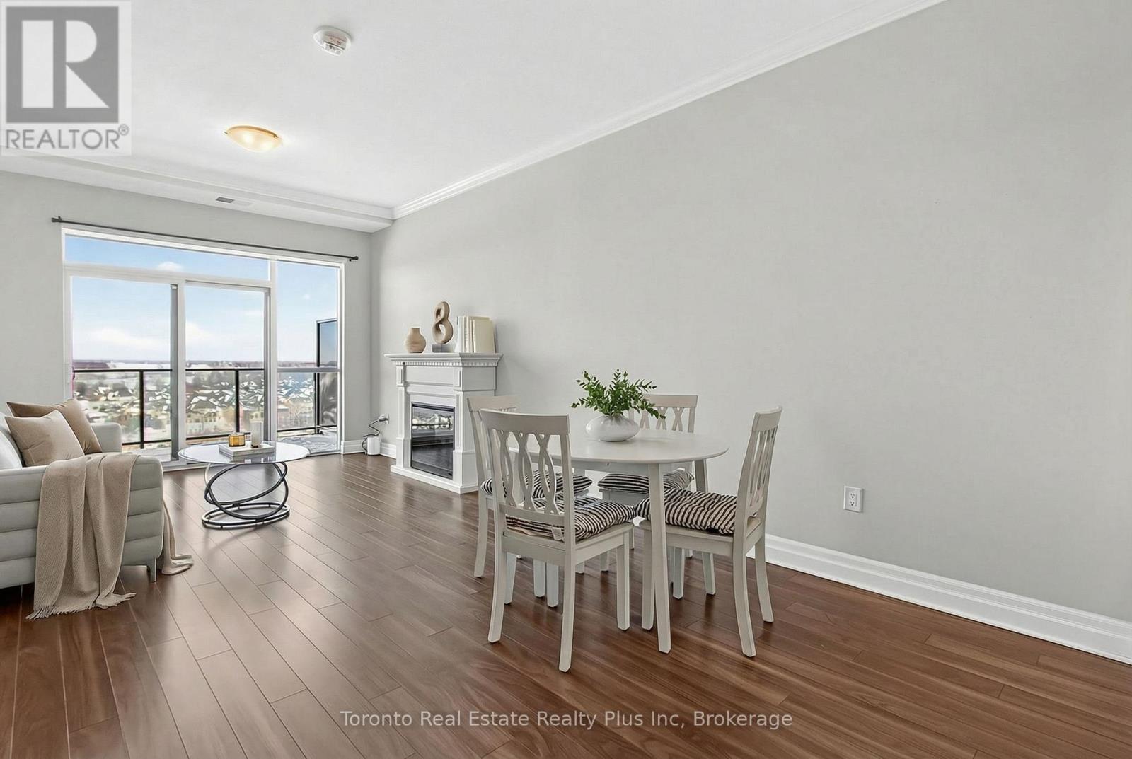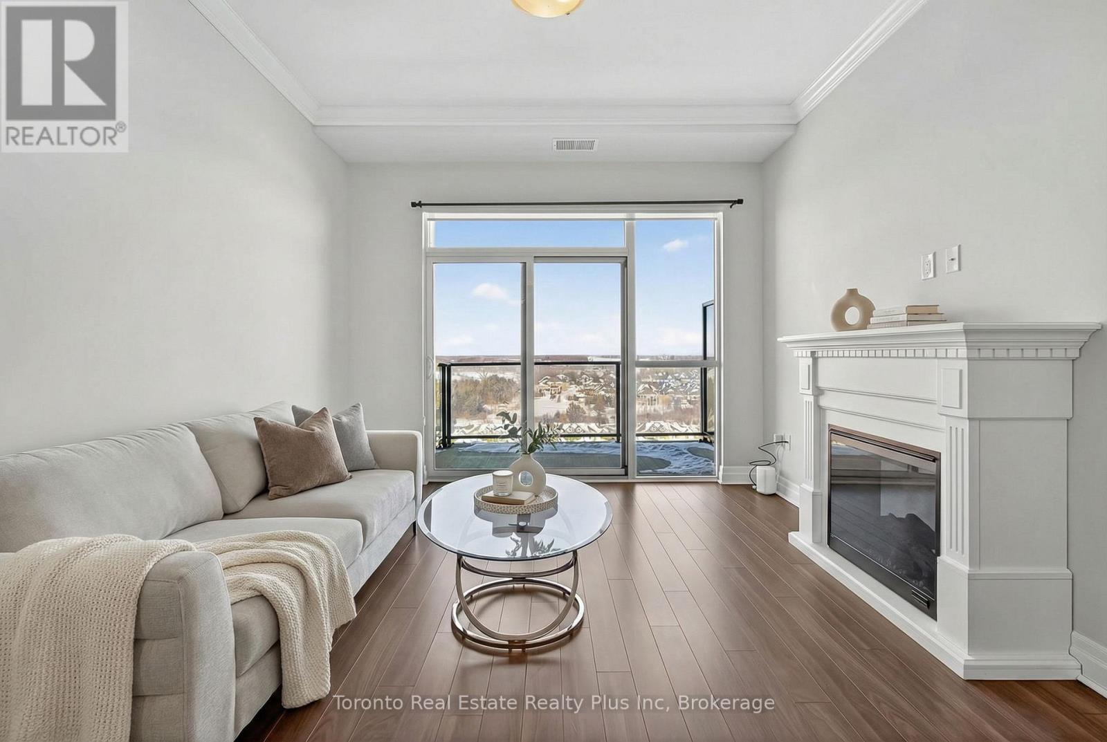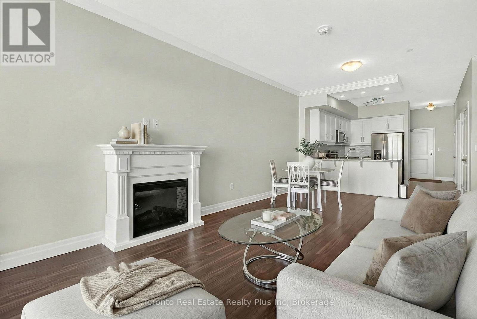 Welcome to Village North II, a sought-after luxury condo in North London near Masonville Mall and Western University. Suite 1109 is a turnkey 1-bedroom + den offering a versatile office space and a 4-piece bath with soaker tub and separate walk-in shower. The open-concept living area features crown moulding, premium laminate flooring, and a cozy gas fireplace. The modern white kitchen includes stainless steel appliances, granite countertops, pantry storage, and a breakfast bar. Enjoy beautiful North London views from your private balcony. The spacious primary bedroom offers floor-to-ceiling windows and a walk-in closet. In-suite laundry adds convenience. Exceptional amenities include an indoor saltwater pool, gym, golf simulator, theatre room, billiards room, private dining space, and outdoor terrace with BBQs. Heat and water included, plus owned underground parking and storage locker. (id:4555)