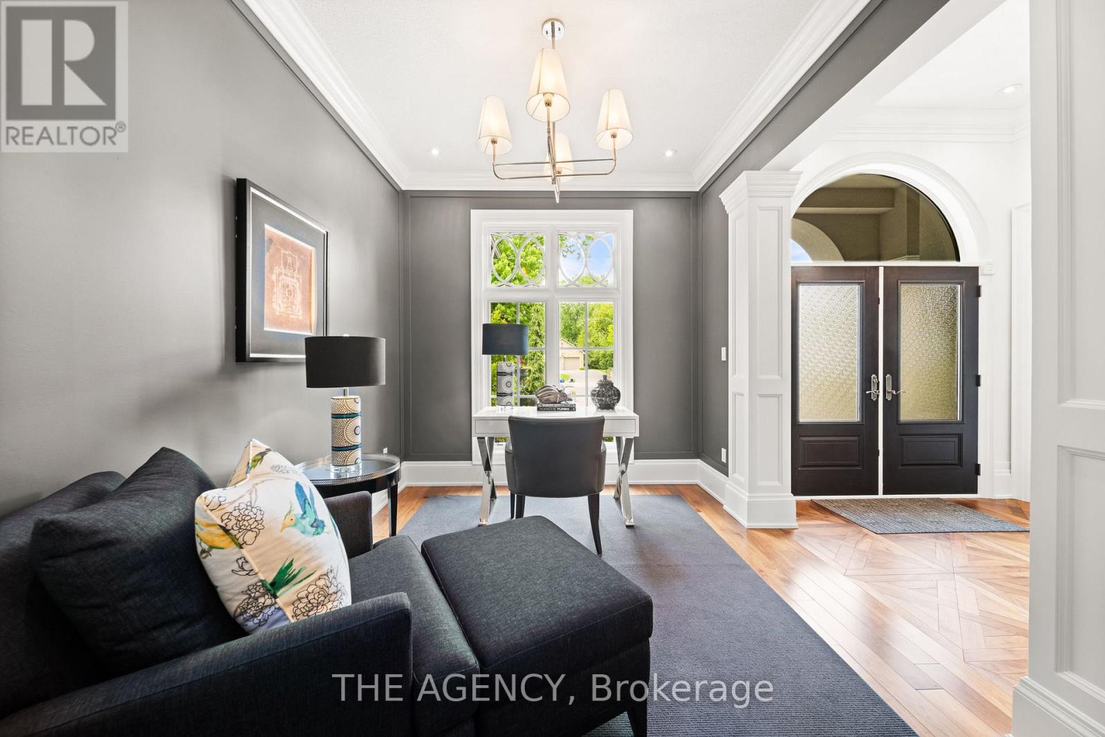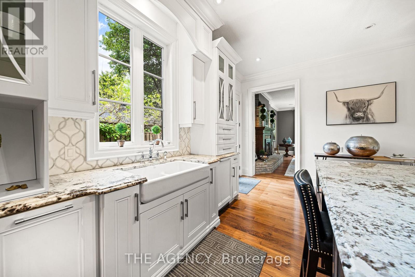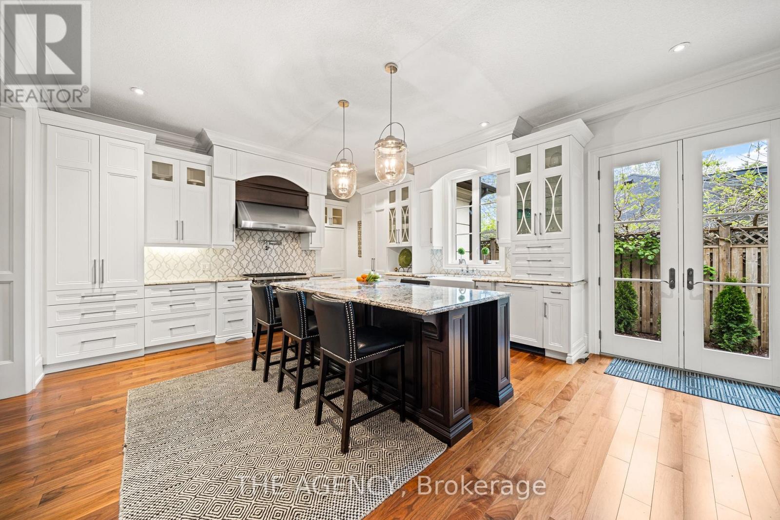 Welcome to this extraordinary bungaloft, nestled on a private, wooded lot and offering the perfect balance of luxury, function, and architectural detail. The main level impresses with 12-foot ceilings, walnut flooring and high-end finishes throughout. Tray ceilings in the formal dining room, coffered ceilings in key living spaces, and solid core doors enhance the sense of quality and scale. Expansive transom windows and high baseboards add architectural charm and natural light throughout. The main floor principal bedroom offers a serene retreat with tray ceilings, garden doors leading to the rear yard, and a stunning ensuite featuring marble tile with inlay, a freestanding tub, a glass-enclosed shower, dual vanities, and a spacious walk-in closet with custom built-ins and dual access. The family room is warmed by a wood-burning fireplace, while the separate living room offers a cozy natural gas fireplace. Two separate mudrooms-one off the front foyer and one off the garage-add everyday practicality to the homes thoughtful layout. The kitchen features premium Wolf appliances, a farmhouse sink, pot filler, and a large island with seating. The adjacent servery includes a fridge, wall oven, microwave, and a secondary sink-ideal for hosting. Upstairs, the loft provides a versatile living area, two generously sized bedrooms, and a beautifully finished main bath with a double vanity, freestanding tub, glass shower, and elegant tile inlay flooring. The lower level adds versatility with two additional bedrooms and rough-in. A walk-up to the triple car garage enhances convenience and supports multi-generational living. Outside, enjoy a private, two-tiered backyard oasis with a covered rear porch, perfect for relaxing or entertaining. The expansive driveway offers parking for up to eight vehicles, in addition to the spacious triple car garage with built-in storage, completing this exceptional property. (id:4555)