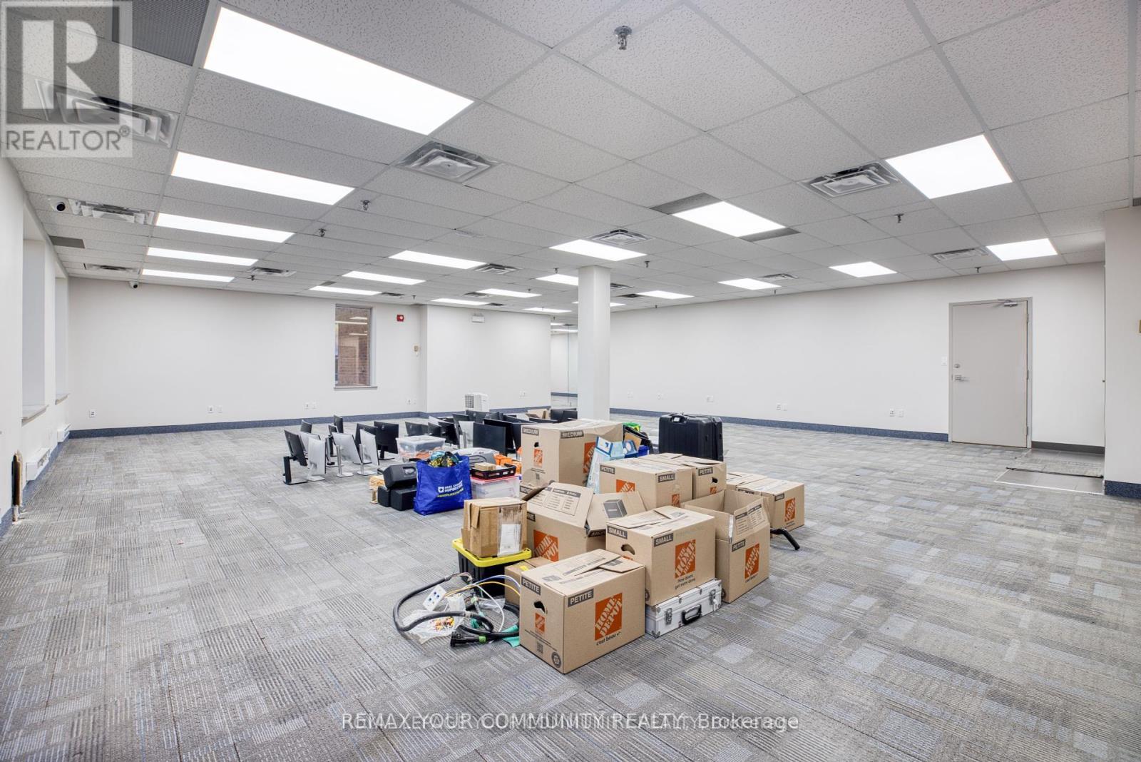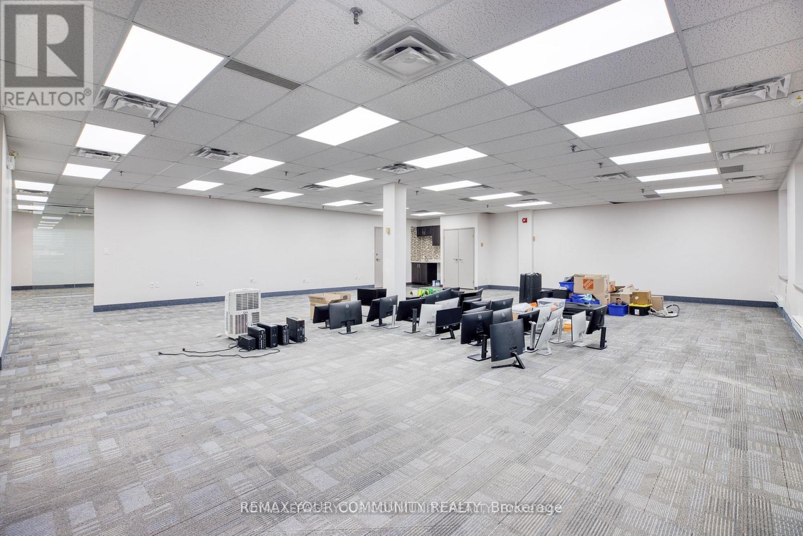 Rare opportunity to acquired an extra large, custom built with 2 standard units, combined professional office (1322 sqft of useable space) in demand Markham location. Minutes to Hwy 400,407,401, major shopping plazas, Costco, banks, restaurant, transport routes. Value offered in much below the replacement cost, makes it a sound investment. TOP FLOOR, spacious and bright, highly functional unit. Superior floor plan incorporating offices, 2 meeting rooms with glass walls, and a storage room. Large open workplace, allow for multiple desks, complimented by two more full size private offices (one with glass wall and glass door entry). Good security in the building and outside with multiple cameras, timed-in entry system. More than 200 surface parking spaces, plus some underground spots, free outdoor visitor parking. Freshly, re-painted, updated and cleaned and ready for turn-key possession. Ideal for multiple professional uses like: law firms, accounting, realty companies, tutoring/commercial schools, medical, acupuncture, wellness centre, spa, etc...) Reasonable maintenance fee includes all utilities. HST is in addition (commercial property). Min 5% deposit with certified funds. Note the measurements: Workspace: 40'10" x 25'6", 1st office: 15'5" x 10'11, 2nd: 14'5" x 9'6", 3rd: 15'5" x 8'4", electrical room: 9'8" x 6'9", Storage Rm: 5'5" x 4'3". All measurements, financials to be verified by Buyer, Buyer's Realtor. (id:4555)