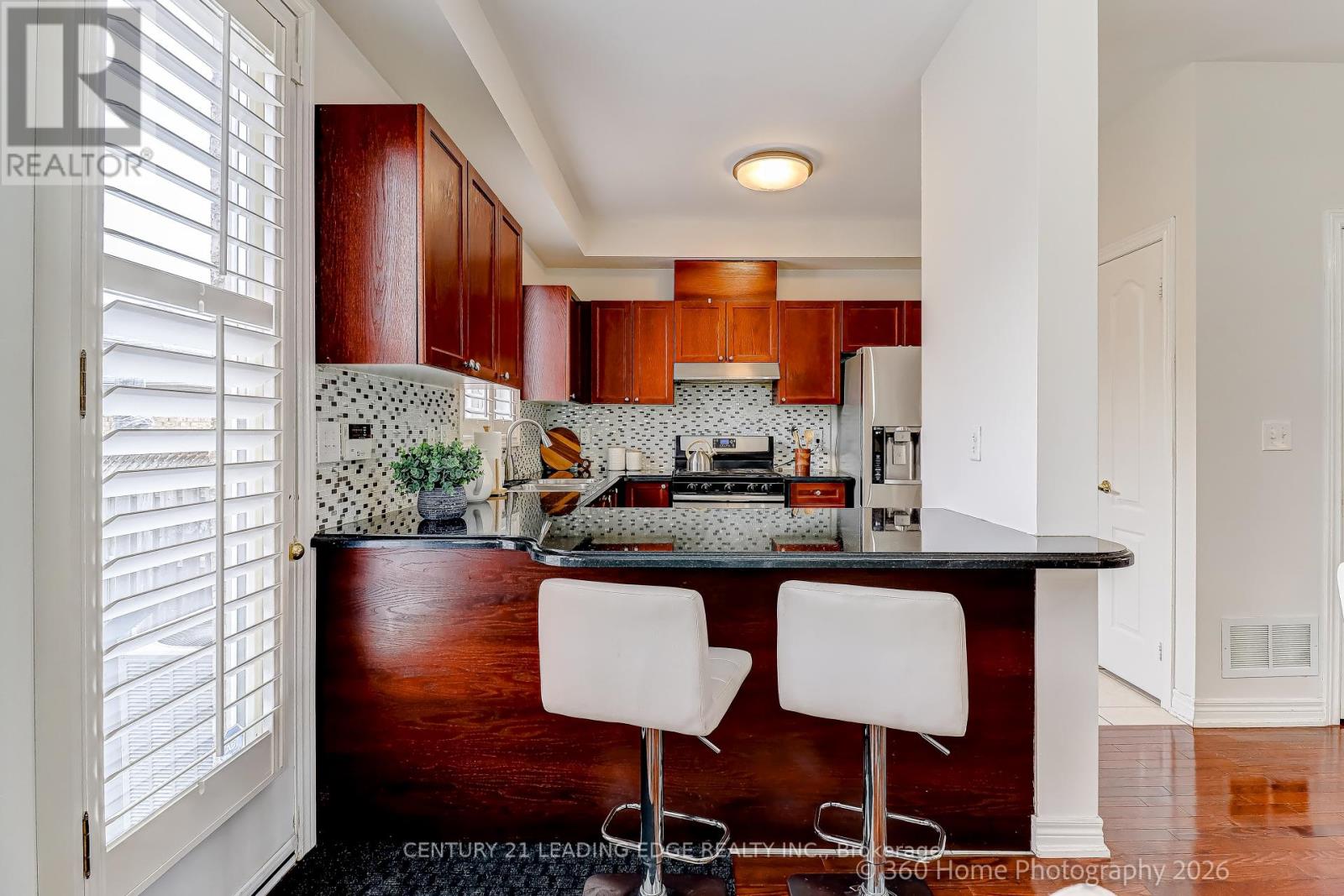 Welcome to this immaculate home. This tastefully painted and updated townhouse offering a warm and welcoming atmosphere from the moment you step inside. Enjoy a practical, open-concept layout with 9 ft ceilings, hardwood floors on the main level, a cozy gas fireplace, and granite kitchen countertops, perfect for both everyday living and entertaining. Large windows with California shutters provide plenty of natural light while maintaining privacy. Upstairs, you'll find generously sized bedrooms, along with two full bathrooms and a convenient powder room on the main floor. The finished basement adds valuable extra living space, featuring a modern full bathroom with a rain shower, a large walk-in closet ideal for storage, plus an additional mid-sized closet for clothing. A double car garage, charming front porch, and prime location complete the package. Just minutes from Highway 407, shopping, medical facilities, library, community centre, hospital, parks, and top-rated schools. Move-in ready and perfect for families or professionals, this home has it all! (id:4555)