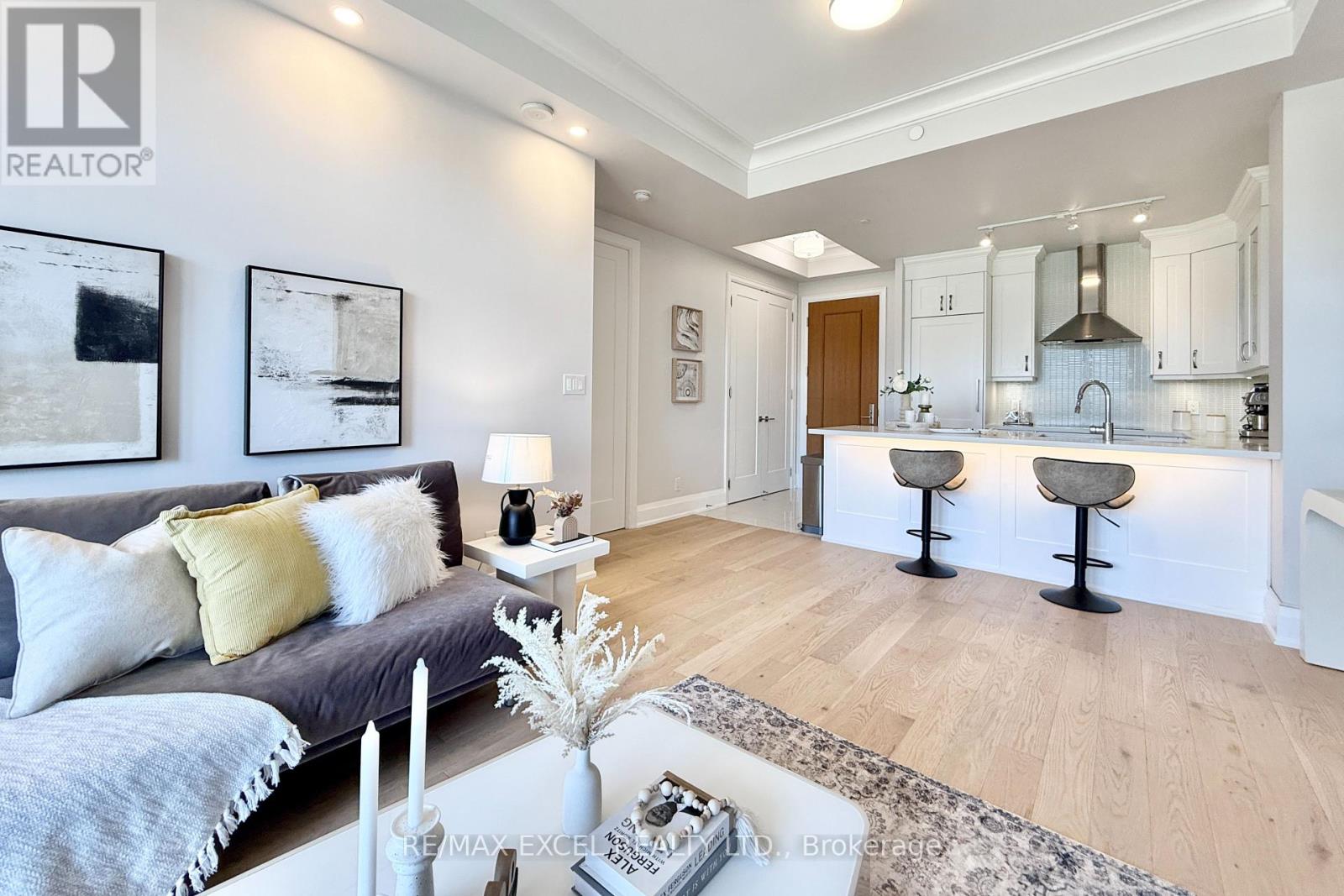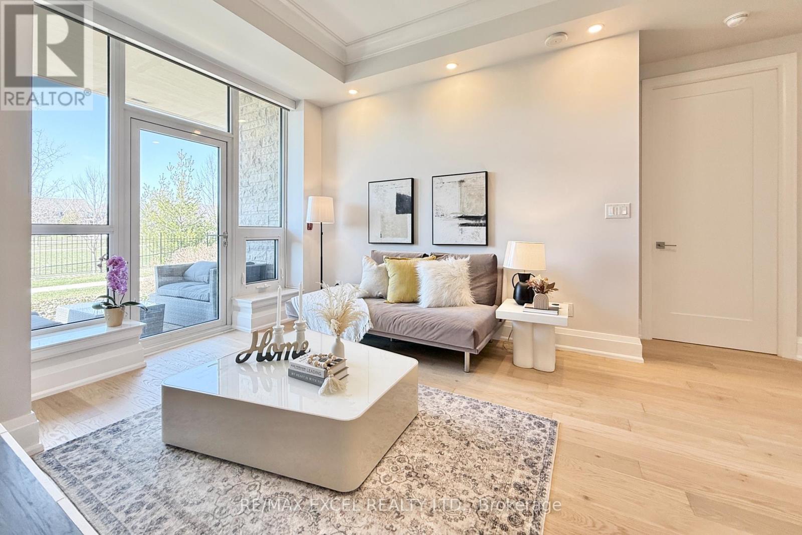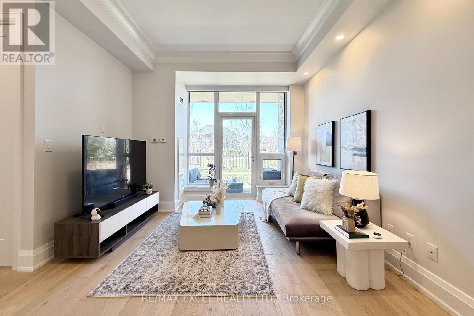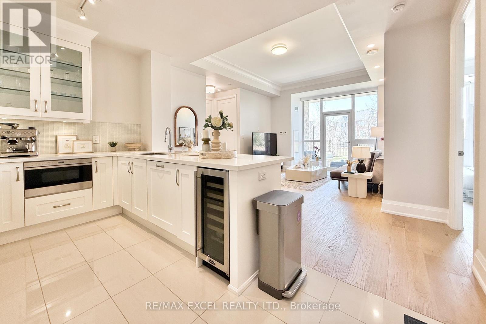 This stunning ground-floor suite offers the rare convenience of bungalow-style living, complete with a walkout to a large, private, tree-lined patio with paved stone. Immaculately maintained and entirely carpet-free, the home showcases extensive modern upgrades and high-end finishes throughout, including soaring 10-foot ceilings, elegant cornice moulding, upgraded 8-foot doors, and 7 1/4-inch baseboards. Rich, engineered hardwood flooring flows seamlessly through the open-concept layout, leading into a beautifully upgraded kitchen with custom extended cabinetry, quartz countertops, a glass backsplash, and premium Sub-Zero and Wolf built-in appliances, including a wine cooler. The suite also features in-suite security and includes one EV parking space and a locker. Residents enjoy access to exceptional building amenities, such as 24/7 concierge service, a two-level lounge with a cozy fireplace and walkout to a large terrace, and five-star resort-style offerings including meticulously maintained grounds, an outdoor infinity pool, and a patio with BBQ area. Additional amenities include a spacious party lounge with bar, kitchen, and dining area, a games room, a fully equipped fitness centre with yoga room, whirlpool and sauna, a guest suite, and both above-ground and underground visitor parking. Conveniently located just minutes from Highway 404 and within the top-ranking Pierre Elliott Trudeau High School district. (id:4555)