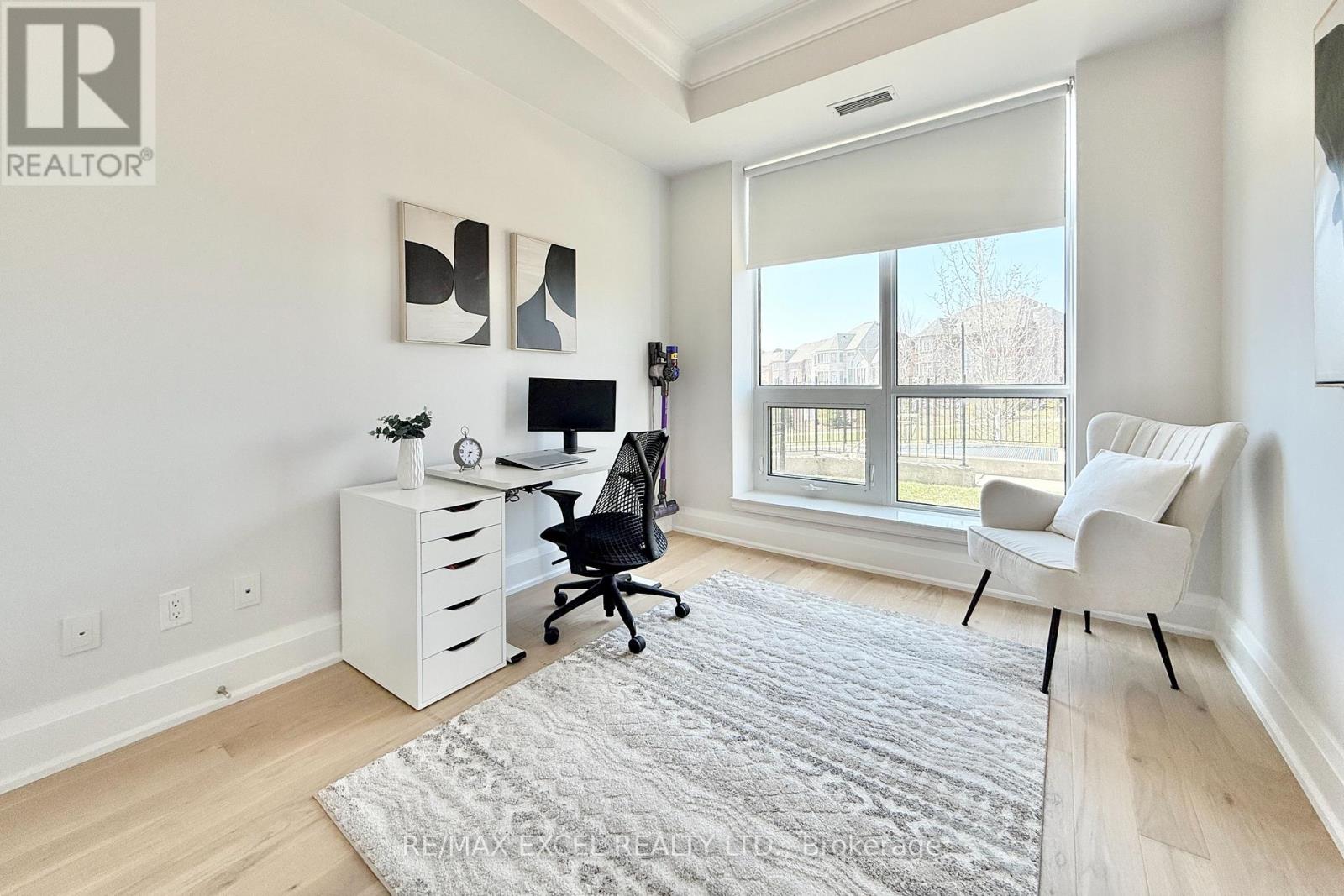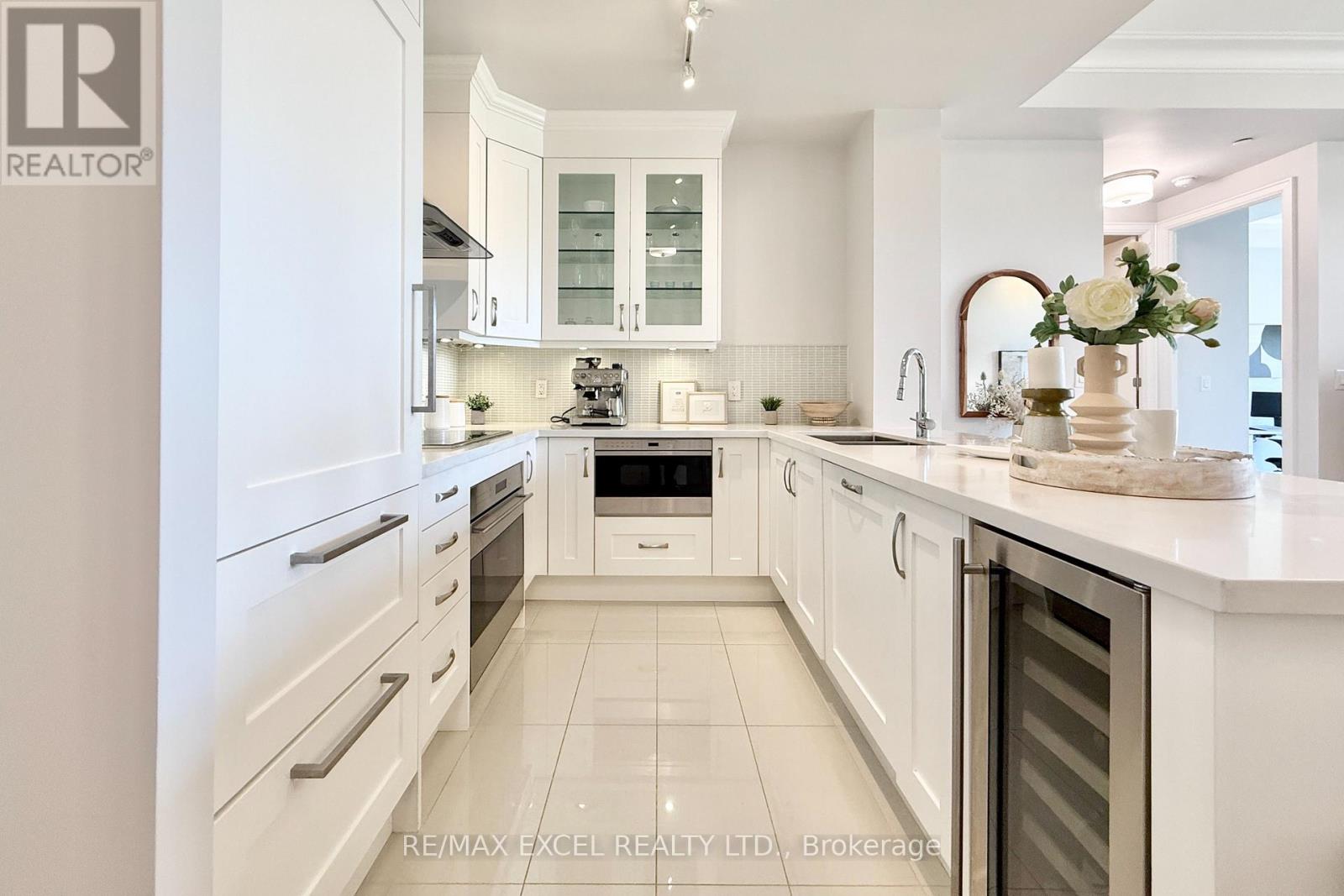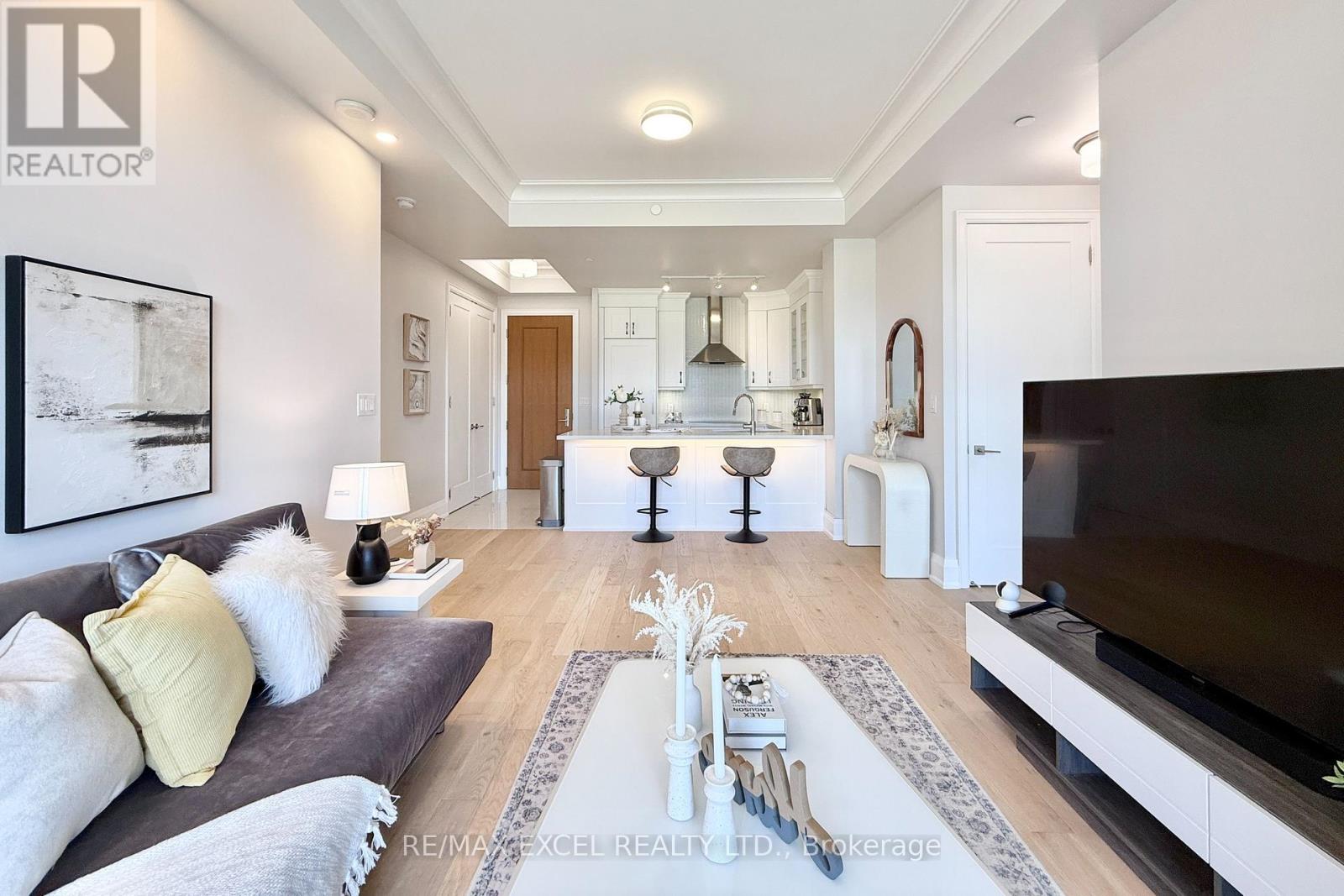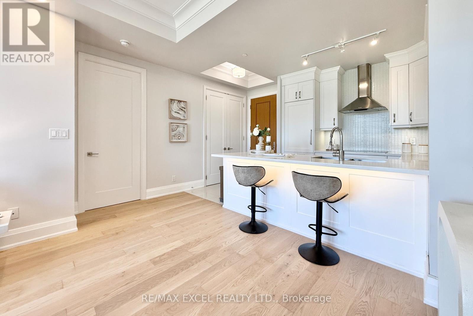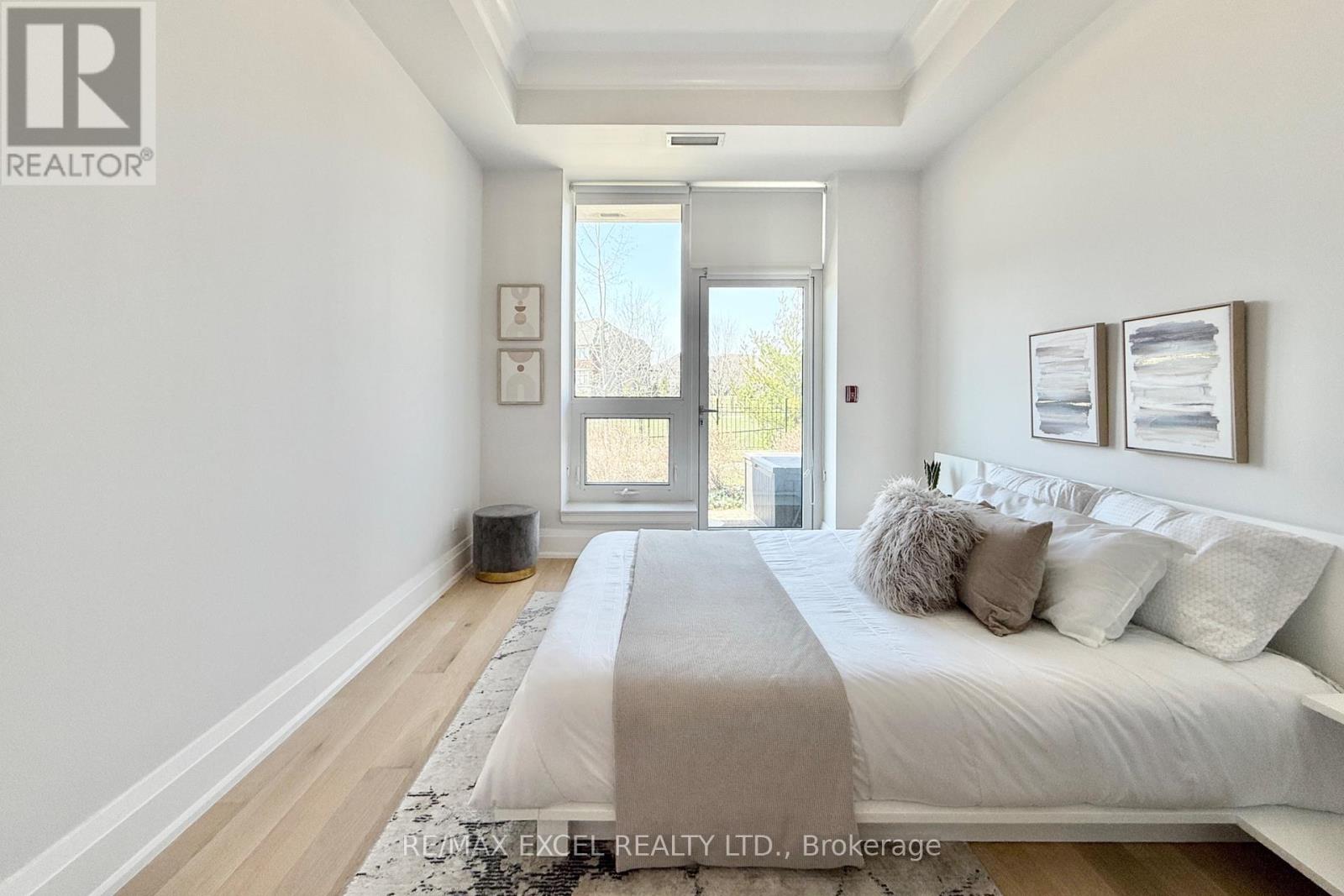 This stunning ground-floor suite offers the rare convenience of bungalow-style living, complete with a walkout to a large, private, tree-lined patio with paved stone. Immaculately maintained and entirely carpet-free, the home showcases extensive modern upgrades and high-end finishes throughout, including soaring 10-foot ceilings, elegant cornice moulding, upgraded 8-foot doors, and 7 1/4-inch baseboards. Rich, engineered hardwood flooring flows seamlessly through the open-concept layout, leading into a beautifully upgraded kitchen with custom extended cabinetry, quartz countertops, a glass backsplash, and premium Sub-Zero and Wolf built-in appliances, including a wine cooler. The suite also features in-suite security and includes one EV parking space and a locker. Residents enjoy access to exceptional building amenities, such as 24/7 concierge service, a two-level lounge with a cozy fireplace and walkout to a large terrace, and five-star resort-style offerings including meticulously maintained grounds, an outdoor infinity pool, and a patio with BBQ area. Additional amenities include a spacious party lounge with bar, kitchen, and dining area, a games room, a fully equipped fitness centre with yoga room, whirlpool and sauna, a guest suite, and both above-ground and underground visitor parking. Conveniently located just minutes from Highway 404 and within the top-ranking Pierre Elliott Trudeau High School district. (id:4555)