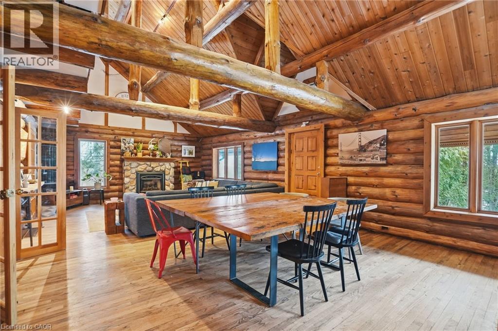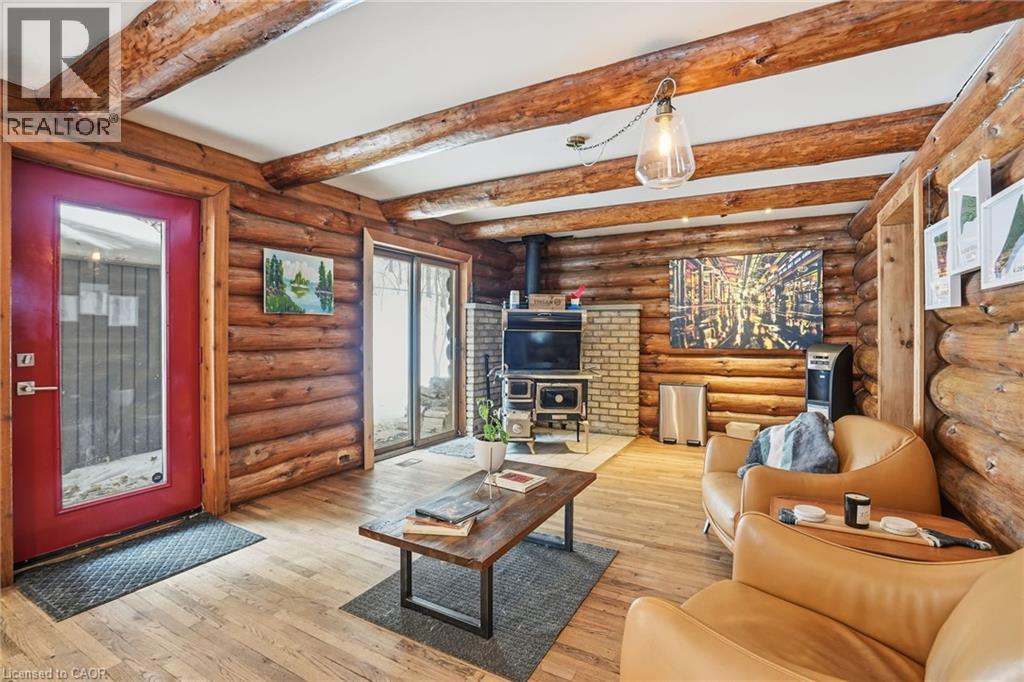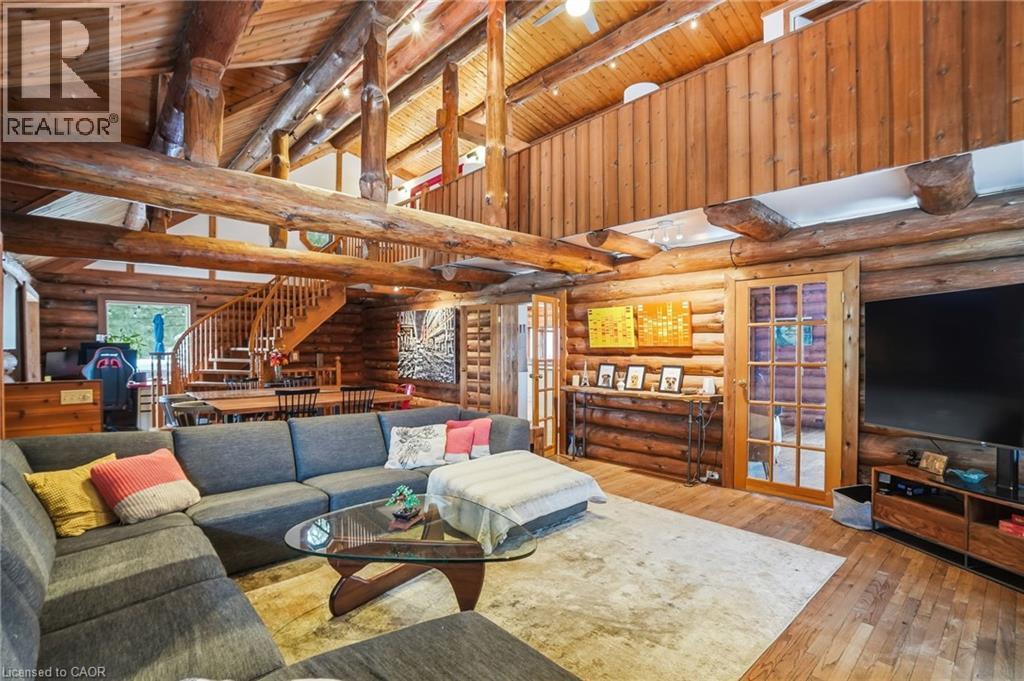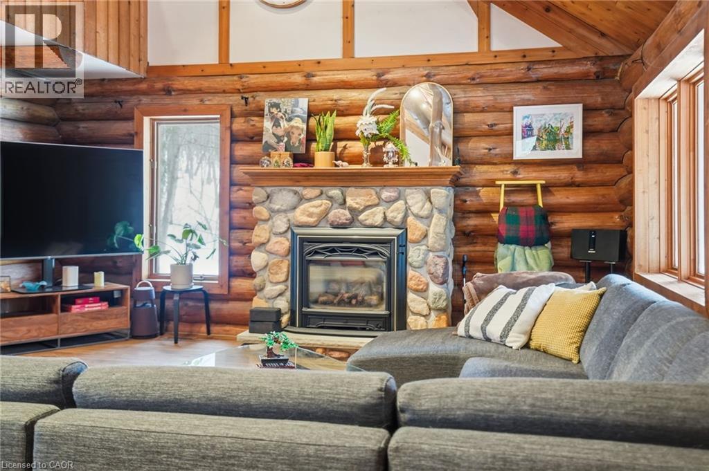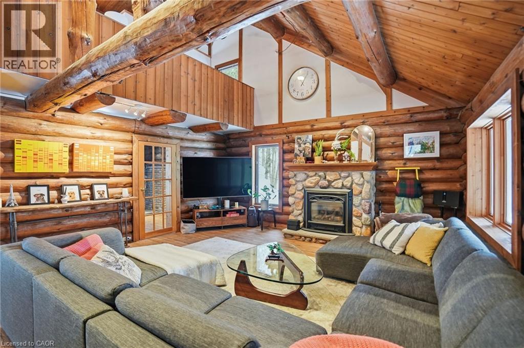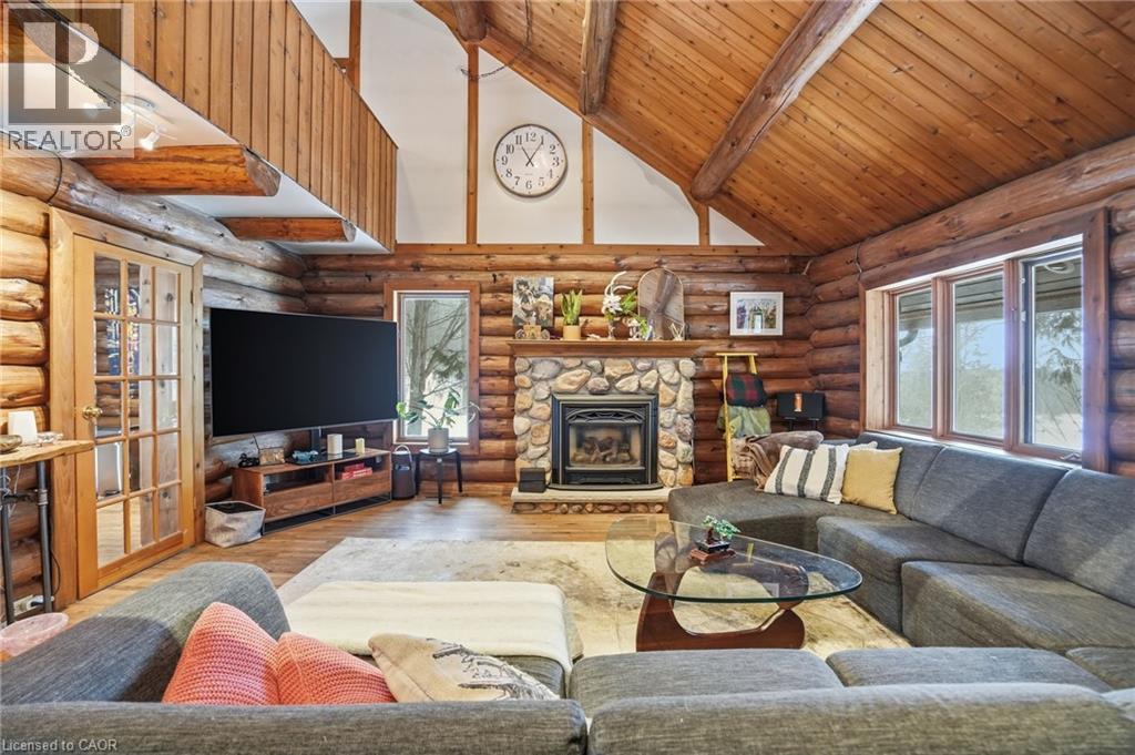Introducing this beautifully crafted 1,771 square foot log bungaloft offering the perfect blend of rustic charm and modern comfort in a peaceful country setting. Soaring vaulted ceilings with exposed log beams create a warm and inviting first impression in the massive living and dining area, complete with a cozy gas fireplace. The spacious kitchen features abundant counter space and overlooks the welcoming family room warmed by an Elmira wood stove, ideal for gatherings year-round. Step outside to enjoy two separate decks, one off the family room and another off the kitchen, perfect for entertaining or relaxing in nature. The upper-level primary retreat offers a generous walk-in closet; large enough to double as a nursery or home office and a beautifully renovated ensuite with dual vanities and a glass-enclosed shower. The finished walk-out lower level adds exceptional living space with two well-sized bedrooms, an updated 3-piece bath and a comfortable rec room with its own gas fireplace. Outdoors, you’ll find a detached single-car garage, a charming chicken coop and a powered shed with 100-amp service—originally planned as a home office. A concrete pad is ready for your future hot tub, while walking trails right at your doorstep complete this serene and private country lifestyle. This is more than a home—it’s a retreat. Don’t be TOO LATE*! *REG TM. RSA. (id:4555)