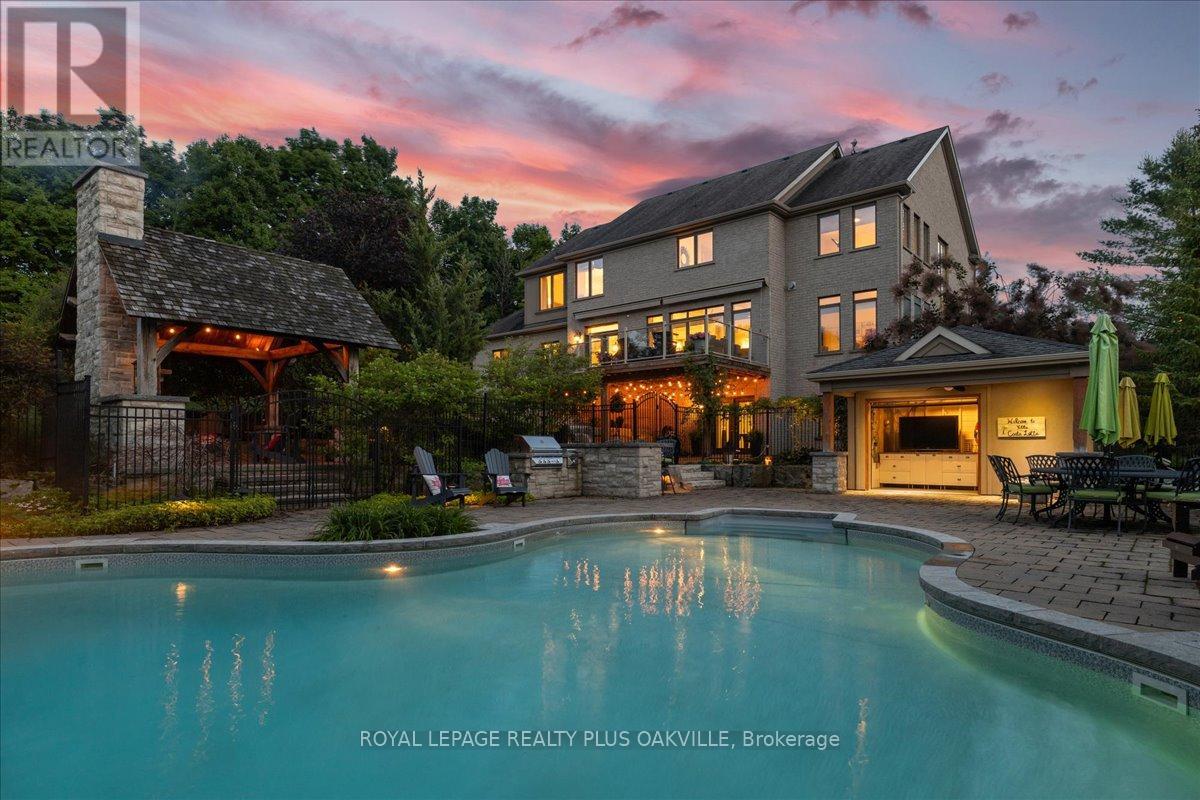 Beautifully designed executive home offering over 5,700 sq ft of finished living space on a quiet court, with exceptional privacy and stunning treed views. The spacious main floor features an entertainers gourmet kitchen with full fridge and freezer, 48-inch range, hidden coffee bar, and an oversized island with seating for six+. The kitchen opens to the eat-in area and living room with hand picked stone fireplace, plus a formal dining room that seats 16+. Main-floor laundry and a convenient three-car garage with large driveway parking for approximately 8 cars. Upstairs you'll find five generous bedrooms and three full baths, including a luxurious primary suite with oversized ensuite, two walk-in closets, and a private exercise room. A second bedroom with its own ensuite is perfect for guests or family. The finished walk-out basement is designed for entertaining, with a full bar, pool table area, dance room, bathroom, and plenty of storage. Step outside to your backyard oasis featuring a sparkling pool with waterfall, diving rock, and fountains. Enjoy both a dedicated pool house and a separate outdoor living room with stone fireplace and cedar shake roof. Host gatherings at the built-in poolside barbecue and bar area, all surrounded by mature trees for ultimate seclusion. Natural gas is at the property rare for country living! (id:4555)
