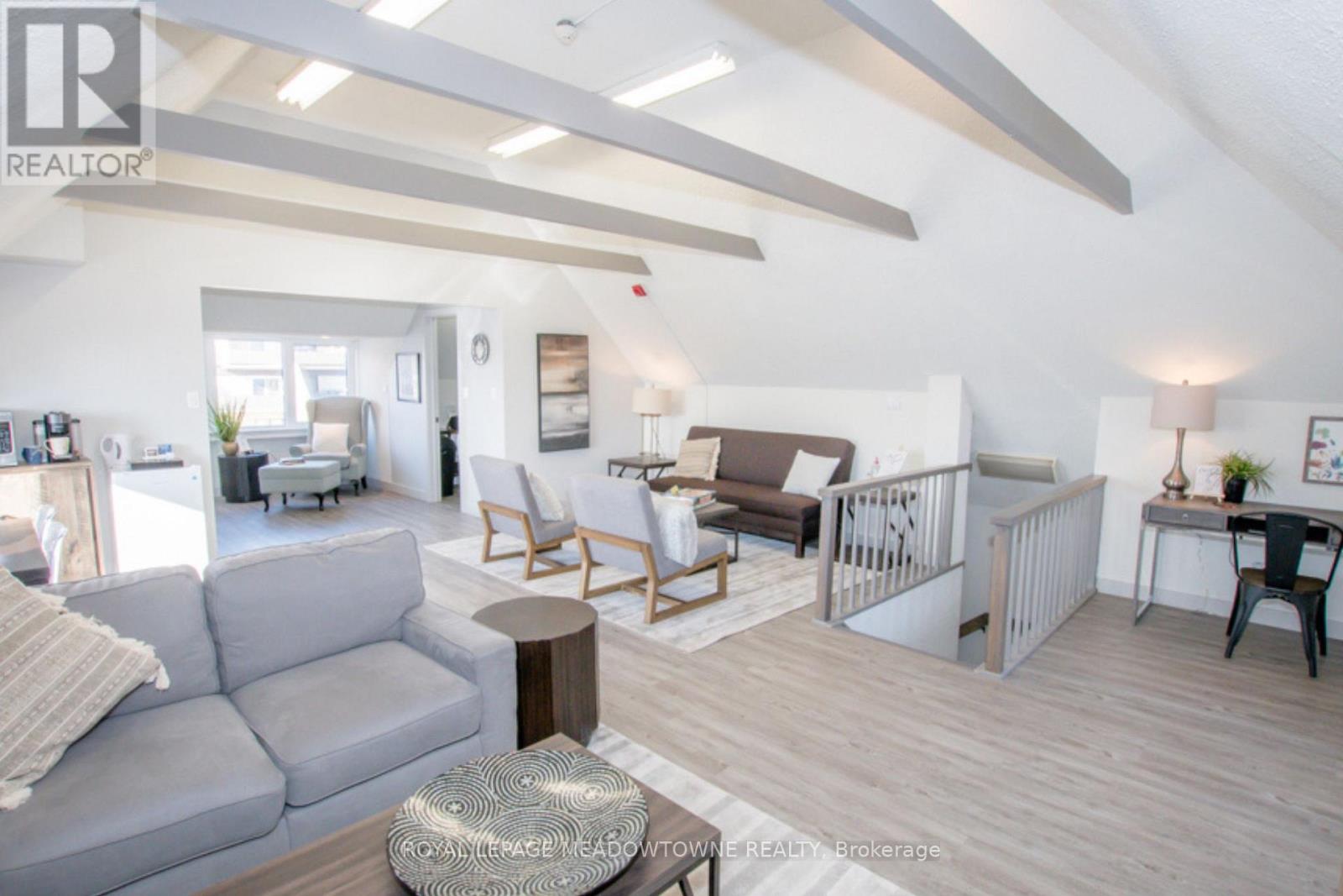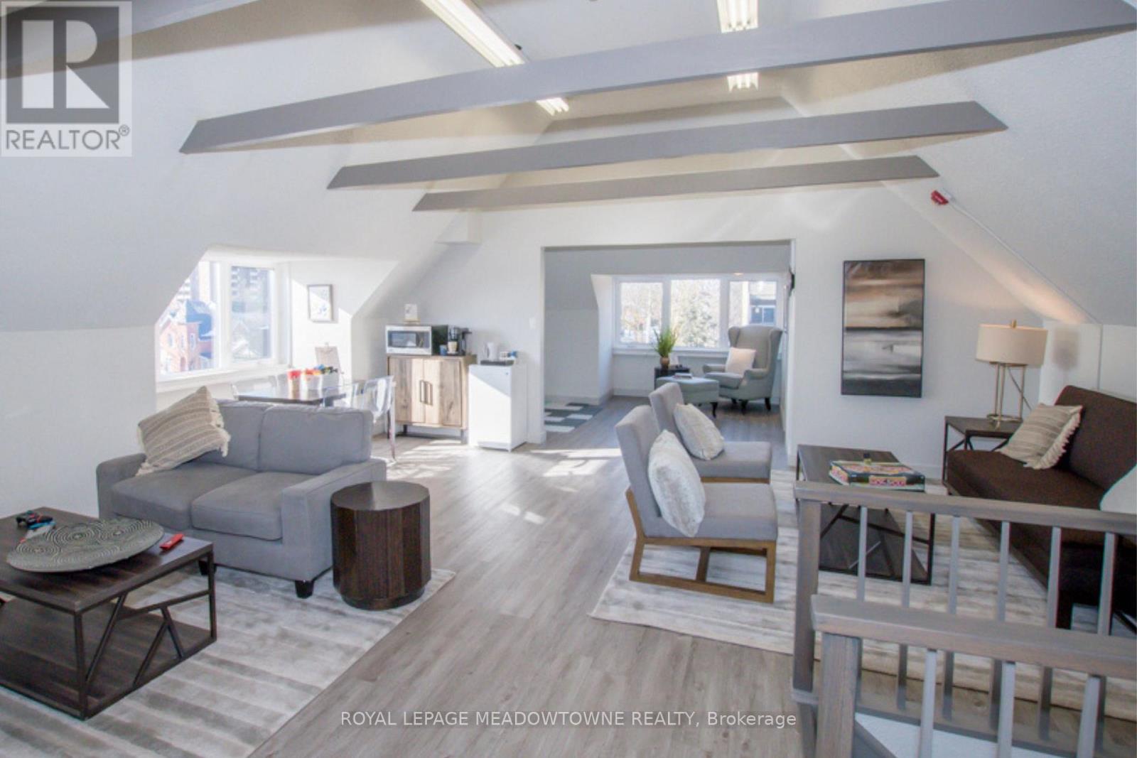 This bright, peaceful upper level office on a corner lot in downtown Milton offers an open-concept layout suitable for private sessions, counseling, or creative work. Highly visible on Main Street, the third-floor loft space is ideal for a business seeking a calm, client-friendly setting. Some furniture can be included. The suite also contains high 10'10"ceilings, its own private bathroom and laminate flooring. Located at 350 Main Street East, this freestanding downtown building offers excellent exposure, ample client parking in front and back, and walkable access to cafés, GO STATION and services. Accessed by a private side entrance shared with the 2nd floor professional. (id:4555)