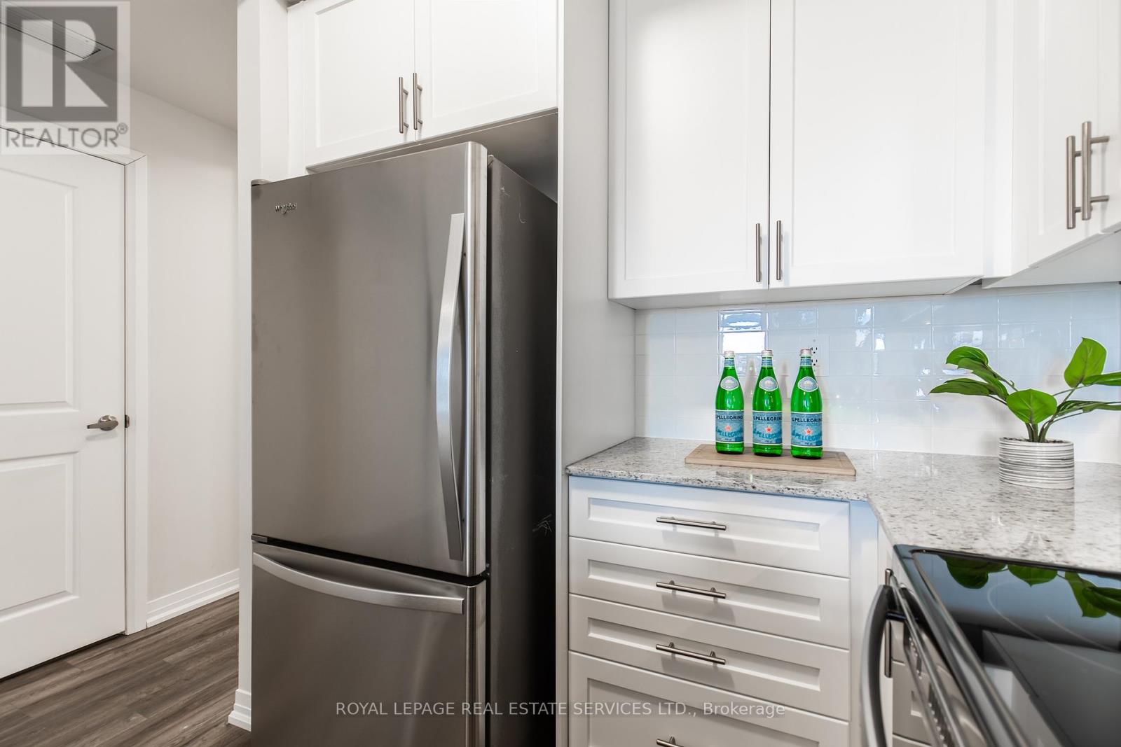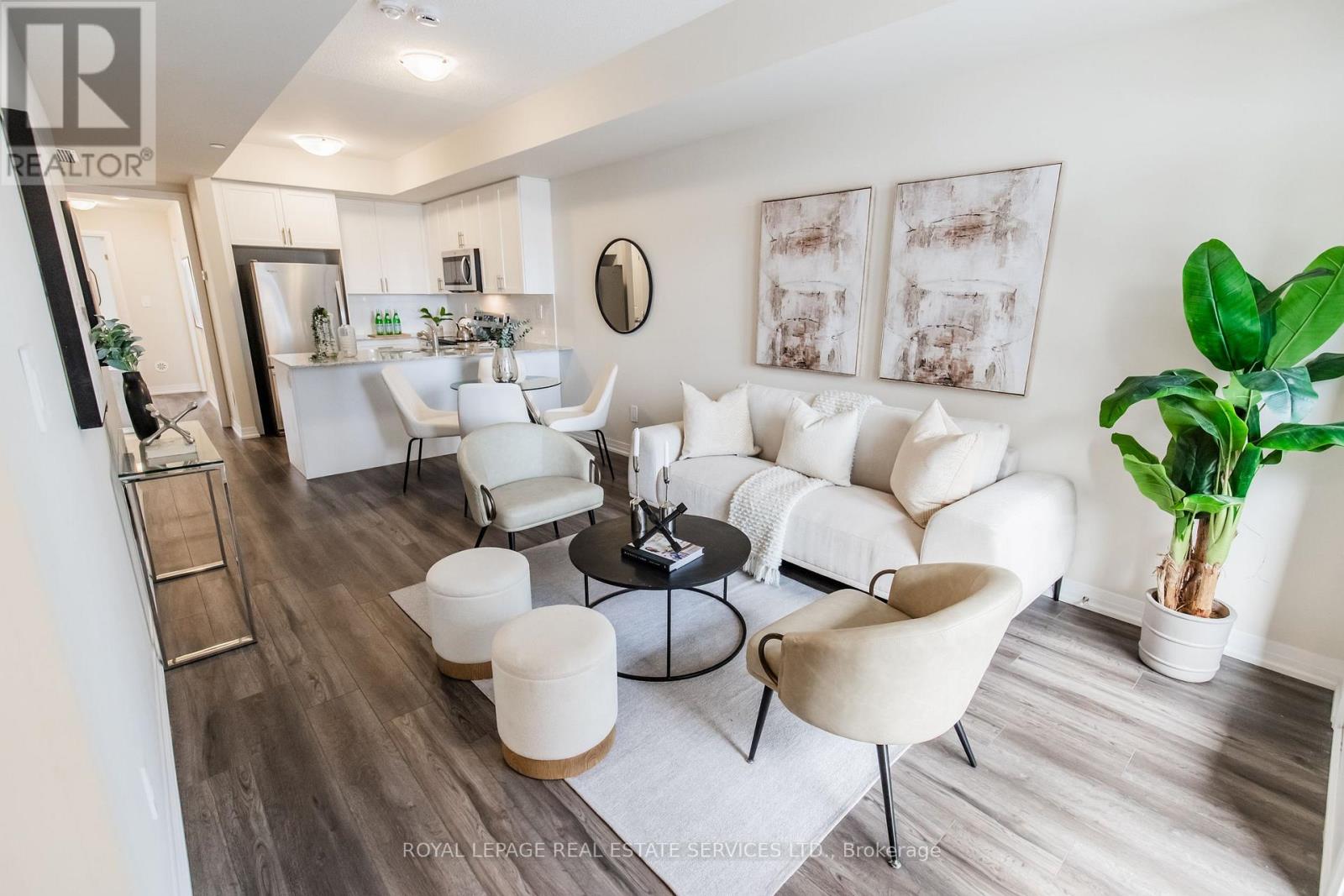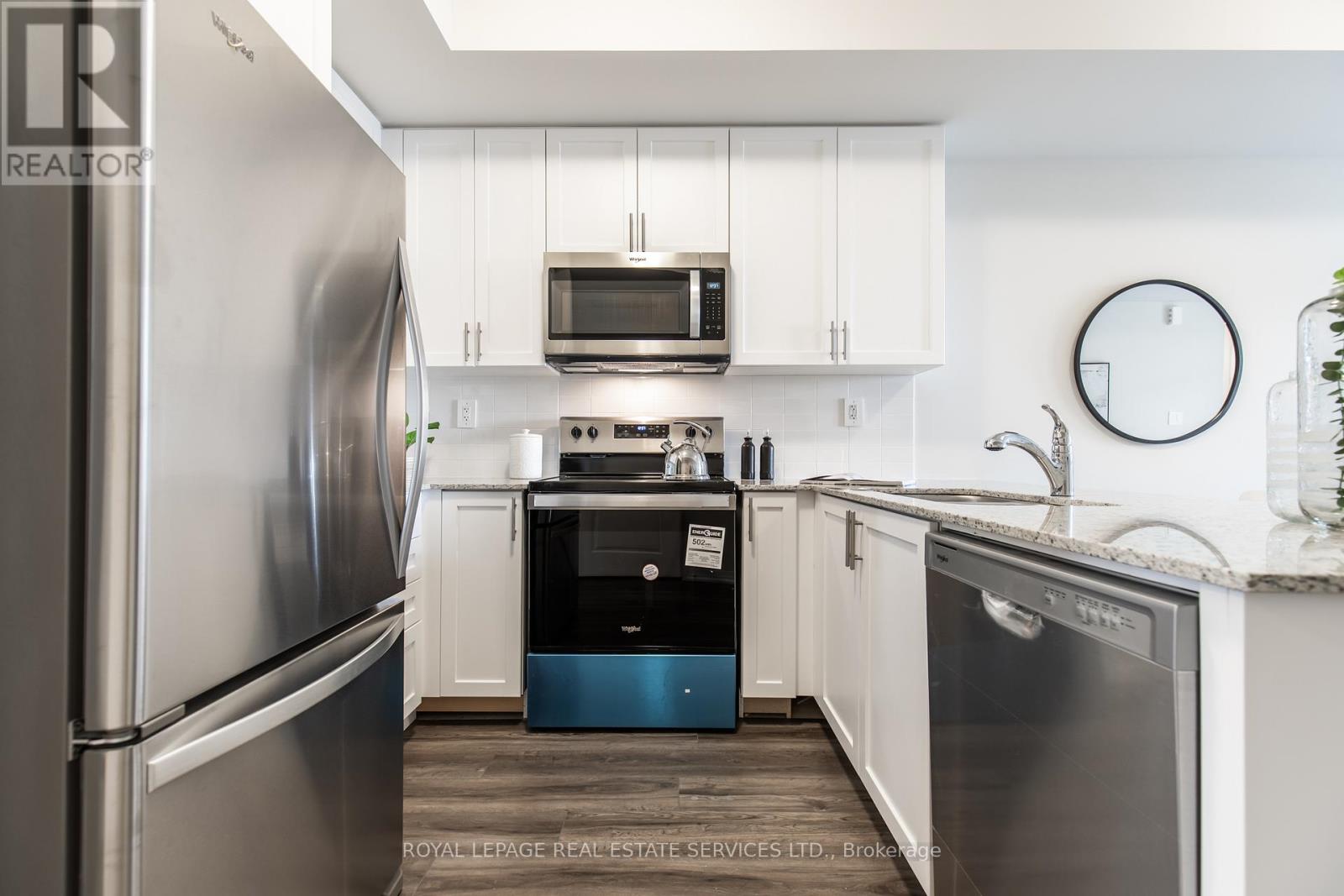 Be the first to live in this 1 year old Fernbrook built, main floor unit featuring 2 bedrooms plus 2 full bathrooms. Carpet free. NO STAIRS! Spacious private balcony. White kitchen featuring a breakfast bar, stainless steel appliances, granite countertops with white subway-tile backsplash, coupled with plenty of room for storage in the large utility closet. The sizeable primary bedroom features a walk-in closet and an ensuite bathroom with a stand-up shower. Comes with 1 parking spot and 1 locker. Ideal family-friendly location. Close to great schools and parks. Close to Sobeys plaza, Hwys, Milton GO, Wilfrid Laurier University Milton Campus, Milton & Oakville Hospitals, Niagara Escarpment, Rattlesnake Point Golf Course and more. Please note unit is no longer staged. It is now empty. (id:4555)