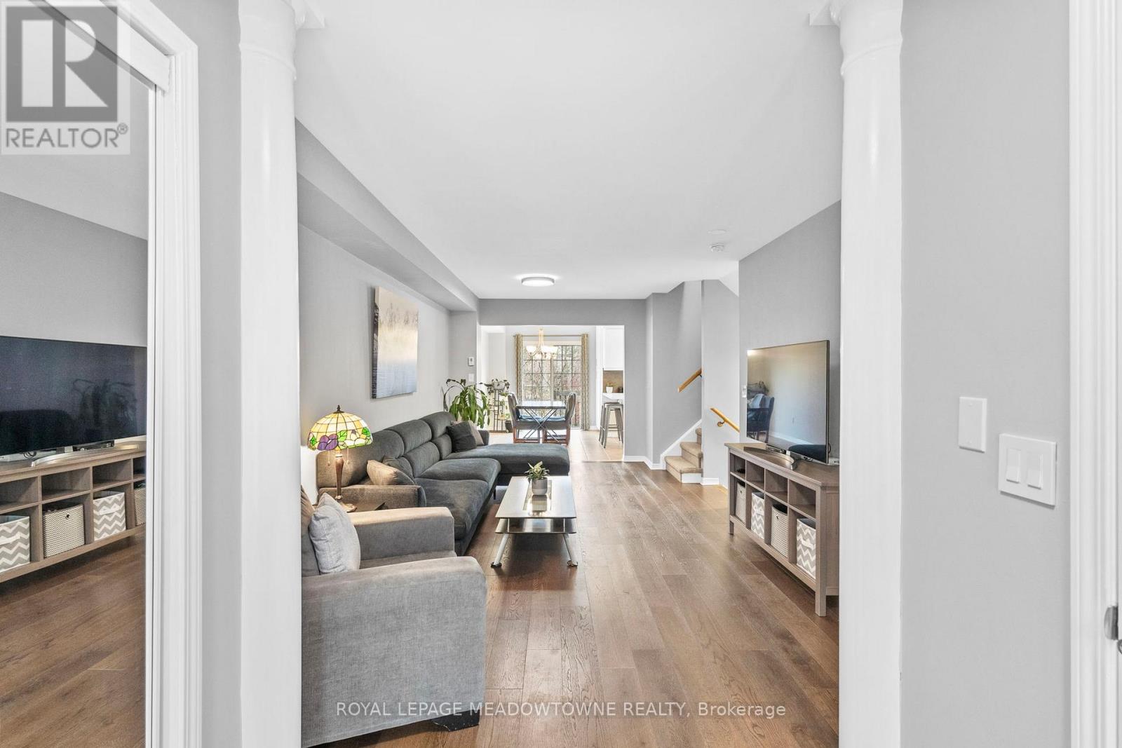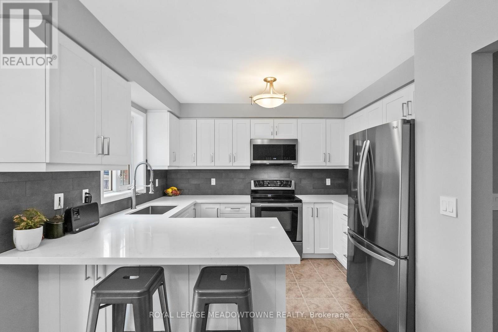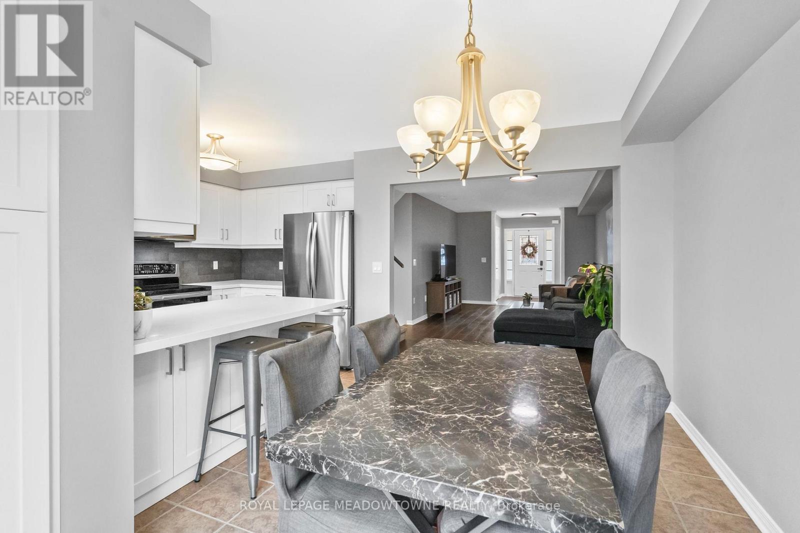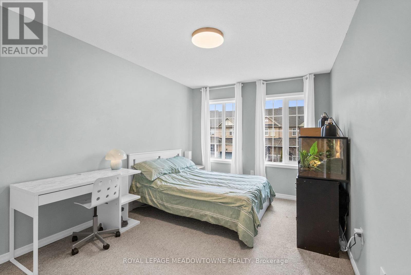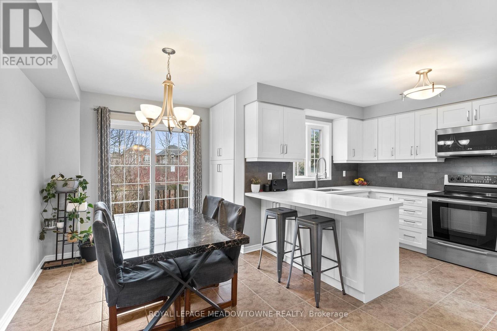 Carlton model townhome with 1,715 sq ft of living space. Backs onto mature trees and a neighbourhood park with no rear neighbours. Renovated "Adore Your Kitchen" with pantry, breakfast bar, backsplash and new appliances. Open concept main floor. 3 bedrooms, 3 bathrooms including 2 full upstairs. Convenient second floor laundry. Finished basement with rare, functional storage space. Quiet, low-traffic street. Walk to schools, parks, community centre, arts centre and GO. Parking for 3 cars. (id:4555)