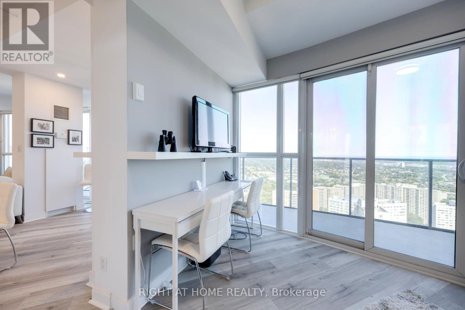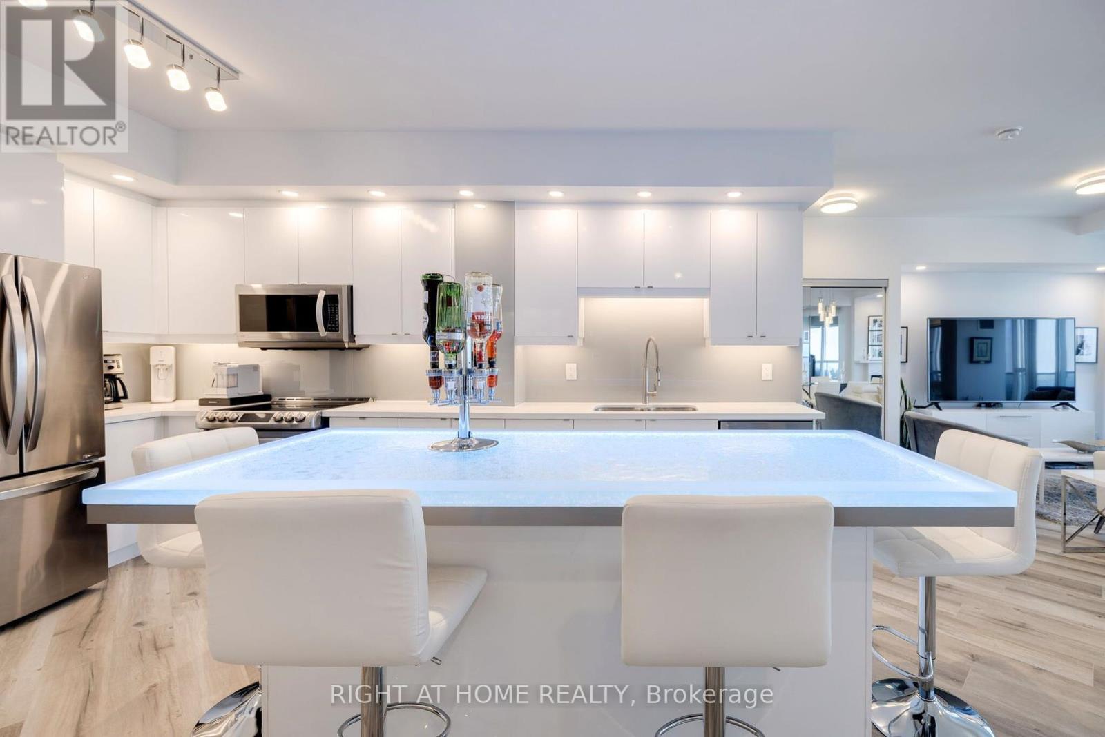 Experience modern luxury like no other. This fully renovated, 1170 sq. ft. contemporary suite + 225 sq. ft. wrap-around balcony, is unlike any other unit in the building offering a distinctive design and unmatched style. Enjoy panoramic, unobstructed views of the CN Tower and Lake Ontario right from your living space, or step onto one of the largest terraces at 60 Absolute, where southeast exposure brings you sunrises and breathtaking views every day. Located in the vibrant heart of downtown Mississauga, you're just steps from fine dining, Starbucks, Square One, Celebration Square, and the upcoming LRT with quick access to downtown Toronto. Designed for entertainers and modern living, the custom kitchen stands apart with over 30 sleek high-gloss cabinets, a custom tinted glass backsplash, and a spectacular 8-foot island with a textured glass LED-lit countertop, a true showpiece. Floor-to-ceiling windows flood every room with natural light and provide walkouts to the expansive terrace, blending indoor and outdoor living seamlessly. This residence also comes with access to world-class amenities including a state-of-the-art fitness centre, indoor and outdoor pools, basketball and squash courts, and 24-hour concierge service. This is not just another condo, it's a rare offering that combines bold design, modern finishes, and extraordinary outdoor space in Mississauga's most iconic address. Additional parking available for $35,000. Preferred Closing Date: May 1st, 2026 (Negotiable). Check out the building website at www.60absolute.ca (id:4555)