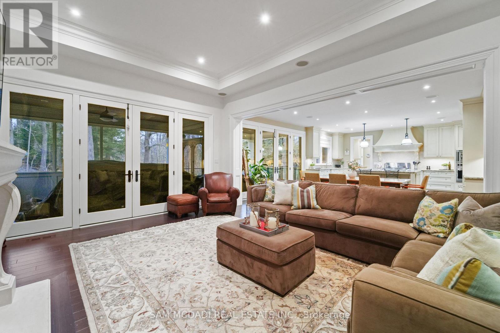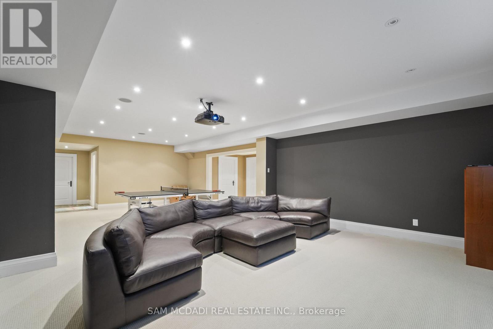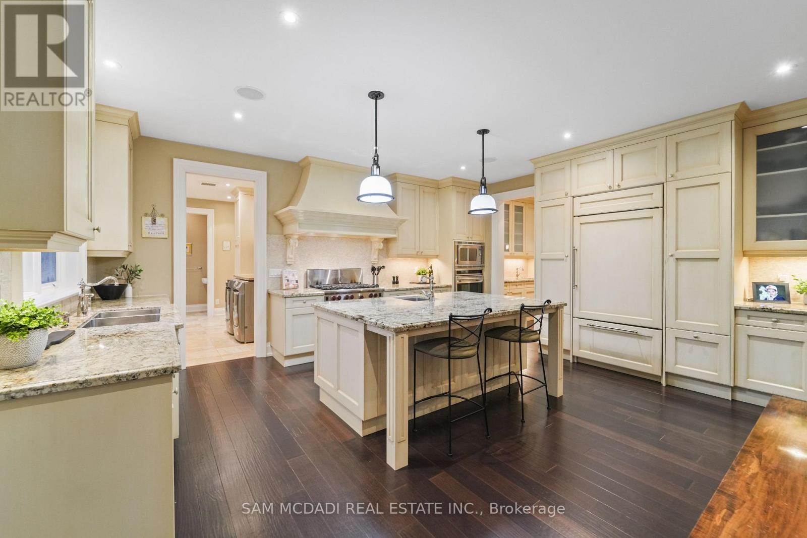 Architecturally distinguished custom residence designed by renowned designer David Small and masterfully built by Camilla Homes (2011), set in one of Mississauga's most prestigious neighbourhoods. This exceptional home showcases superior craftsmanship, thoughtful architectural detail, and seamless indoor-outdoor living.Flooded with natural light through Pella windows and doors and Velux skylights, the home features custom light fixtures, Hunter Douglas motorized blinds, and a fully integrated smart-home and audio infrastructure with wall-mounted control panels. The chef-inspired kitchen is equipped with premium appliances including Wolf gas and electric ovens, a Sub-Zero refrigerator, and a new Miele dishwasher (2025), ideal for both everyday living and entertaining.The family room offers a gas fireplace and integrated home theatre experience with surround sound, while the lower-level walkout basement significantly expands the living space with a dedicated theatre, a private nanny's room, an exercise room, secondary laundry, and direct access to the backyard. All five full washrooms are enhanced with heated floors for year-round comfort.Step outside to a private, resort-style backyard featuring a custom 16' x 34' heated saltwater concrete pool complete with three waterfall shears, a Polaris vacuum system, and an automatic security cover, all set within professionally landscaped grounds. The pool equipment is housed in a custom-built cabana, while artificial turf ensures low-maintenance outdoor living. A screened-in porch and walkout basement further enhance the home's exceptional indoor-outdoor flow.Additional highlights include central vacuum, ADT security with exterior video monitoring, multiple laundry areas, premium sound systems throughout, and a rare combination of luxury, technology, and timeless design. An outstanding opportunity for executive buyers seeking refined living in Mississauga. (id:4555)