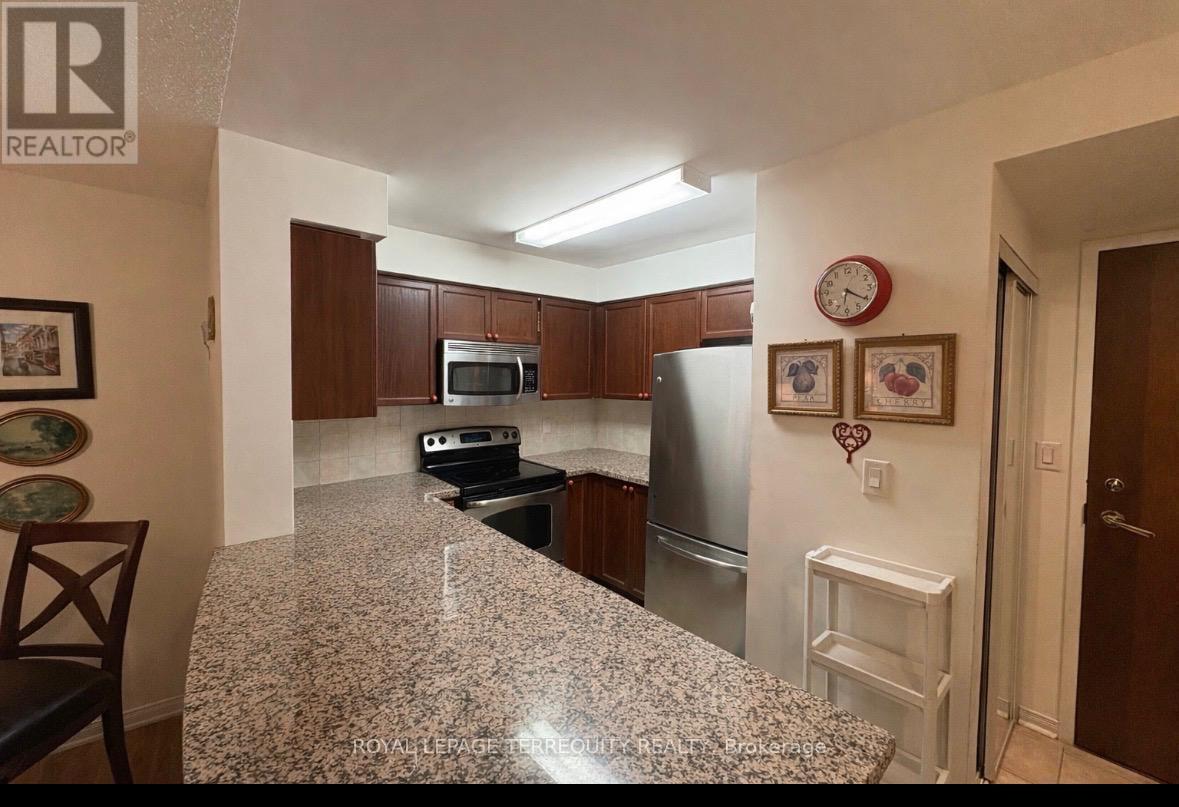 Highly Sought-After Eglinton & Glen Erin Location! Discover this stunning European-inspired 1 Bedroom, 1 Bath suite offering 600 sq. ft. of bright, thoughtfully designed living space, complete with 1 parking spot and 1 locker. Perfect for first-time buyers or those looking to downsize without compromise. The open-concept kitchen features granite counter-tops and a convenient breakfast bar, ideal for everyday living and entertaining. The spacious bedroom includes a large closet and almost floor to ceiling window, while the south-facing balcony fills the unit with natural light and offers a beautiful open view. Enjoy an exceptional lifestyle with resort-style amenities, including an indoor pool, fully equipped gym, sauna, virtual golf, and a rooftop terrace. The building also offers a gated entrance and 24-hour security for peace of mind. Steps to shopping, dining, entertainment, and transit-this is urban living at its finest. Don't miss this incredible opportunity! Please note that the photos were decluttered using AI, and the kitchen peninsula sink was not intentionally removed. (id:4555)