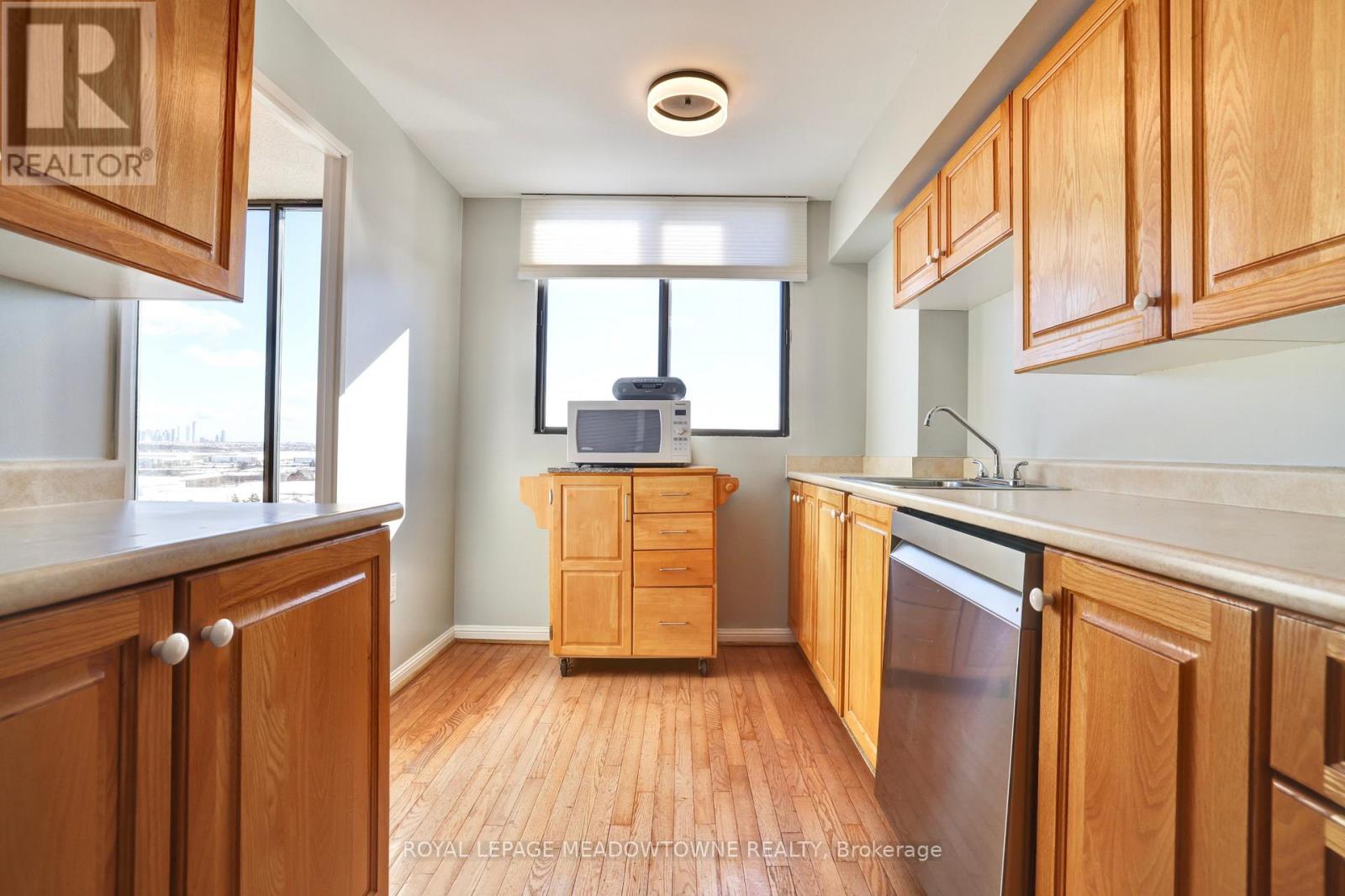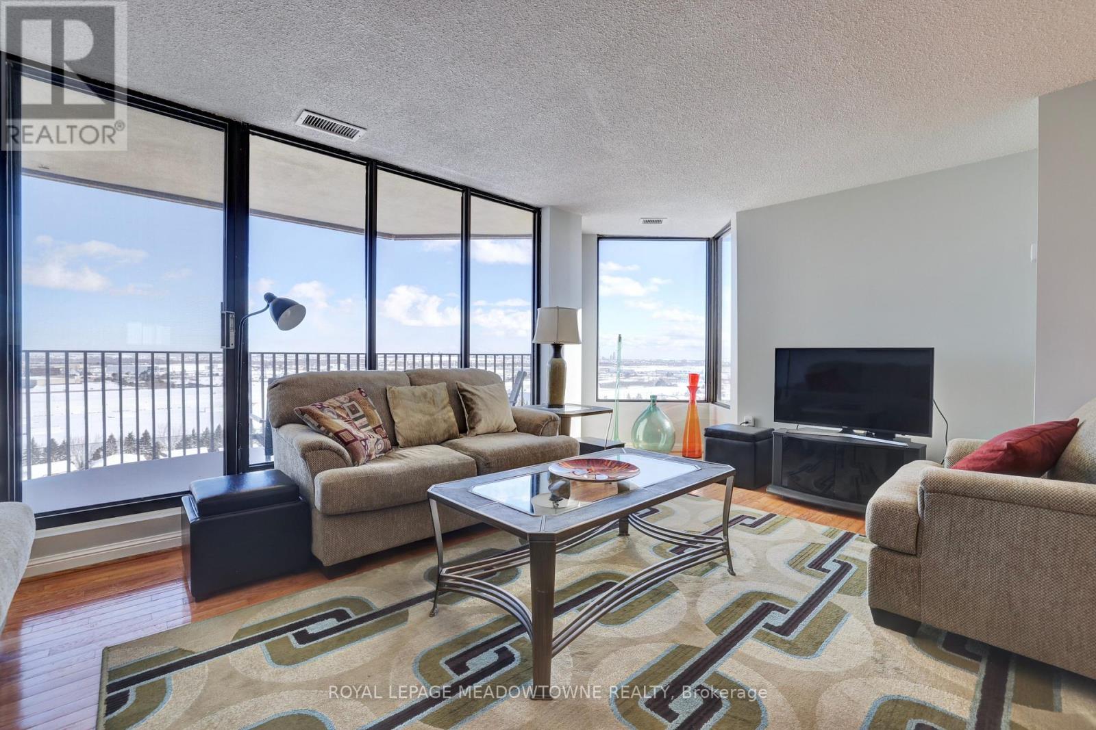 Experience elevated living with breathtaking, unobstructed views of Mississauga's skyline and beyond. This spacious three-bedroom condominium is situated on the top floor of one of Mississauga's most desirable residences. The home features elegant hardwood flooring throughout, including the kitchen, and a generous main living area highlighted by a sunken living room. Enjoy the convenience of brand new stainless steel appliances-including refrigerator, stove, and dishwasher. The primary bedroom offers a ensuite bathroom and a walk-in closet, complemented by a well-appointed family bathroom on the main floor. Three dedicated parking spaces are included for your comfort. Nestled within the Parkview building, residents are surrounded by lush parkland, scenic walking trails, and the tranquil beauty of Lake Aquitaine. The location provides easy walking access to shops, schools, Meadowvale Theatre, Meadowvale Recreation Centre, and more-delivering everything needed for modern, convenient living. (id:4555)