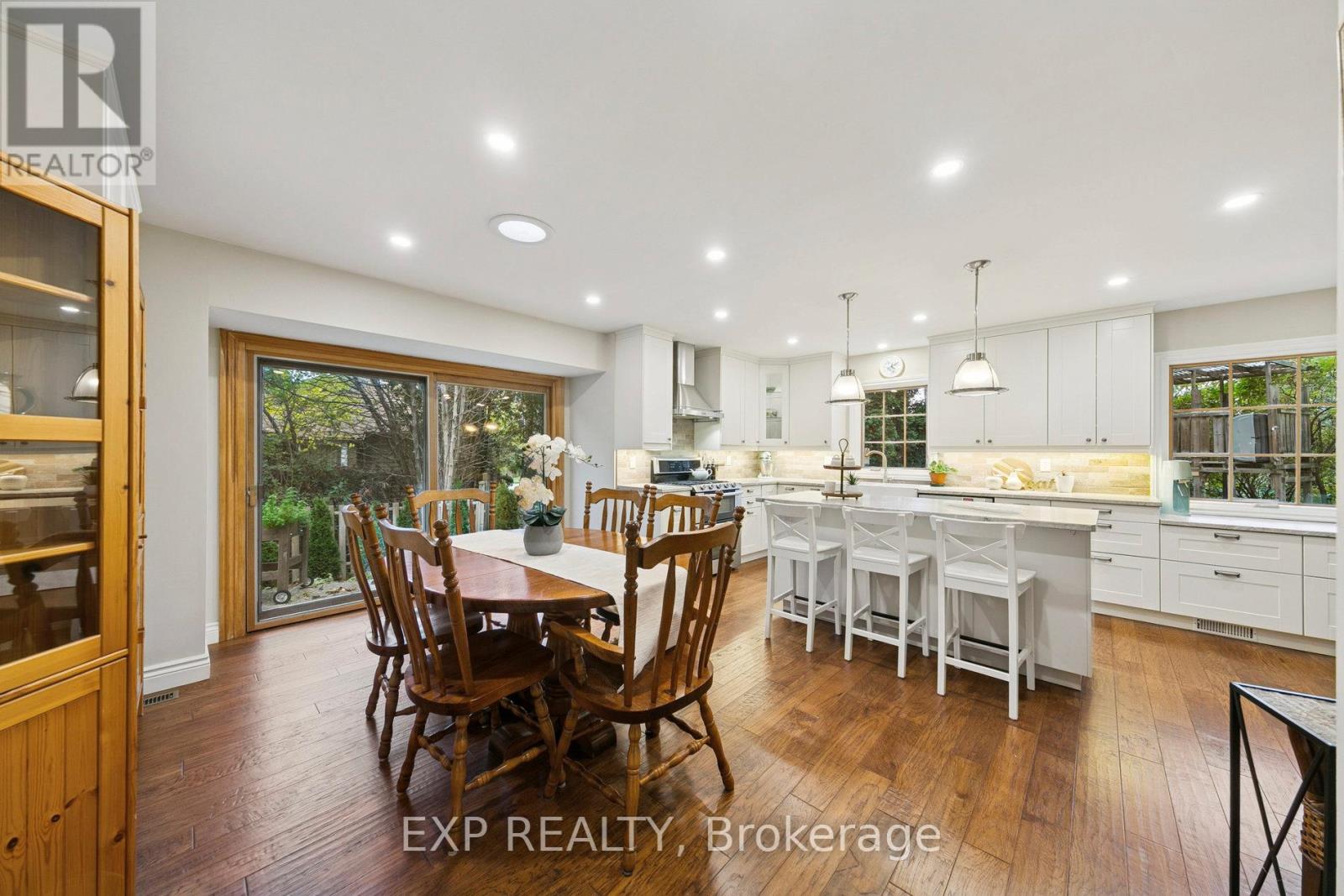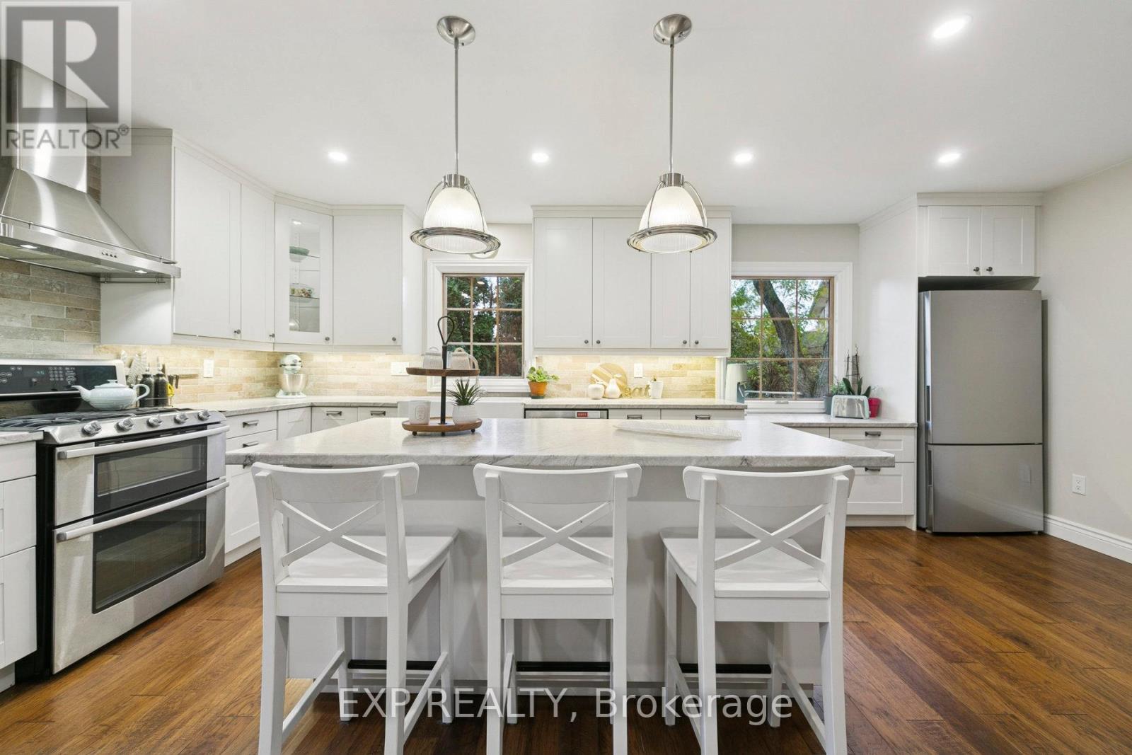 Beautifully updated home on a large corner lot in Erindale just steps from Huron Park & Erindale Park, offering bright open living spaces, 5 bedrooms, and a finished lower level with in-law potential, perfect for growing families or retirees seeking comfort and flexibility. The main floor features a sunken family room filled with natural light from a large bay window, creating a cozy and inviting space for gatherings. The updated custom kitchen was completely renovated with custom cabinetry, double oven, a gas corner fireplace, and high-end features including pot drawers, large island and undermount lighting. A bright dining area with a sun tunnel skylight and walkout to the side yard makes outdoor dining and summer BBQs effortless. Upstairs, the spacious primary bedroom includes double closet, a private 2-piece ensuite, and access to a shared 4-piece bathroom, while two additional bedrooms with hardwood flooring and large windows complete the upper level. The finished lower level offers two more bedrooms with above-grade windows, a comfortable family area with built-in shelving and wood stove, a flexible recreation space, and walk-up access to the backyard-perfect for guests or in-law suite potential. Outside, enjoy the peaceful wraparound yard with mature trees including apple tree & berry bushes, whimsical gardens, and a large concrete patio ideal for entertaining. Located in a mature, quiet community just steps from Huron Park, excellent schools, trails, recreation, and minutes from the Mississauga Hospital and major amenities. Recent updates include a kitchen renovation (2018), bathrooms (2020), and Pella windows. A wonderful opportunity to own a spacious, sun-filled home in one of Mississauga's most desirable mature family neighbourhoods. (id:4555)