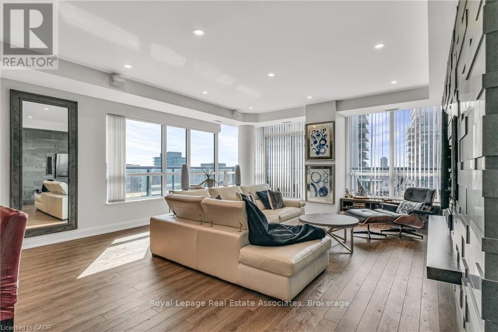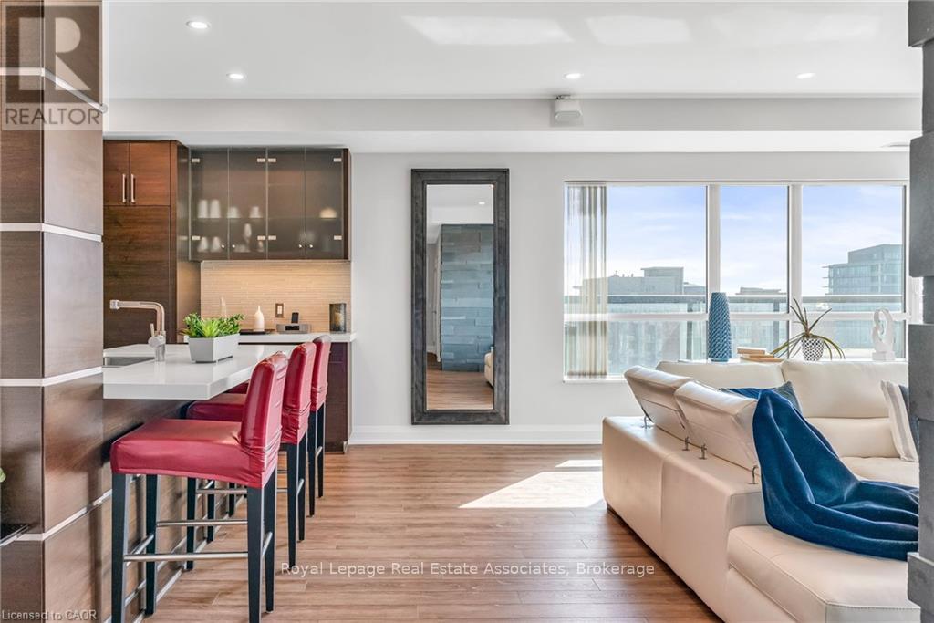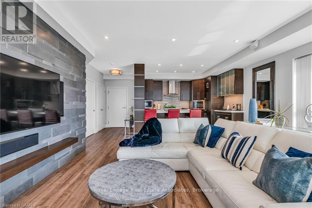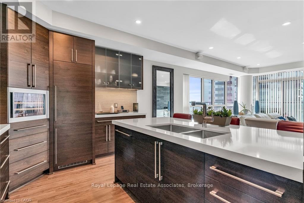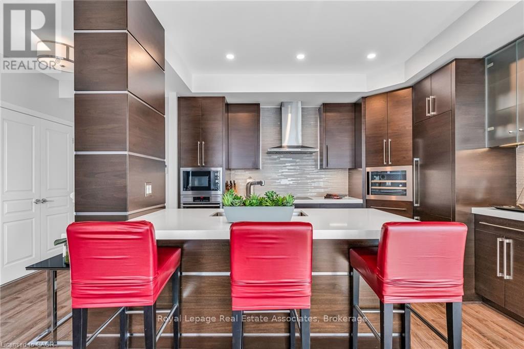 Suite 609 at 1 Hurontario is a fully renovated corner residence offering unobstructed south views of Lake Ontario, glowing westerly sunsets, and a rare wrap-around terrace that truly sets this suite apart. Floor-to-ceiling windows flood the home with natural light, while the open-concept layout is designed for effortless everyday living and entertaining. The modern chef-inspired kitchen features integrated AEG appliances, a wine fridge, sleek cabinetry, and clean contemporary finishes. Premium vinyl flooring flows through the main living space, with high-end laminate in both bedrooms for warmth and durability. The spacious primary suite is a private retreat, complete with a spa-like renovated ensuite, featuring a steam shower. The second bedroom offers exceptional flexibility with a custom queen-size Murphy bed, ideal for guests or a home office without compromise. Located in a well-managed, adult-friendly building just steps to the GO Train, waterfront trails, marinas, restaurants, and boutiques, this is Port Credit living at its finest - refined, walkable, and connected. Includes: Built-in AEG fridge, cooktop, wall oven, dishwasher, wine fridge, washer & dryer, 1 parking space, 1 locker. (id:4555)