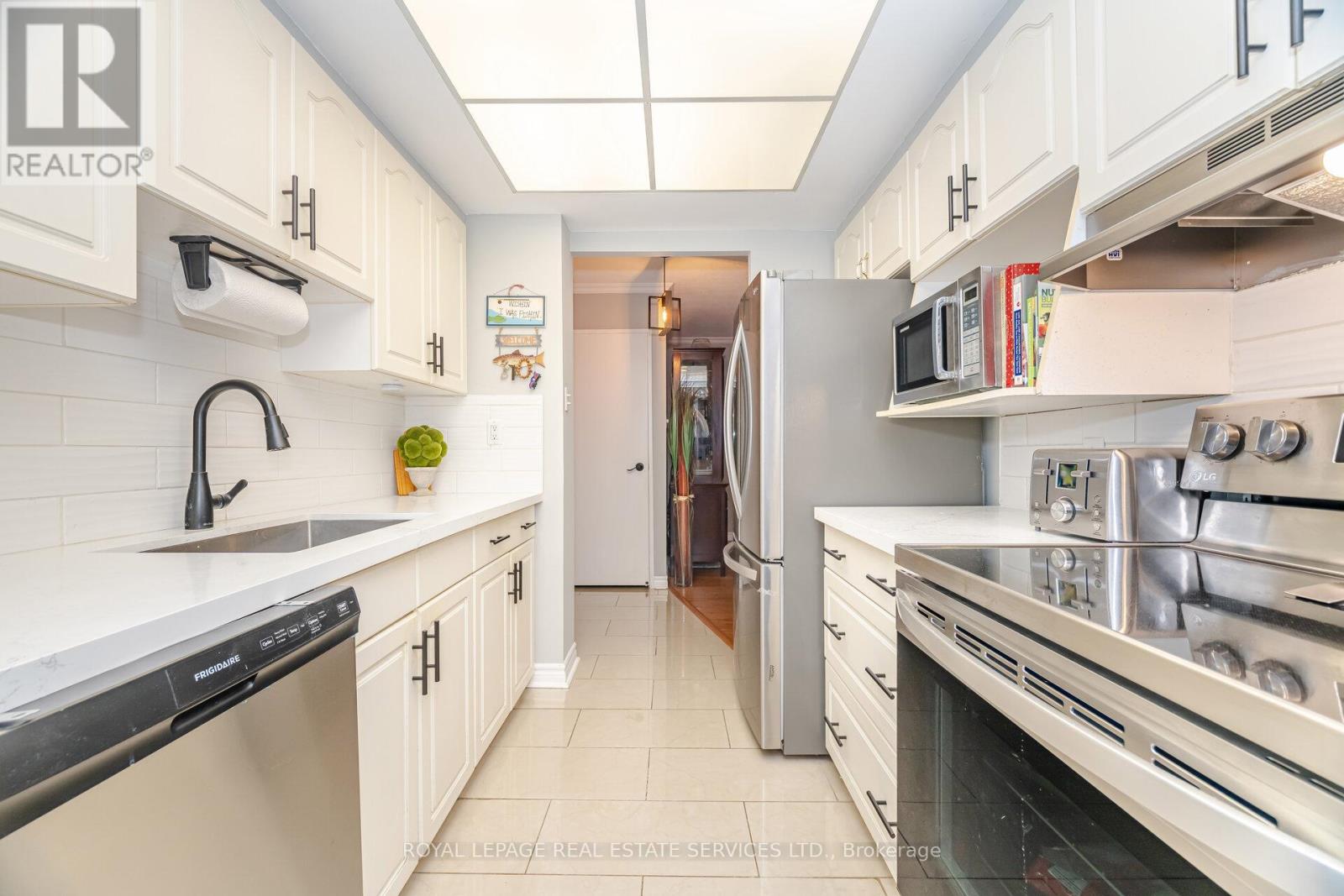 Discover this beautifully updated and spacious 2-bedroom plus den residence featuring two full 4-piece bathrooms and a modern kitchen complete with brand-new appliances, a custom countertop, and a stylish backsplash. The versatile den provides flexible space - ideal for a family room, home office, or additional bedroom. Elegant bamboo hardwood flooring flows throughout, adding warmth and sophistication. Ensuite laundry and an included locker offer everyday convenience. Nestled on a beautifully landscaped 4-acre property surrounded by a serene creek, this well managed, pet-free building provides all-inclusive utilities (including cable and internet) and an impressive range of amenities - walking trails, an outdoor pool, and tennis courts. Additional highlights include 2 coveted underground parking spaces. Relax on your private balcony while taking in peaceful park and city views, or retreat to the spacious primary bedroom featuring a walk-in closet and ensuite bath. Over the past decade, the building has undergone extensive renovations, including updates to the underground parking, access roads, cabana, lobby, hallways, elevators, balconies, and windows - ensuring both comfort and lasting value. Perfectly located near Cooksville GO Station, Square One, major highways, and the hospital, this stunning condo seamlessly blends modern style, convenience, and tranquility. (id:4555)