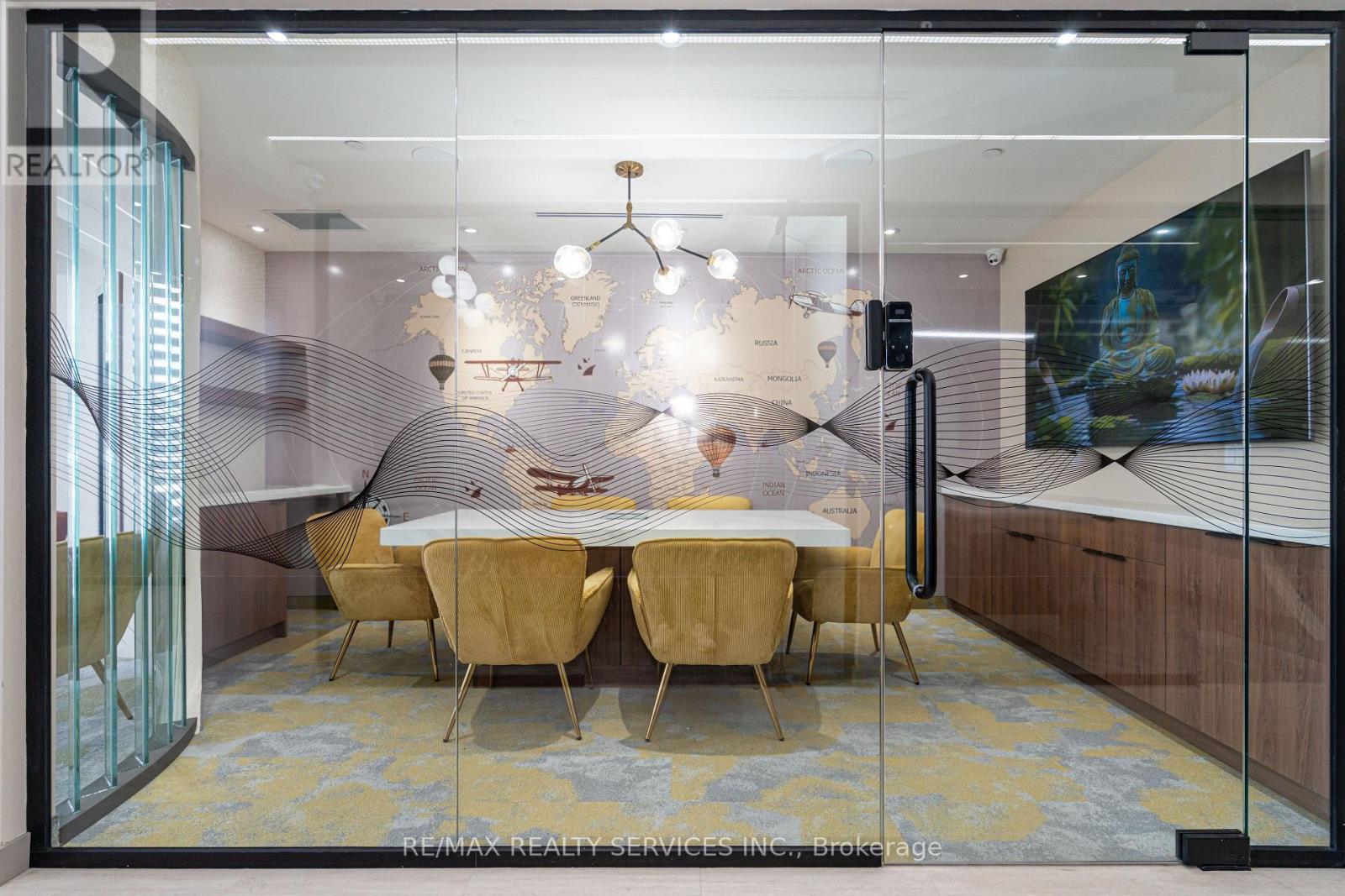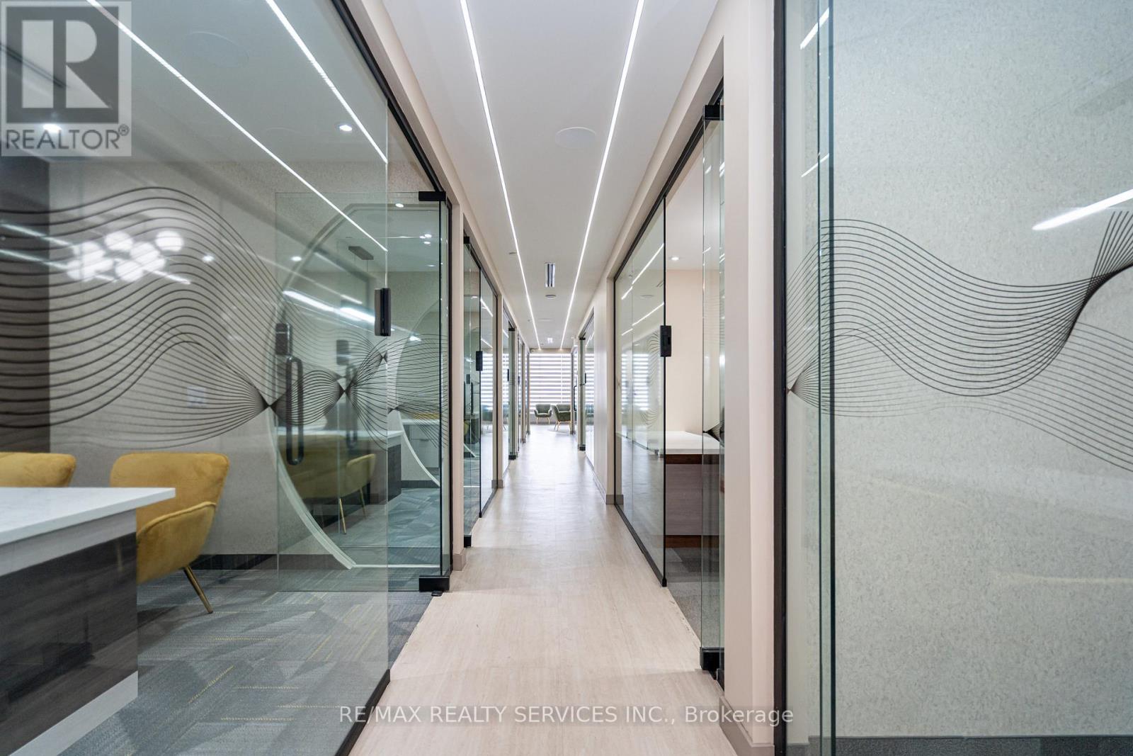 Presenting an exceptional commercial office space in a prime, high-traffic location offering outstanding visibility and exposure for your business. This meticulously designed, state-of-the-art office showcases top-of-the-line finishes, premium custom furniture, and a modern layout tailored for productivity and professionalism. Featuring 8 private office rooms, a spacious boardroom, and an expansive upper-level meeting and collaboration area, the space imperfectly suited for growing teams and client-facing operations. A grand reception area with an elegant waiting lounge creates a strong first impression for visitors and clients alike. The unit is thoughtfully equipped with 3 well-appointed washrooms, a functional eat-in kitchen for staff convenience, and dual access including a rear entrance for added flexibility and ease of operations. Every office room is secured with digital locks and monitored by a comprehensive CCTV system, ensuring safety and peace of mind. A fully integrated central Sonos audio system enhances the ambiance throughout the workspace. With ample on-site parking, seamless connectivity to major highways, and prominent signage opportunities to elevate your brand presence, this location offers both convenience and visibility. Ideal for professional uses such as real estate, insurance, mortgage brokerages, legal practices, consulting firms, and other corporate offices, this turnkey space is designed to impress, support business growth, and provide a sophisticated environment for both staff and clients (id:4555)