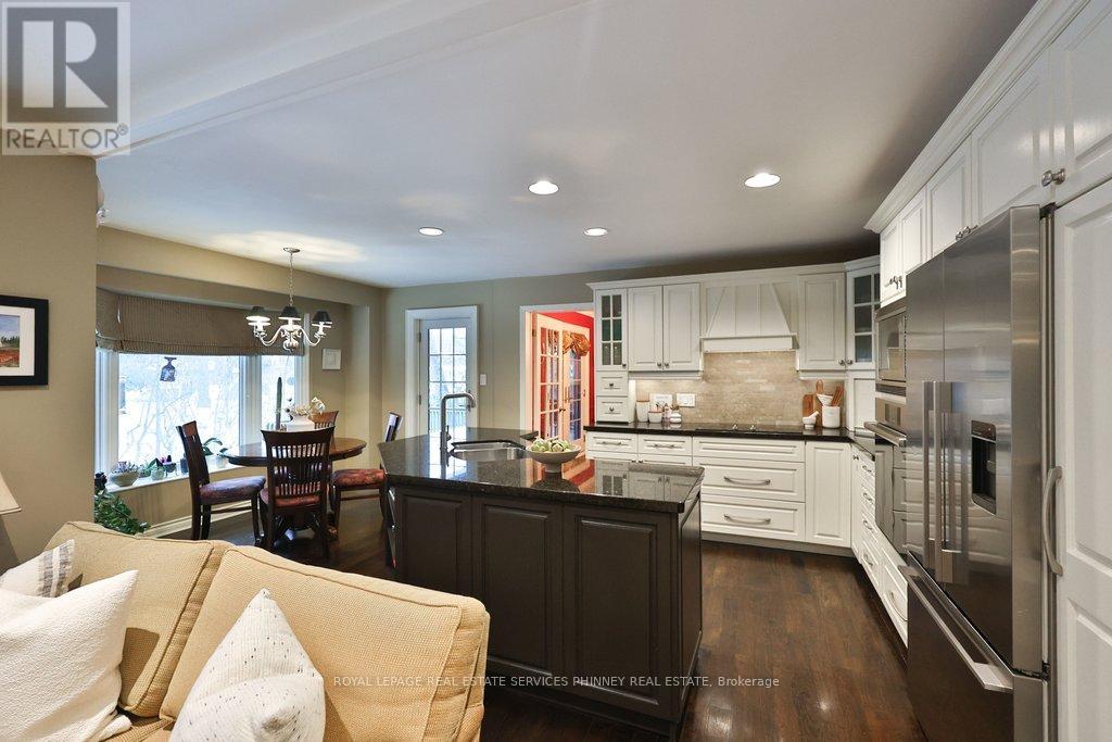 Experience the charm of this exquisite two-story family home, nestled on a private court and backing onto a tranquil ravine setting. Upon entering, you're welcomed by a grand foyer featuring an enchanting winding staircase. The spacious open-concept family room boasts large windows that offer spectacular views of the ravine, creating a serene atmosphere. The kitchen is a chef's dream, equipped with top-of-the-line appliances, a generous island, and a roomy eat-in area that seamlessly connects to a large back patio, perfect for outdoor entertaining. A separate living room flows effortlessly into the formal dining room, which also grants direct access to the yard, enhancing the ease of hosting gatherings. The main floor office provides an ideal space for remote work. Primary bedroom offers ample space for a cozy lounge area, balcony overlooking ravine and includes a luxurious six-piece bathroom. Upstairs, you'll also find two additional bedrooms and another bathroom, ensuring comfort for family and guests alike. The lower level features an additional bedroom and a three-piece bath, perfect for visitors. A large recreation room, complete with a wet bar and access to the yard, makes summer functions a breeze. Situated in a great school district and just steps away from all amenities, this home is also conveniently close to the GO station and the picturesque Jack Darling Park and lake. EXTRAS- outside storage with loft and two fireplaces. (id:4555)