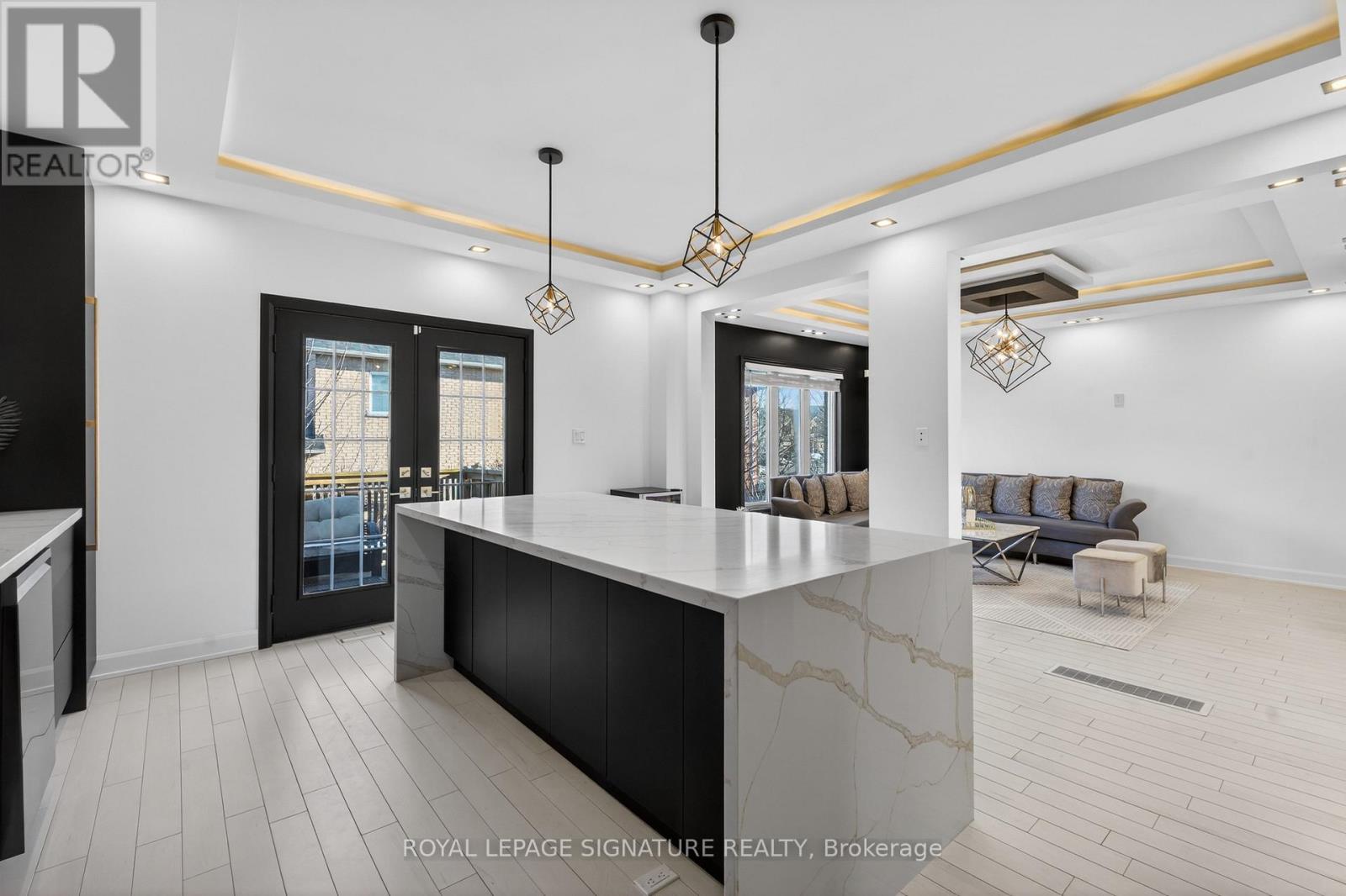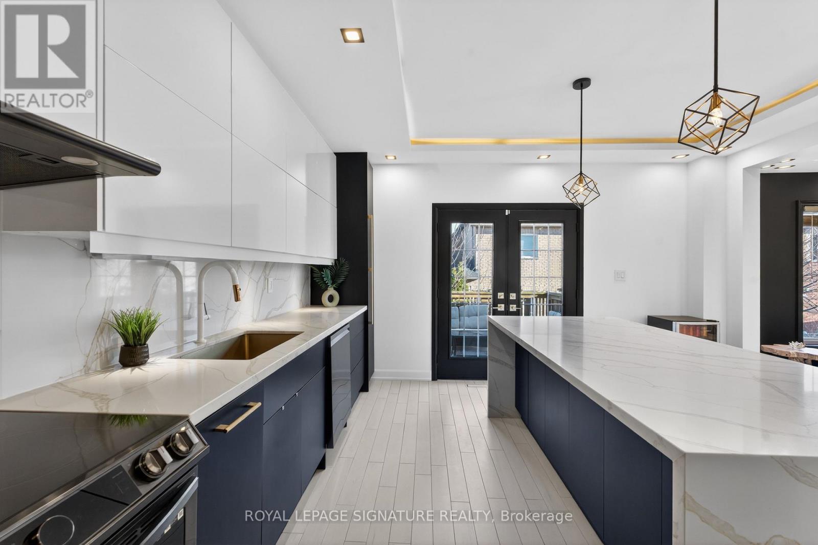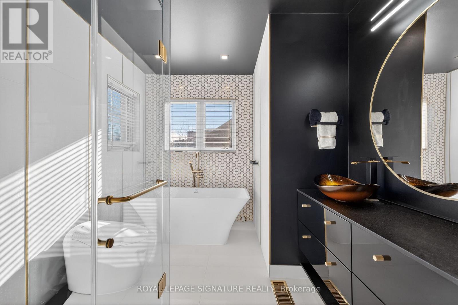 Completely reimagined and meticulously renovated to the highest standards, this exceptional two-storey home stands apart with premium finishes and striking design throughout. A stunning brick and stone façade and lifetime metal roof create impressive curb appeal. Inside, custom engineered hardwood flooring flows throughout the open concept main floor, complemented by multi-tiered tray ceilings with integrated cove LED lighting creating a warm and luxurious ambiance. A stunning two-way fireplace elegantly separates the dining room from the family room. The designer kitchen is a true showpiece, featuring custom cabinetry, a spectacular waterfall centre island, and quartz countertops with a seamless quartz backsplash. The breathtaking living room offers majestic 14-ft ceilings, massive windows, and a custom floor-to-ceiling feature with a sleek, modern fireplace. Ascending to the second floor, you'll be impressed by the striking quartz staircase with offset glass railings, an architectural feature that adds a modern gallery-like feel. The primary retreat is a private sanctuary, complete with wall-to-wall custom closets with built-in organizers and a spa-inspired ensuite featuring a freestanding soaking tub, smart toilet, custom vanity, and curbless glass shower. Three additional spacious bedrooms offer large windows and ample closet space, complemented by a stylish shared bath with quartz vanity, and curbless glass shower. The basement continues the home's theme of refined luxury with a bright, main-floor feel thanks to large windows and walk-out to the backyard patio! This level features a spacious rec room with a sleek fireplace, a second full kitchen with quartz counters, a full bathroom with a standing shower with body spray system, and one large bedroom-ideal for extended living or potential rental income. The main floor also offers direct access to the garage and a spacious laundry room, perfectly designed to function as a practical mudroom. (id:4555)