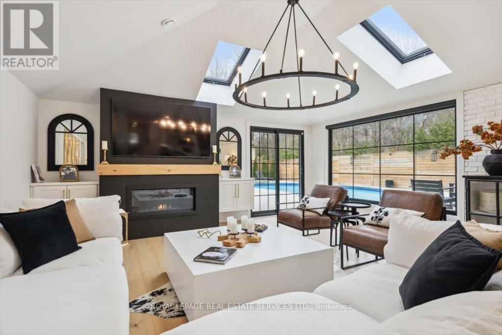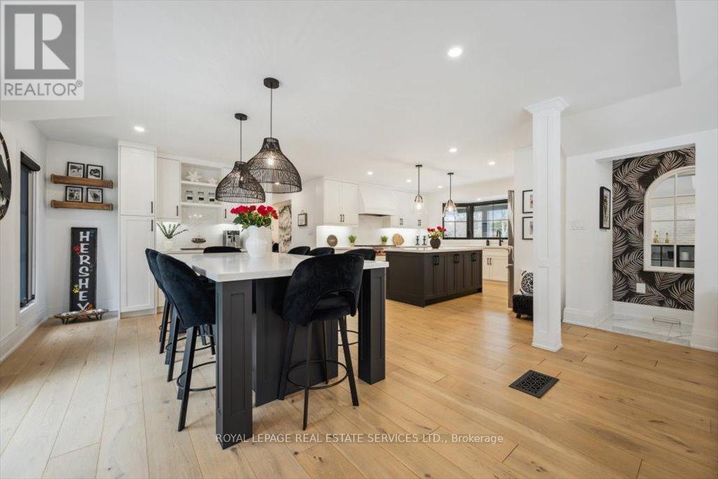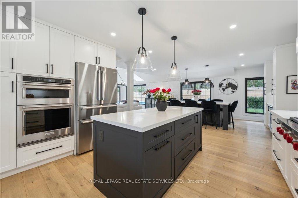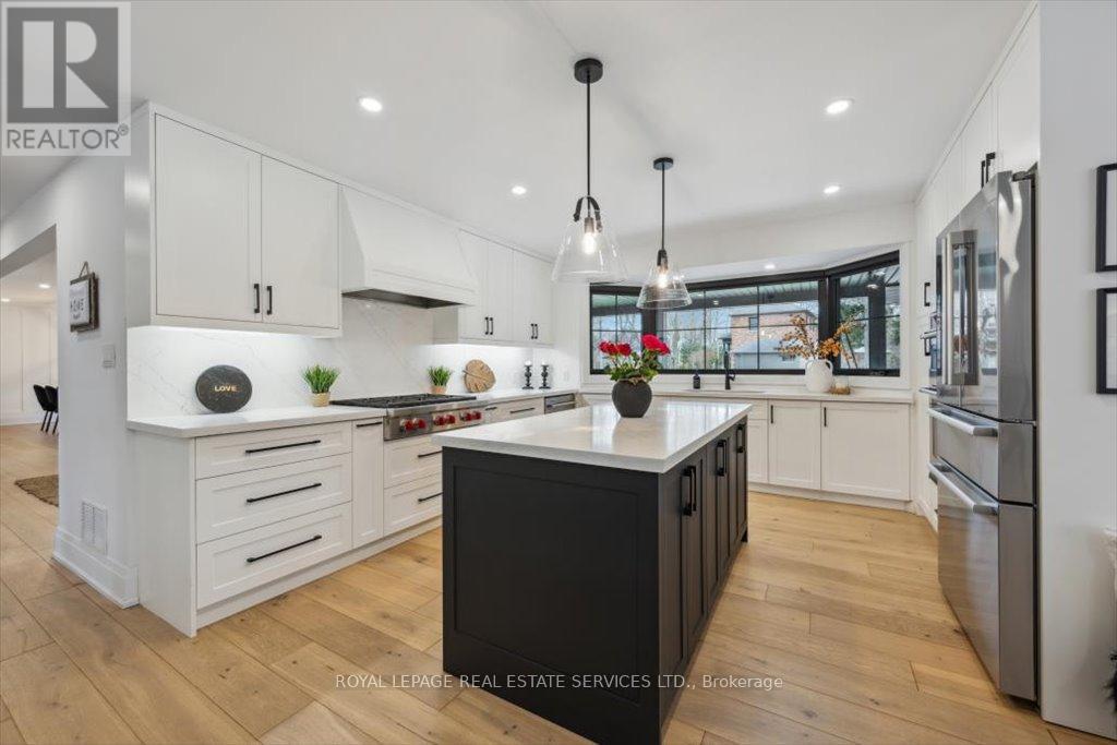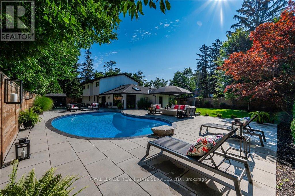 Absolutely gorgeous Modern farmhouse Masterpiece in the heart of Mineola! This charming fully renovated 5 bed 4 bath home nestled on a prestigious 90 x 200 mature lot on a quiet street offers everything you desire. A charming front porch provides for great curb appeal. Enter through the front door into a spacious foyer with custom built in closets & ship lap feature wall. Enjoy entertaining in the expansive sun-filled main level featuring a MAIN FLOOR PRIMARY bedroom with a spa inspired ensuite. Wide plank engineered naked white oak flooring flows throughout, a breathtaking chef's kitchen with custom cabinetry, Wolf 6 burner range, high end stainless steel appliances, quartz counter tops and backsplash, a large prep island and a second island dining table with barstool seating. The kitchen is open to a stunning family room with vaulted ceilings and vented skylights , gas fireplace with floor to ceiling porcelain surround and custom built-ins. Walkout from both kitchen and family room to unwind in a spectacular private, professionally landscaped resort style backyard oasis featuring a concrete salt water pool, large paver patio, fire pit area and lush perennial gardens. Take the solid oak, open riser staircase to the second floor where hardwood flooring continues through 4spacious bedrooms. Bedrooms 2 & 3 feature vaulted ceilings and feature walls. A gorgeous 4piece bath with a custom glass shower completes the second level. The fully finished lower level is designed for comfort and functionality offering a comfy rec room with ship lap feature wall and built-in electric fireplace, wide plank premium vinyl flooring, 3 piece bath, laundry room with custom cabinetry, & a sauna. This extraordinary home blends thoughtful design with top-tier finishes, all in one of Mississauga's most sought-after neighbourhoods. This is more than just a house, it's a meticulously maintained retreat, pride of ownership is obvious. Don't miss the opportunity to make it yours! (id:4555)