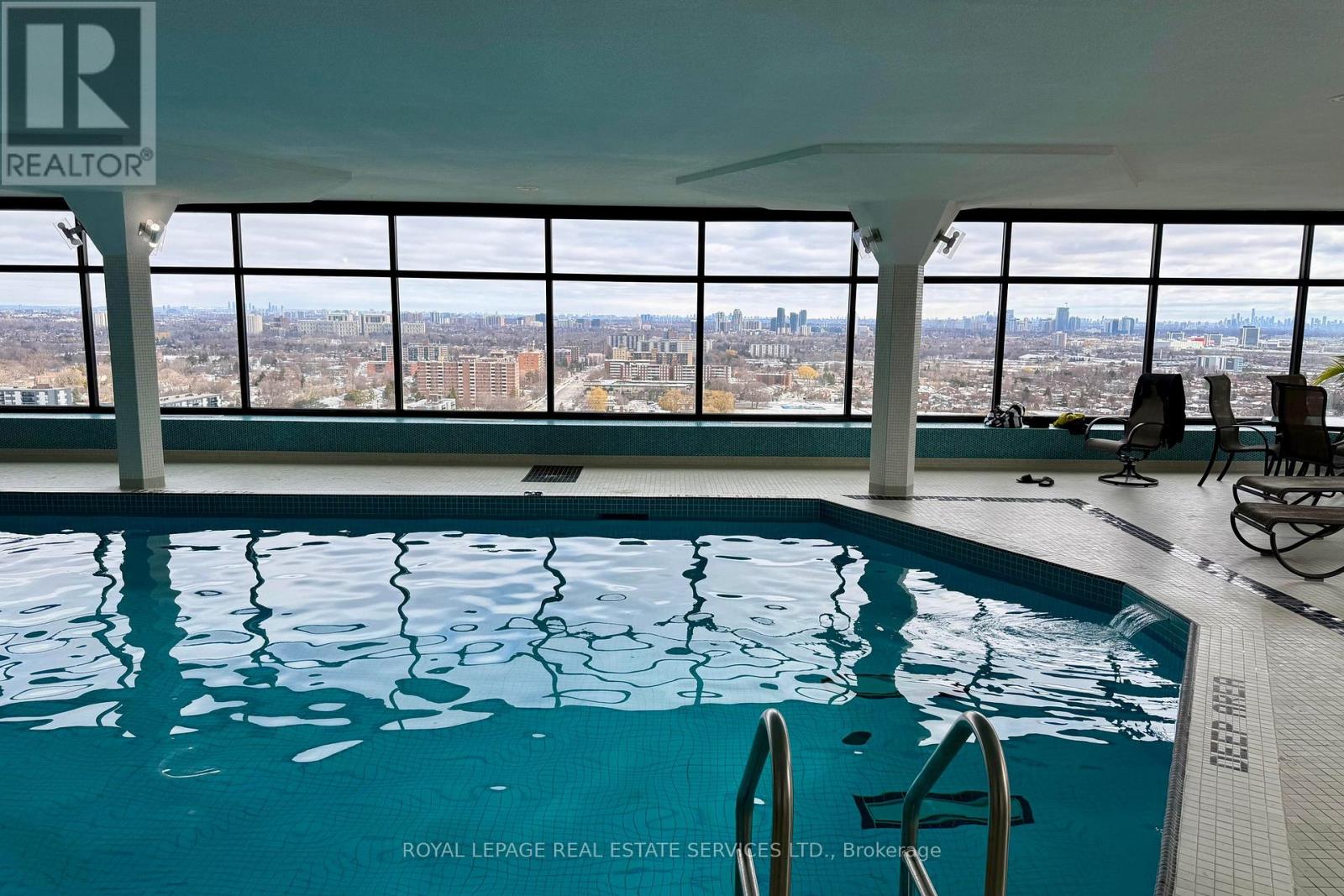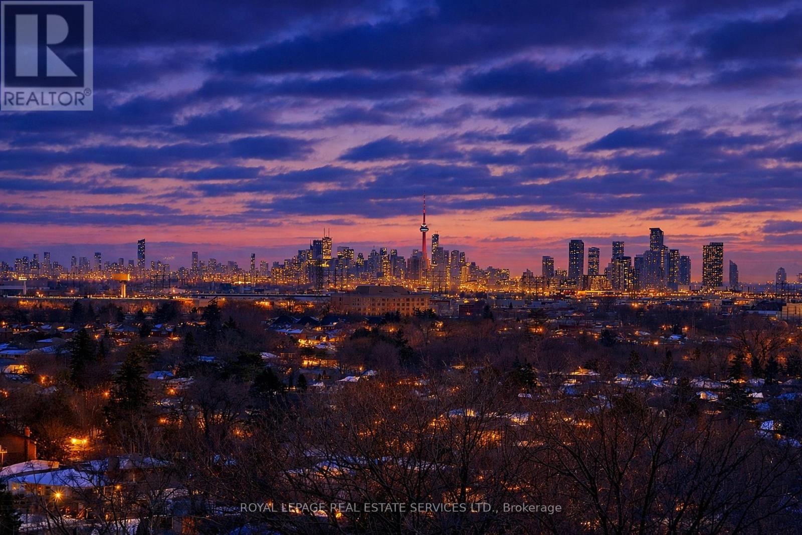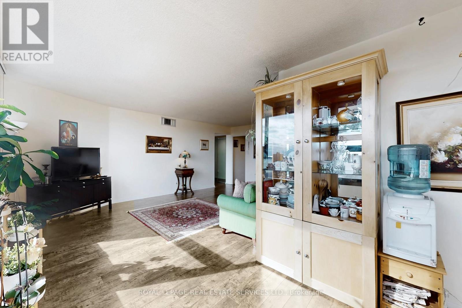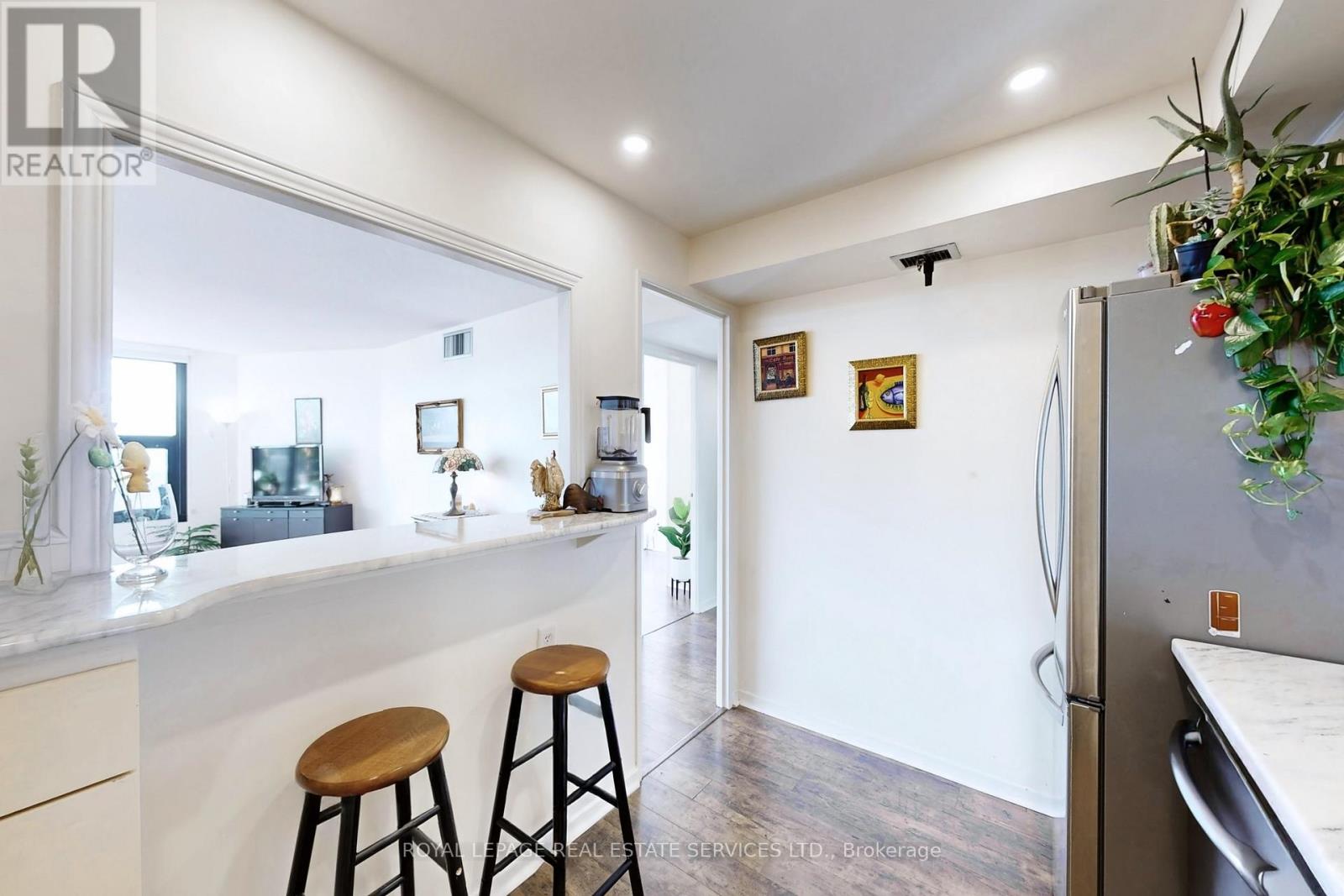 Welcome to your move-in ready, sun-drenched urban sanctuary featuring breathtaking panoramic views of the Toronto skyline. This turnkey, carpet-free home boasts premium laminate flooring throughout, providing a sleek and modern aesthetic that is as durable as it is stylish. The open-concept living area is designed for seamless entertaining and flows beautifully into the kitchen, which features a convenient breakfast bar for casual dining. While the updated washroom offers contemporary finishes, large windows in every other room flood the living spaces with natural light. Adding to the property's incredible value, this unit comes complete with one dedicated parking space and a storage locker. Experience ultimate peace of mind with an all-inclusive lifestyle, as the maintenance fees cover your heat, hydro, and water, along with unlimited Bell Fibe internet. Residents also enjoy an incredible suite of amenities including a 24-hour concierge, a rooftop deck, an indoor car wash with a car vacuum and tire inflator, a general convenience store, a pickleball court, shuffleboard, a billiard room, and even a woodworking shop. Whether you are watching the city lights at night or enjoying the airy flow of the interior during the day, this unit offers the perfect blend of sophisticated design and effortless convenience in the heart of the city. (id:4555)