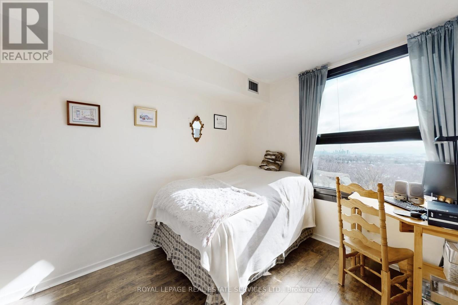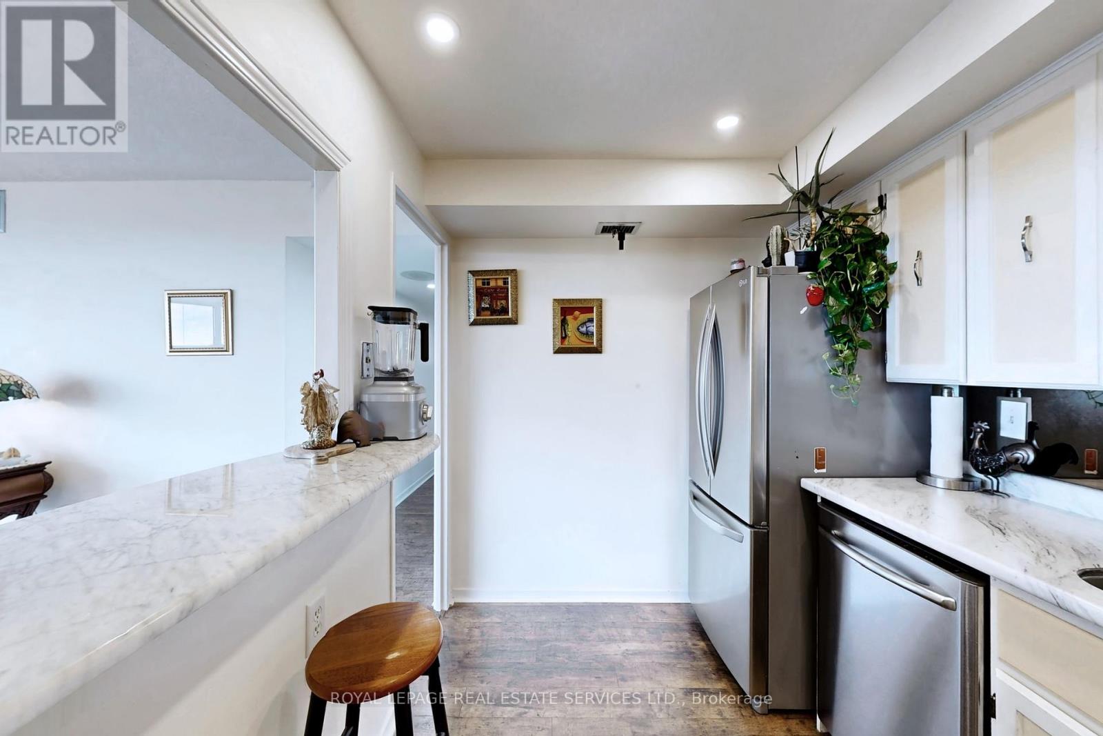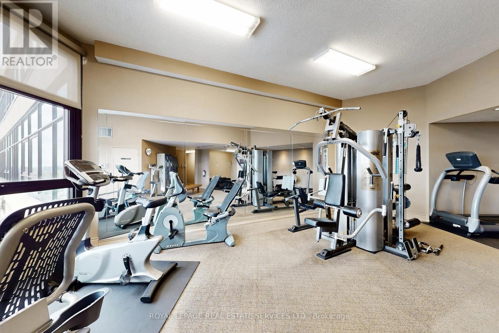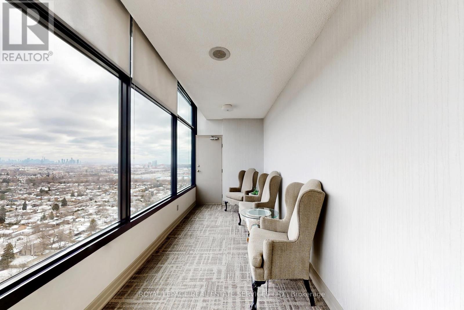Welcome to your move-in ready, sun-drenched urban sanctuary featuring breathtaking panoramic views of the Toronto skyline. This turnkey, carpet-free home boasts premium laminate flooring throughout, providing a sleek and modern aesthetic that is as durable as it is stylish. The open-concept living area is designed for seamless entertaining and flows beautifully into the kitchen, which features a convenient breakfast bar for casual dining. While the updated washroom offers contemporary finishes, large windows in every other room flood the living spaces with natural light. Adding to the property's incredible value, this unit comes complete with one dedicated parking space and a storage locker. Experience ultimate peace of mind with an all-inclusive lifestyle, as the maintenance fees cover your heat, hydro, and water, along with unlimited Bell Fibe internet. Residents also enjoy an incredible suite of amenities including a 24-hour concierge, a rooftop deck, an indoor car wash with a car vacuum and tire inflator, a general convenience store, a pickleball court, shuffleboard, a billiard room, and even a woodworking shop. Whether you are watching the city lights at night or enjoying the airy flow of the interior during the day, this unit offers the perfect blend of sophisticated design and effortless convenience in the heart of the city. (id:4555)