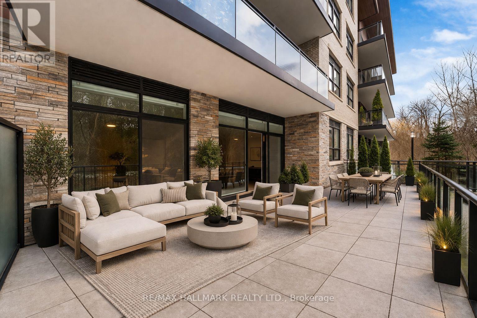 Love Where You Live! Located in the highly sought-after Craftsman Condos in vibrant Clarkson Village, this luxurious ground-floor suite offers over 1,200 sq ft of upgraded living space, complemented by an impressive 466 sqft private terrace overlooking serene Birchwood Park. Thoughtfully designed with timeless finishes, this home features engineered hardwood flooring, remote-control roller shades on all windows, and pot lights throughout. The entertainer's floor plan centres around a stunning open concept gourmet kitchen, complete with premium appliances, two-tone soft-close cabinetry, and a large island with breakfast bar, perfect for casual meals or gathering with friends and family. Your spacious living room features a custom built-in media centre with ample storage and a walk-out to your private terrace, perfect for enjoying your morning coffee or hosting al fresco dinners surrounded by greenery. A generous open-concept den offers exceptional flexibility, easily accommodating a full-sized dining area, home office, or reading nook. Designed with privacy in mind, the split-bedroom layout is ideal for comfortable living. The primary suite features a spa-inspired 5-piece ensuite with a soaker tub, separate shower, walk-through dressing hall featuring large his and hers closets with frameless mirrored doors, and direct access to the terrace. The second bedroom is equally inviting, complete with its own walk-in closet. Perfectly positioned within the building, this unit offers convenient access to the concierge, mailroom, your owned locker, and elevator to parking with EV charger. Enjoy an active, nature-filled lifestyle steps from Birchwood Park and minutes to the waterfront trails of Jack Darling Memorial Park and Rattray Marsh Conservation Area. Nestled in the heart of Clarkson Village, you're surrounded by charming local shops, cafes, and restaurants. Commuters will appreciate the easy access to Clarkson GO Station and major highways, making commuting a breeze. (id:4555)